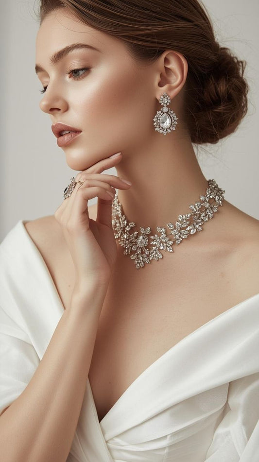 Tags: #BridalJewelry #WeddingSet #DiamondSimulants #RhodiumPlated #StatementNecklace #GalaReady #LuxuryJewelry #ShopNow