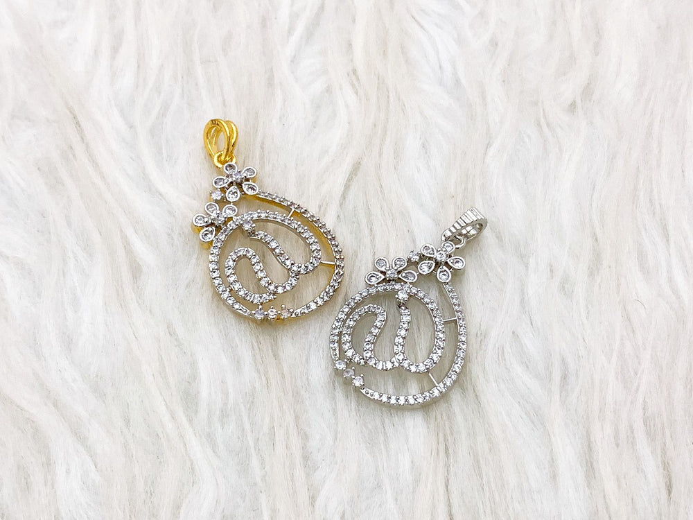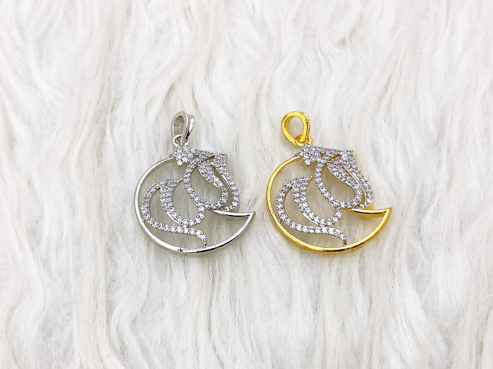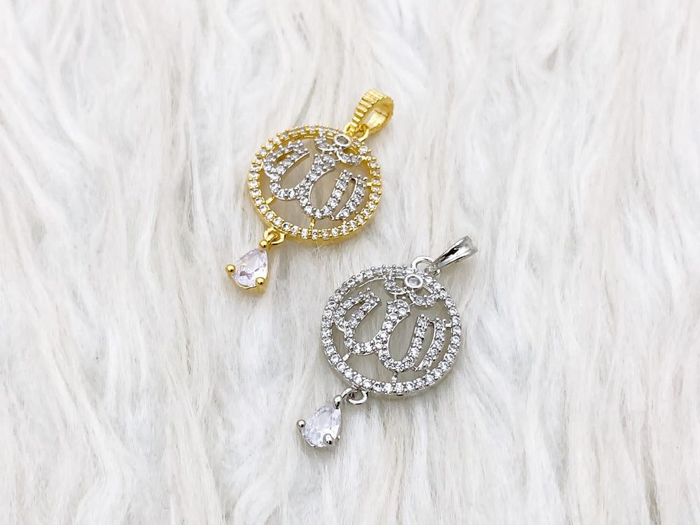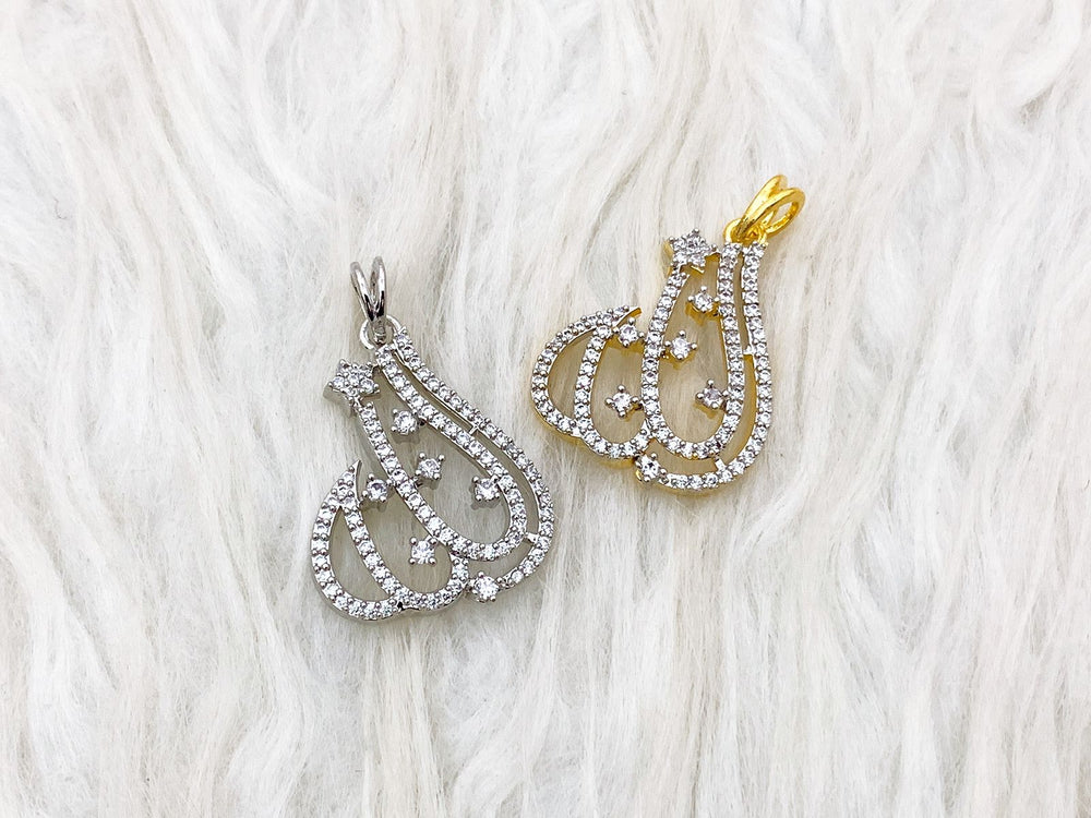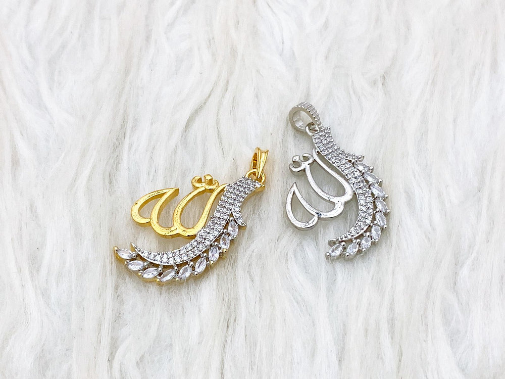 The jewelry piece showcases the name "Allah" in an elegant and artistic Arabic script. It is meticulously crafted to highlight spiritual and aesthetic beauty.