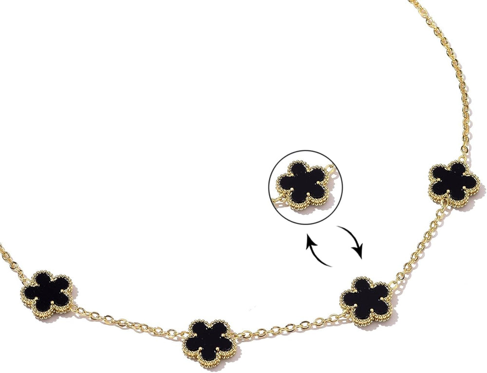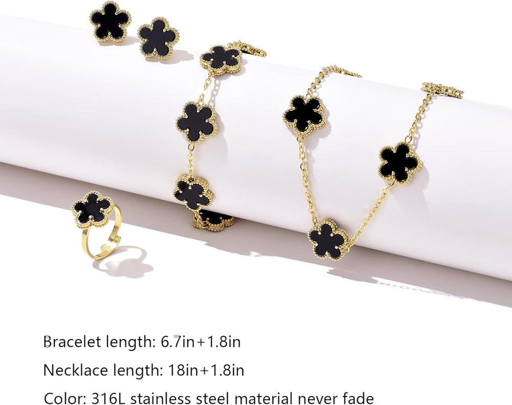 This elegant 3-piece jewelry set features a matching necklace, bracelet, and stud earrings with classic black four-leaf clover motifs. Designed with a gold-tone finish, the set offers a refined and timeless look suitable for both everyday wear and special occasions. The clover design represents luck and elegance, making it a perfect choice for women and girls. A stylish and thoughtful gift option that adds a touch of sophistication to any outfit.
