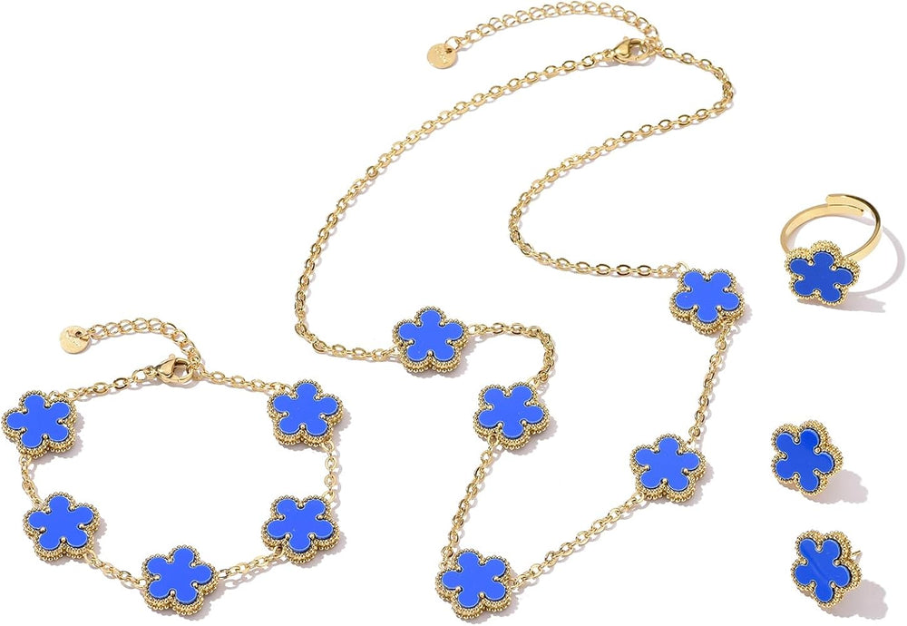 This elegant 3-piece jewelry set includes a matching necklace, bracelet, and stud earrings featuring classic blue four-leaf clover motifs with a gold-tone finish. The rich blue color adds a calm and luxurious touch, while the clover design represents luck and timeless style. Perfect for daily wear or special occasions, this set is designed for women and girls who prefer classy and coordinated jewelry. An ideal gift choice that complements both casual and formal outfits.