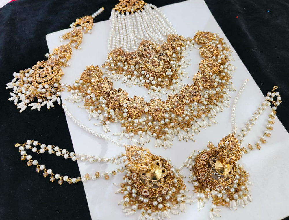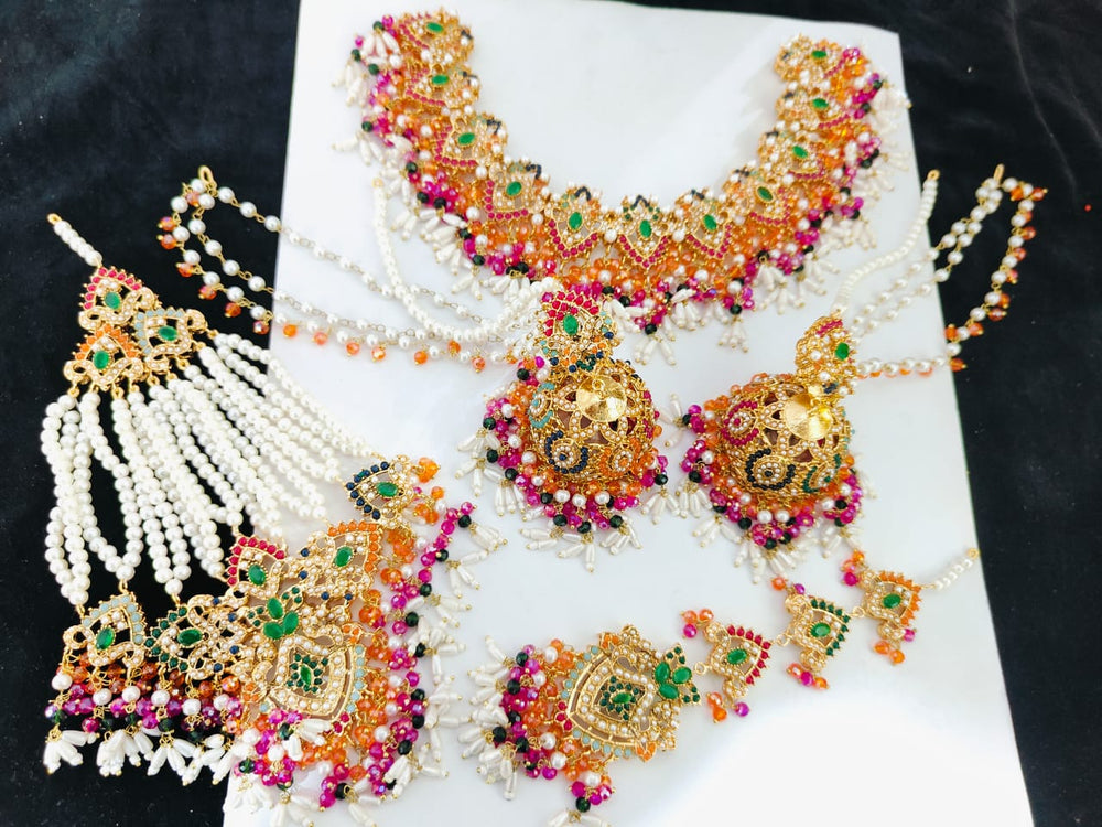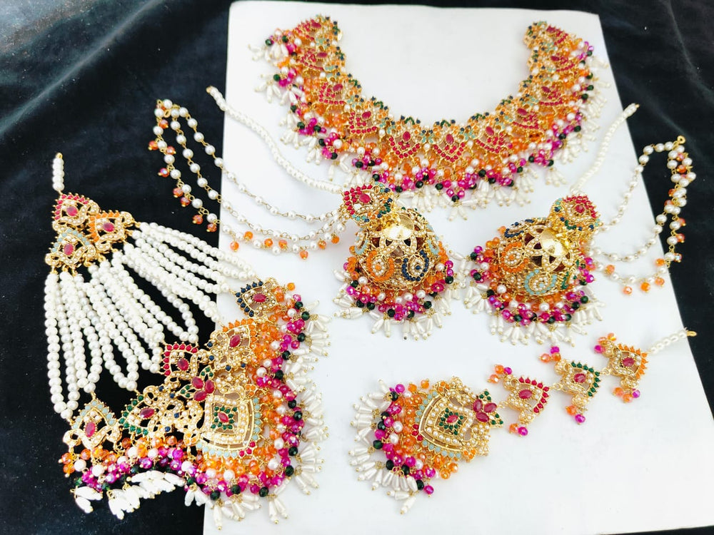 The Norantan Bridal Set is a stunning representation of timeless craftsmanship and elegance, perfect for your special day. Made with fine quality materials, this set typically includes an intricately designed necklace, matching earrings, bangles, and a maang tikka or headpiece, capturing the essence of traditional artistry.