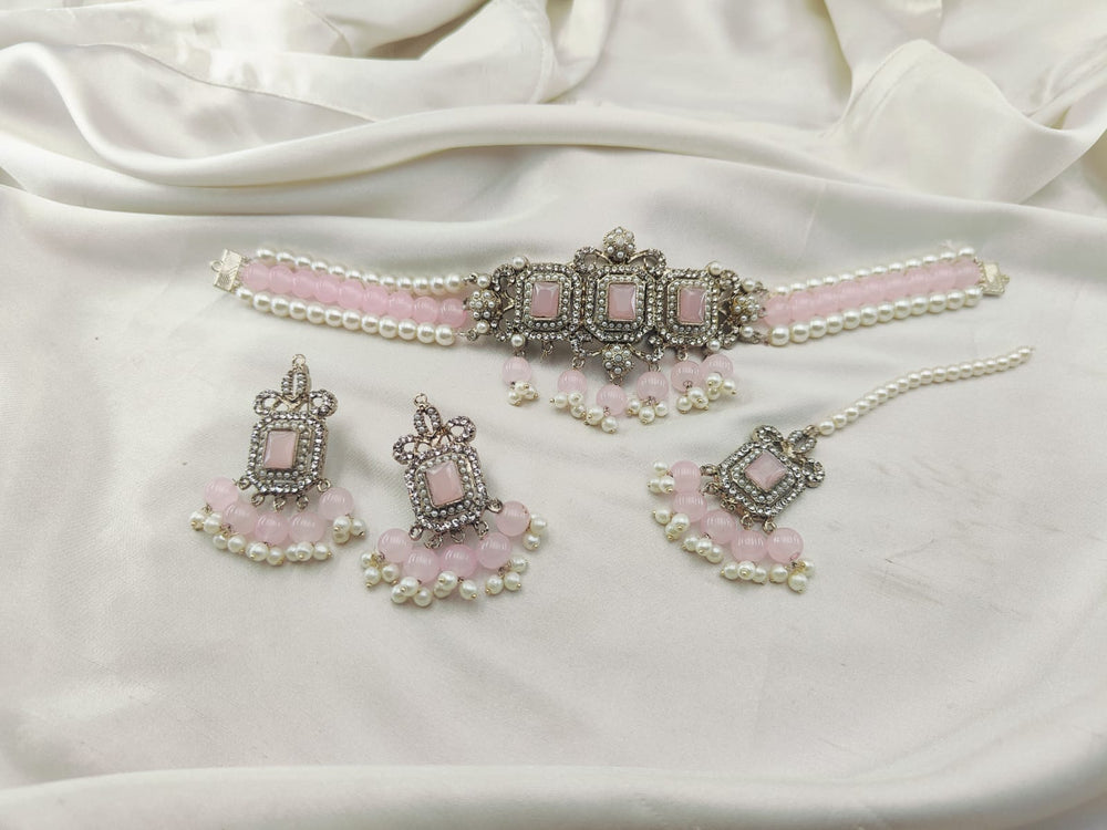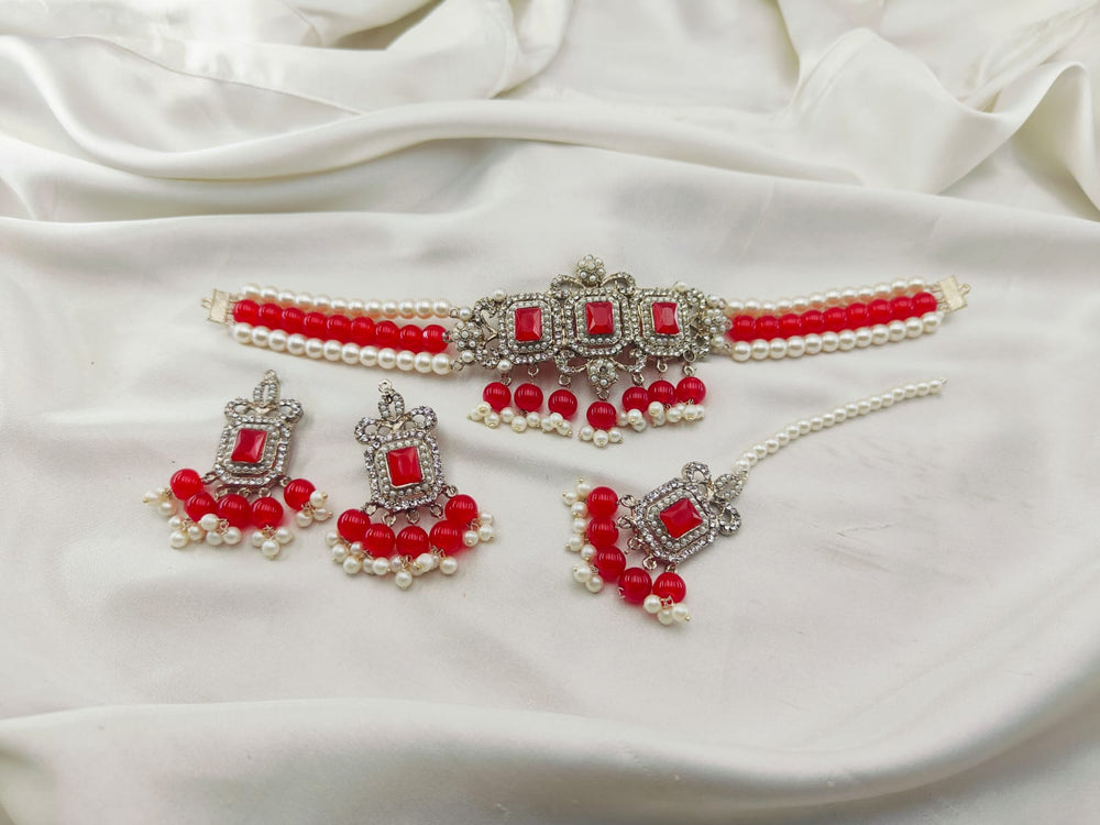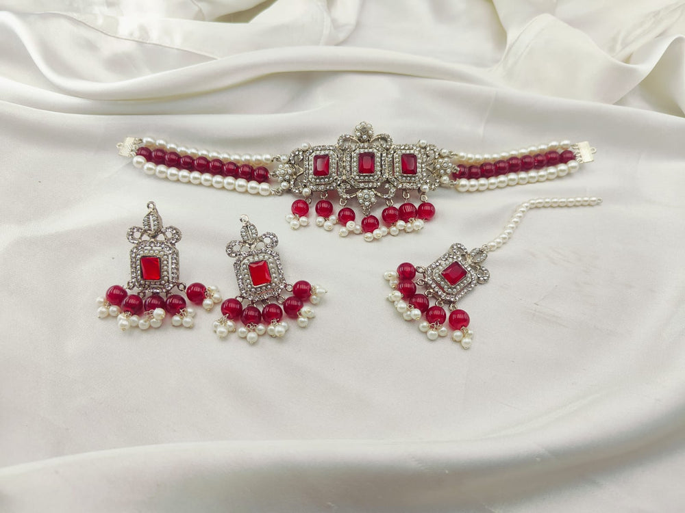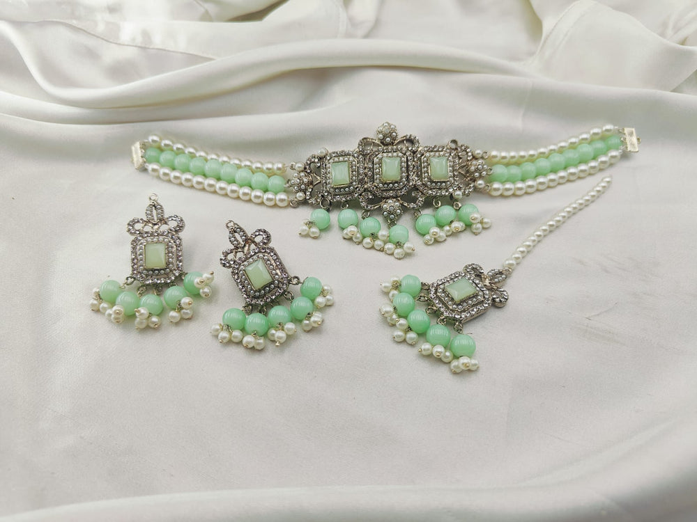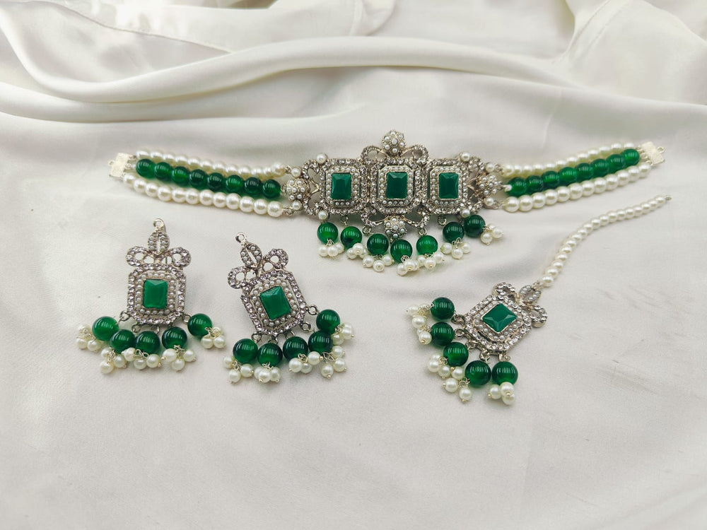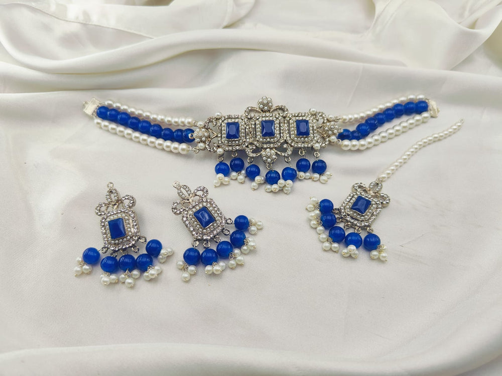 Chokar set silver base jewelry typically consists of an elegant necklace with a close-fitting design that encircles the neck, often paired with matching earrings or other accessories like maang tikka. Here’s a general description: