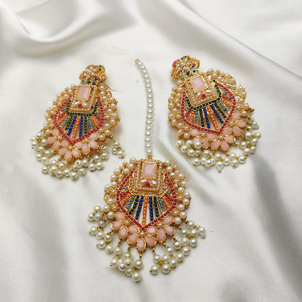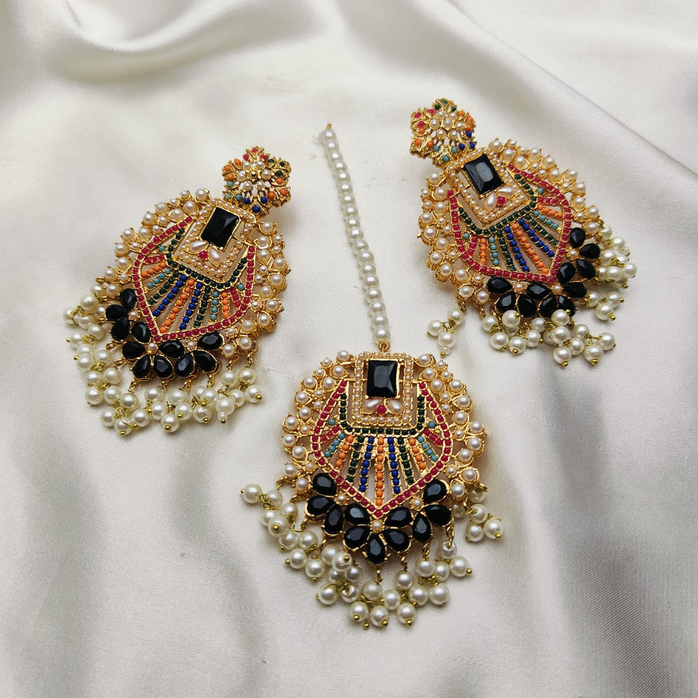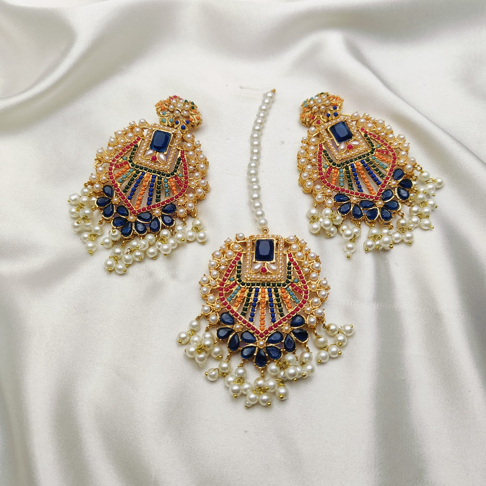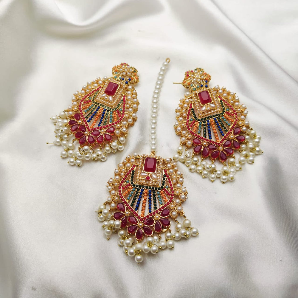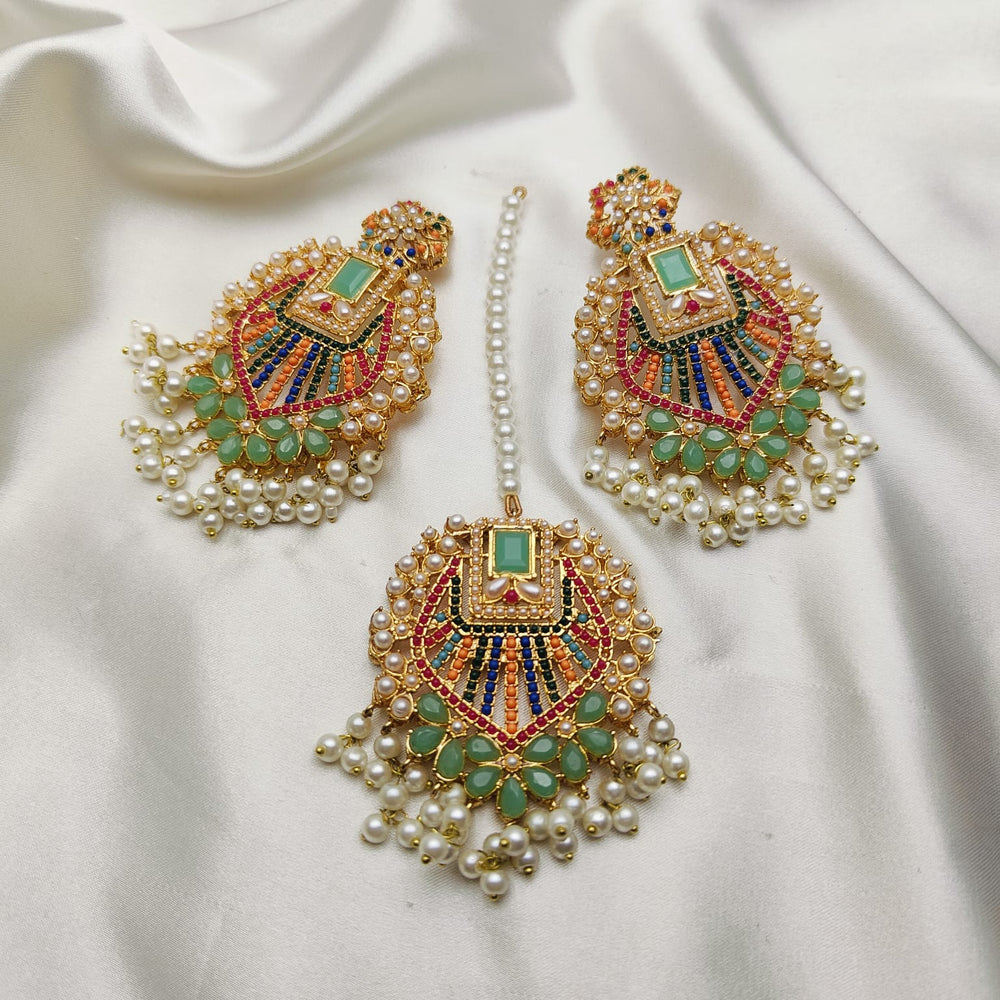 The matching earrings are a perfect complement, featuring drop or chandelier styles that echo the tika's motif. They are crafted with the same gemstones and metalwork, offering a cohesive look. The earrings often include a combination of studded elements and dangling beads or pearls, adding a touch of movement and glamour.