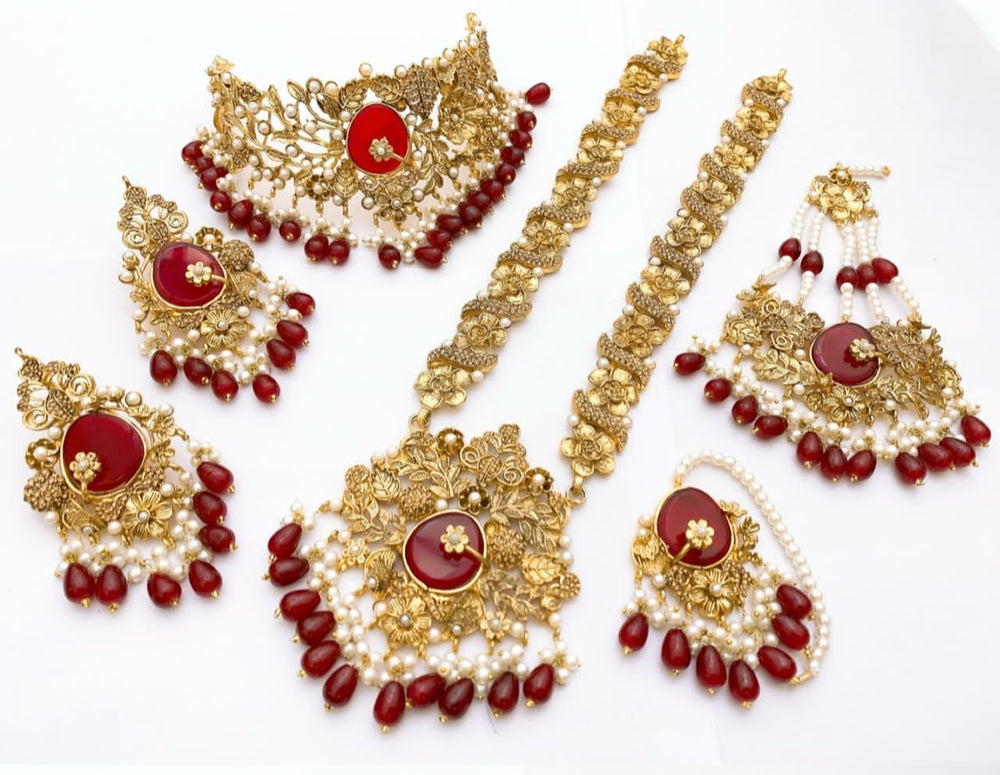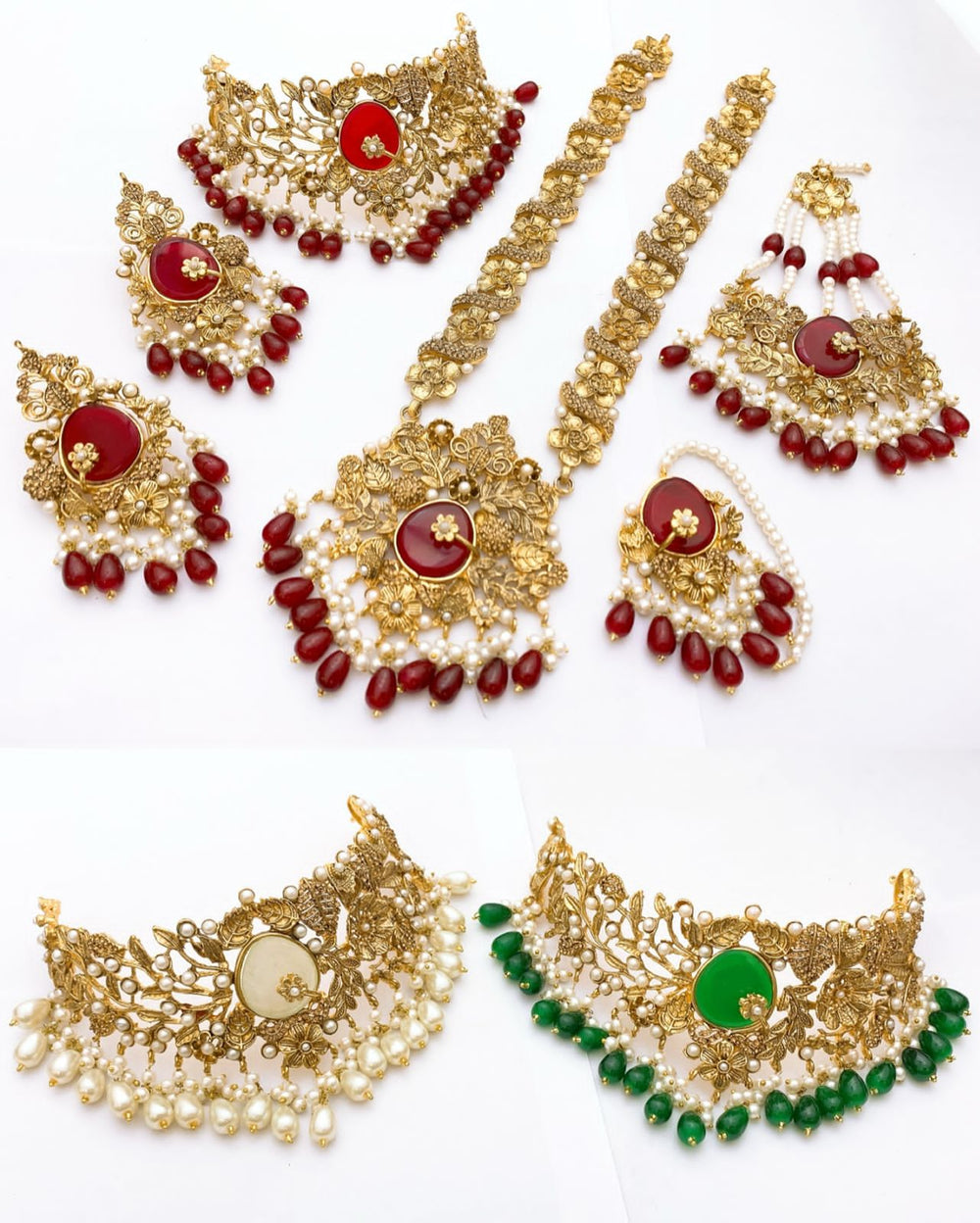 Earrings: Dangling earrings with a combination of teardrop or pyramid shapes, embellished with matching gemstones and gold filigree work. The earrings may also feature small chain details for added elegance.
