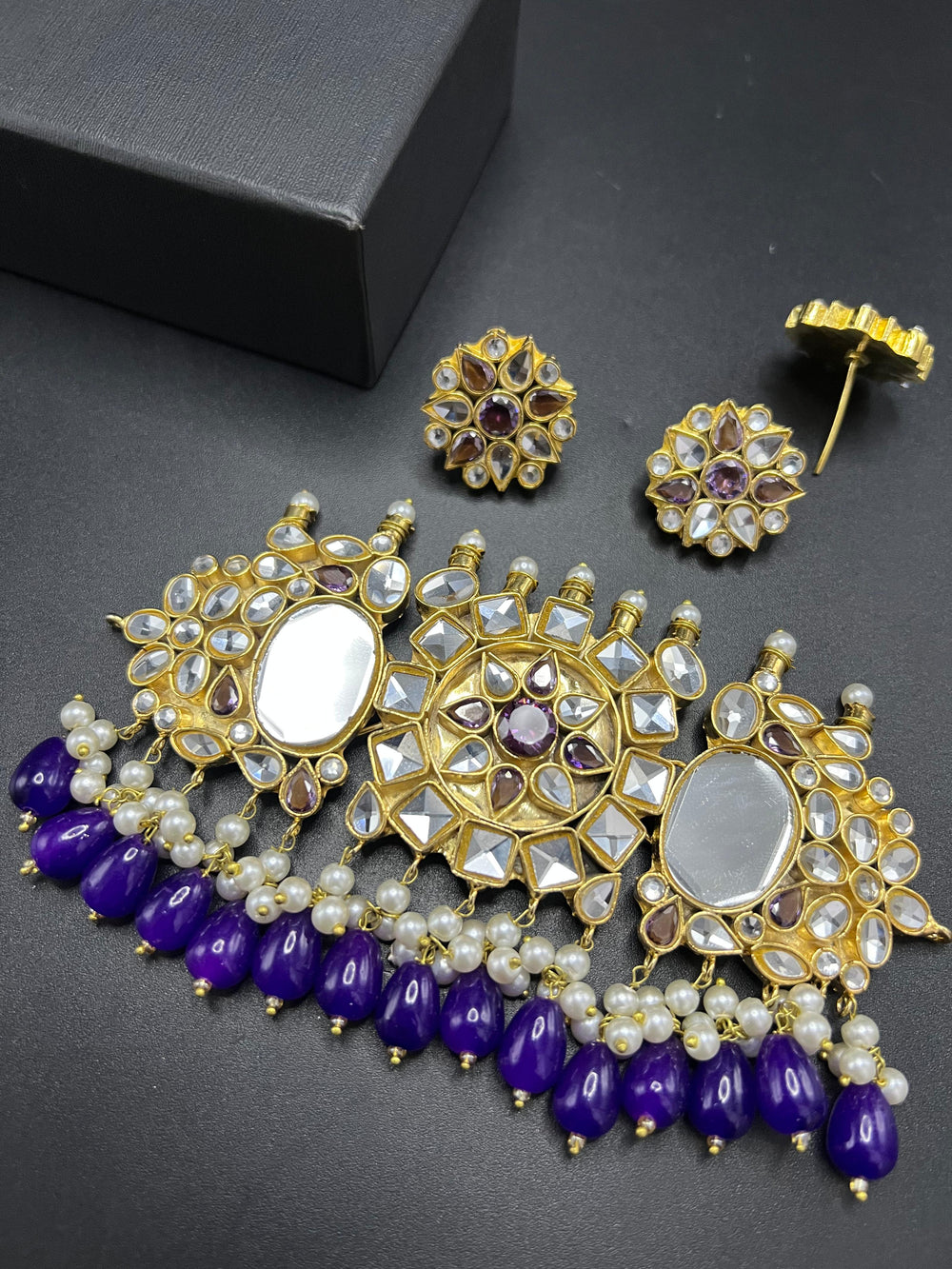 Artistry: A heavy bridal choker featuring large, central glass mirrors surrounded by intricate Kundan-set geometric and floral patterns.