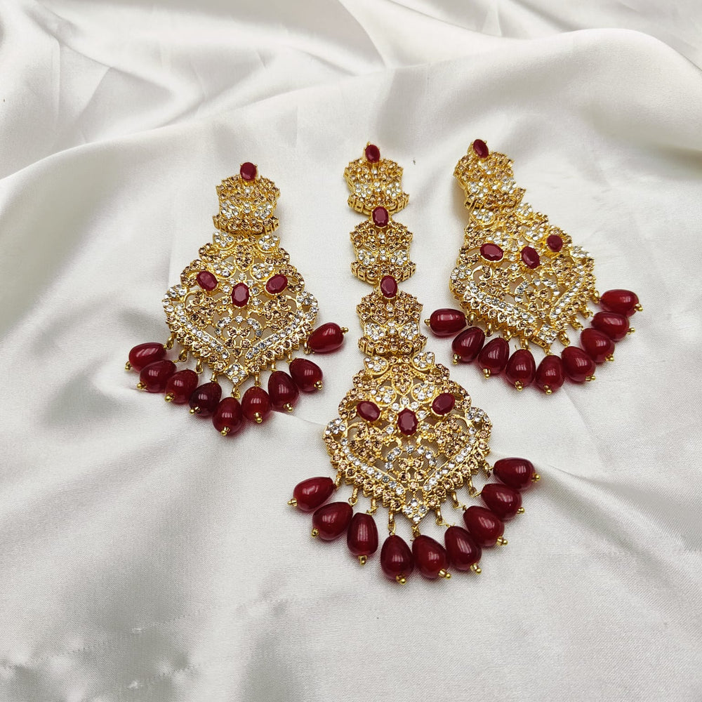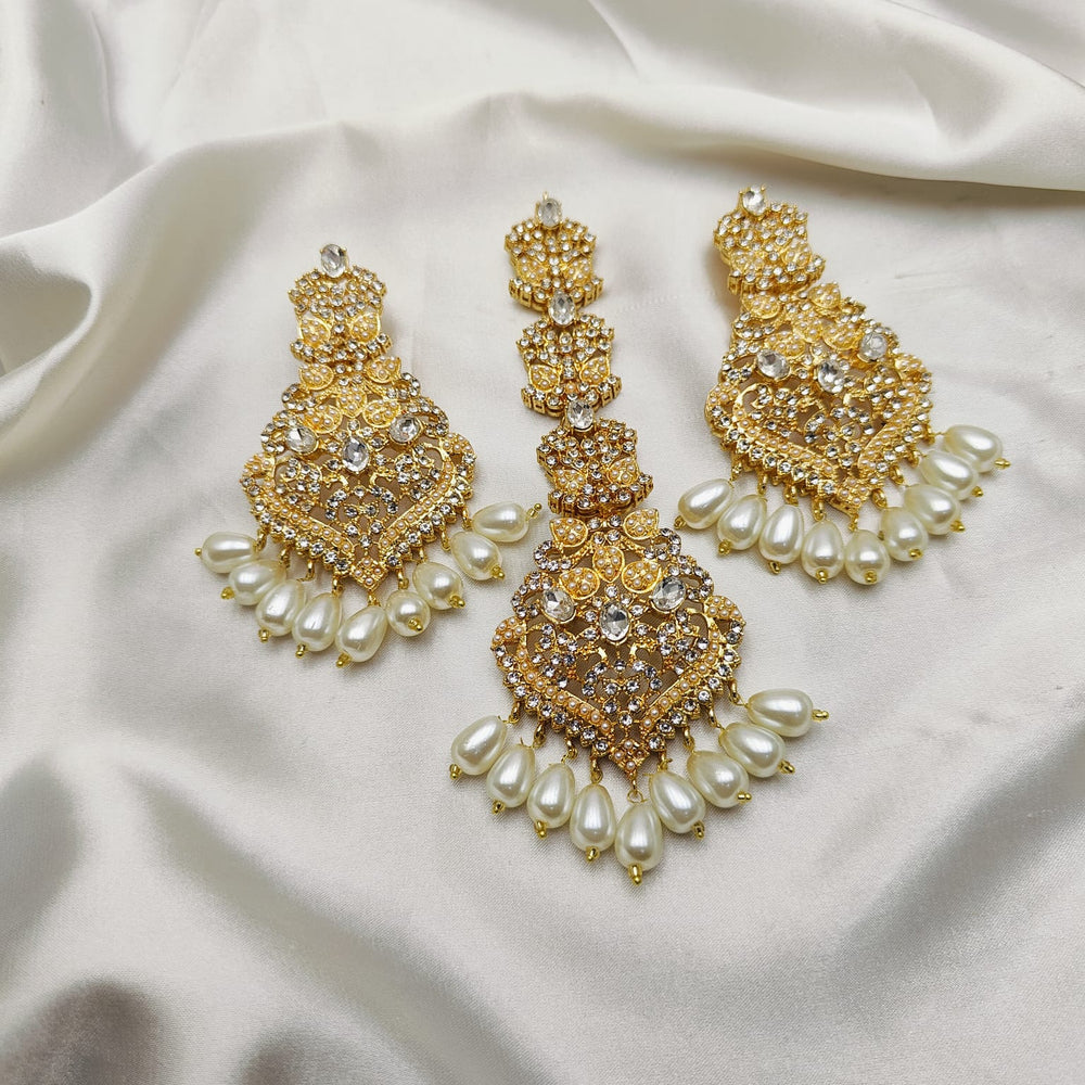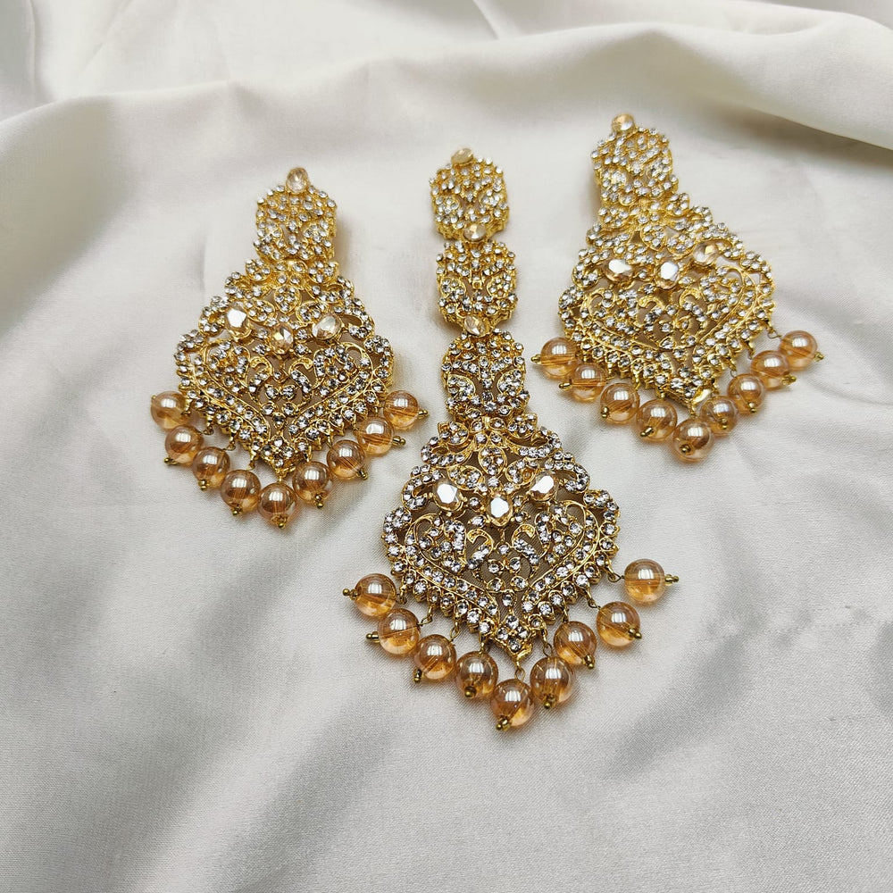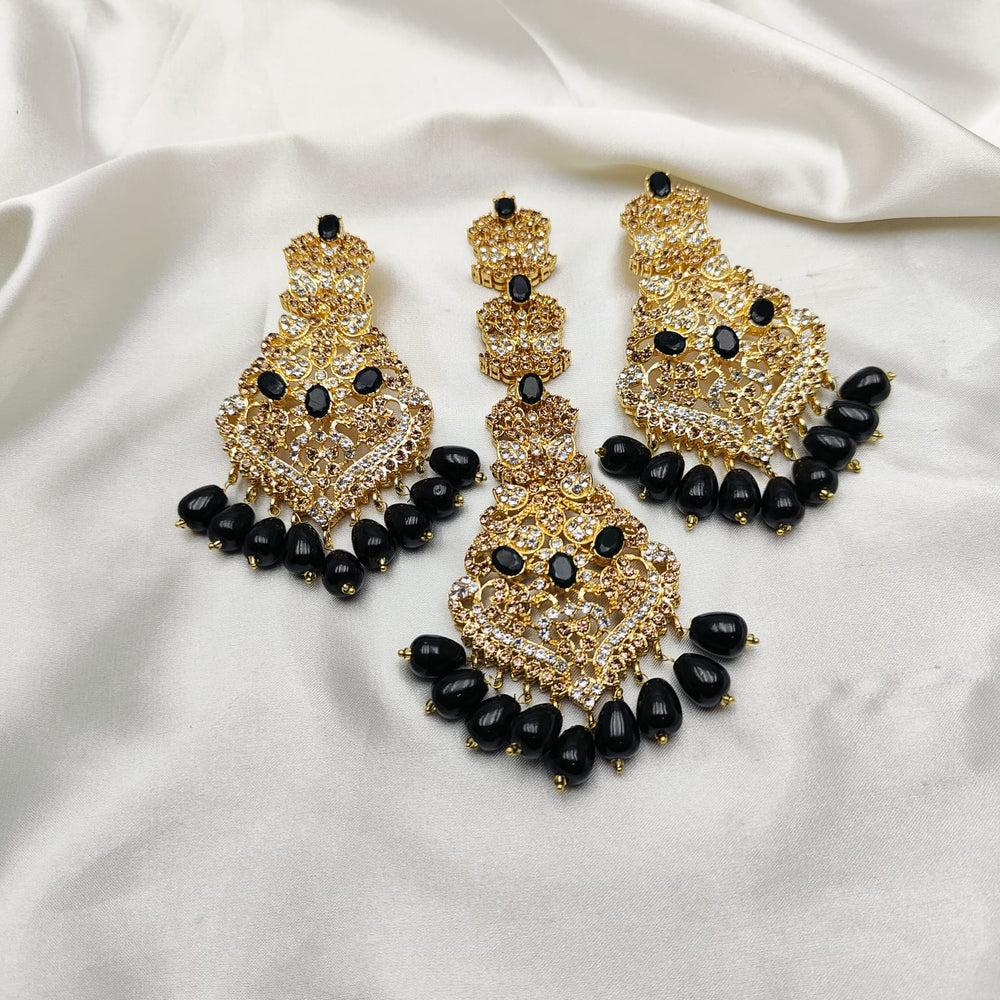 This stunning set features a glamorous tikka and matching earrings, designed to add a regal touch to any traditional or contemporary outfit.