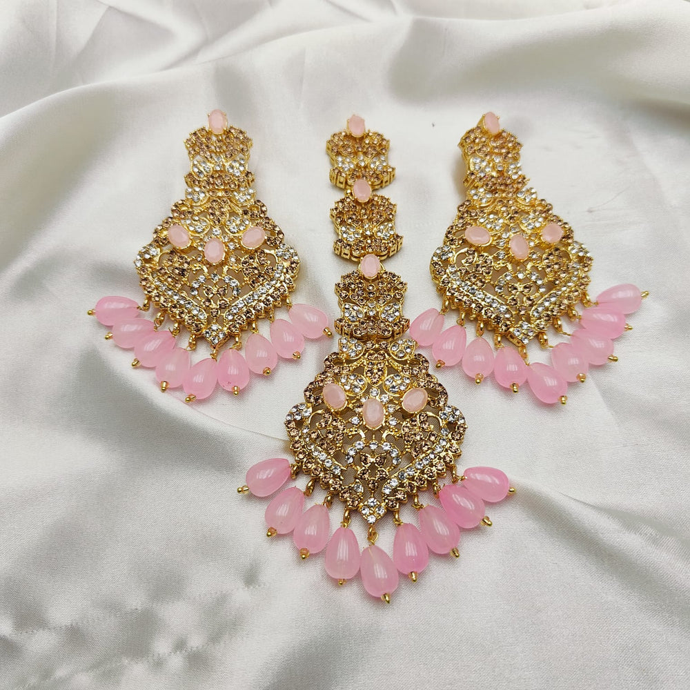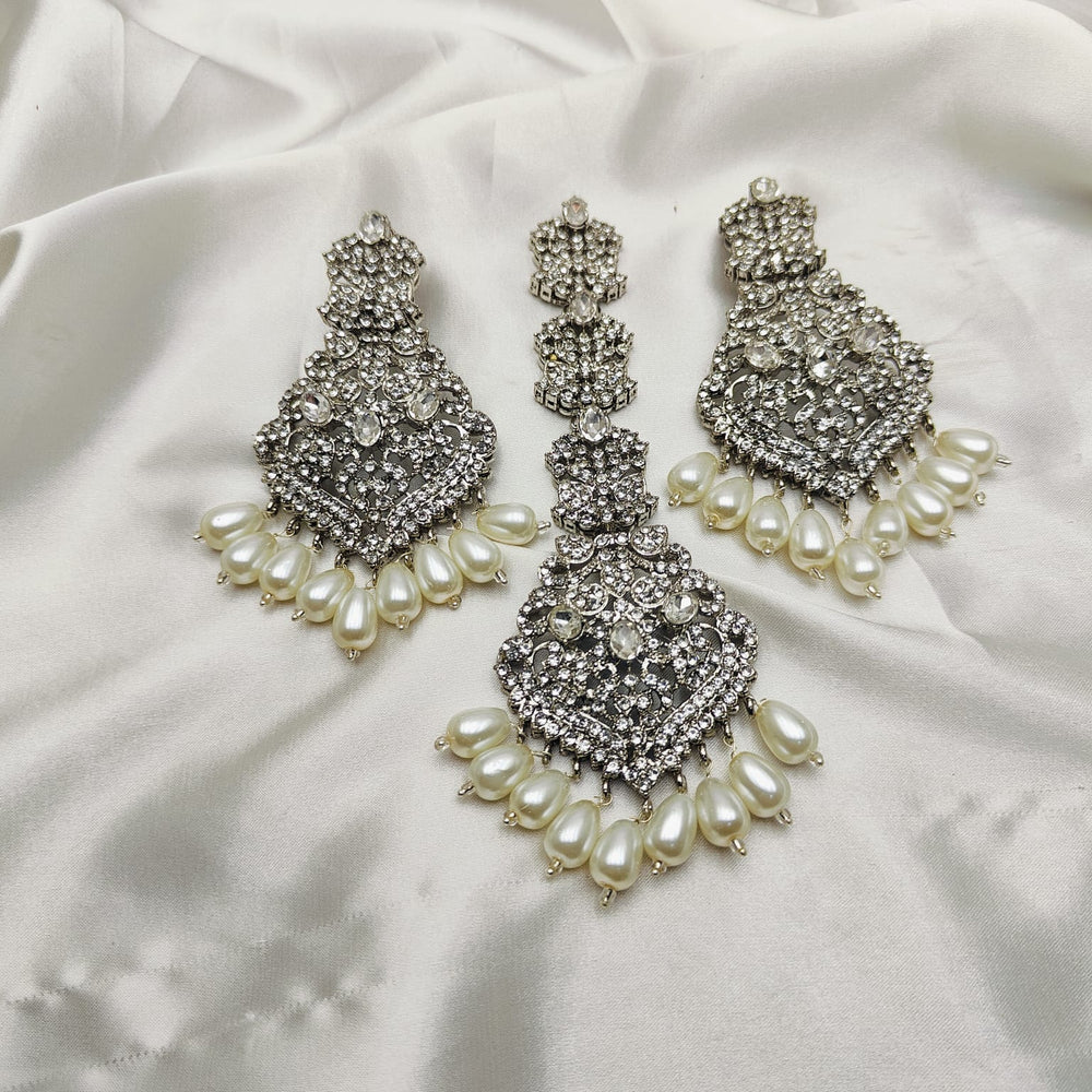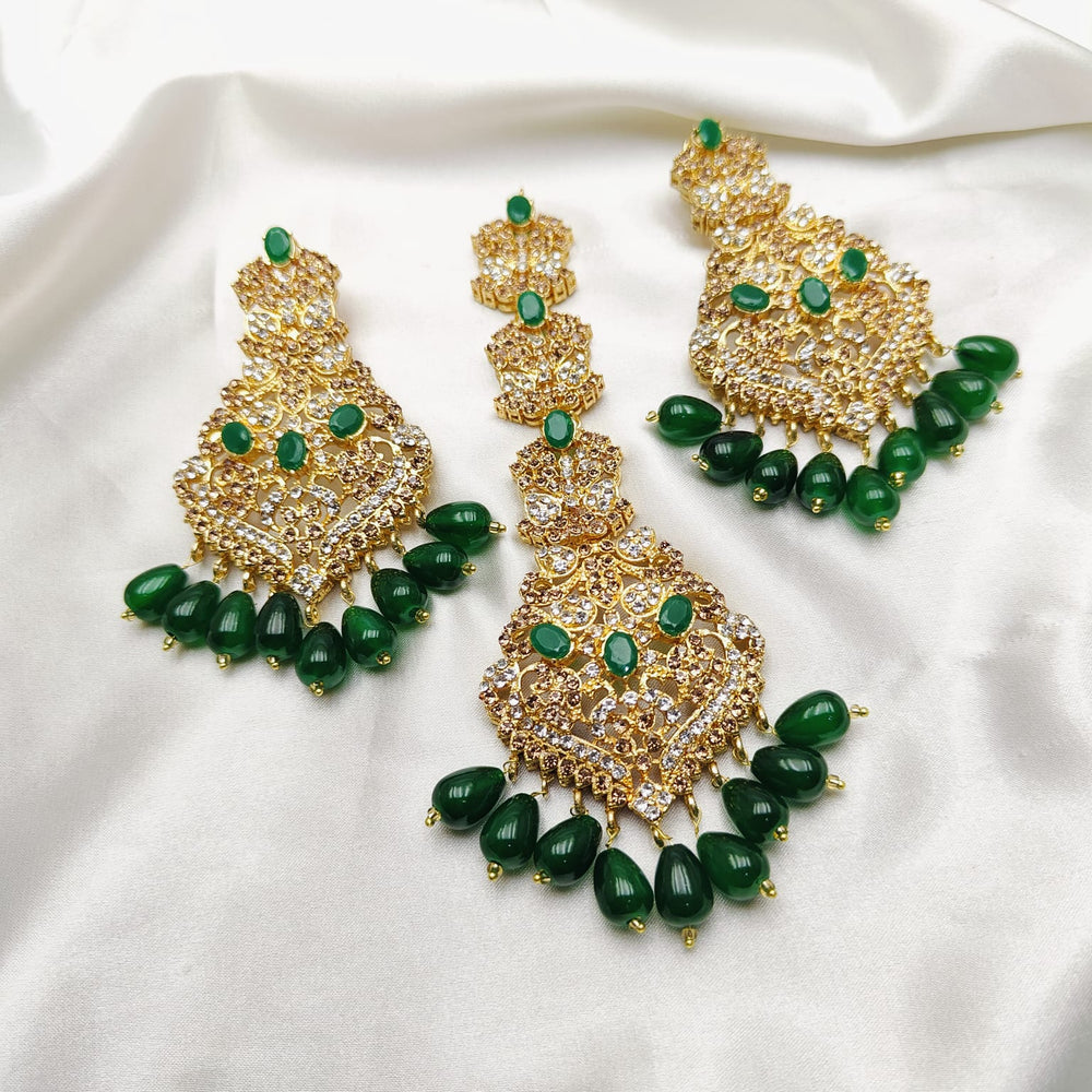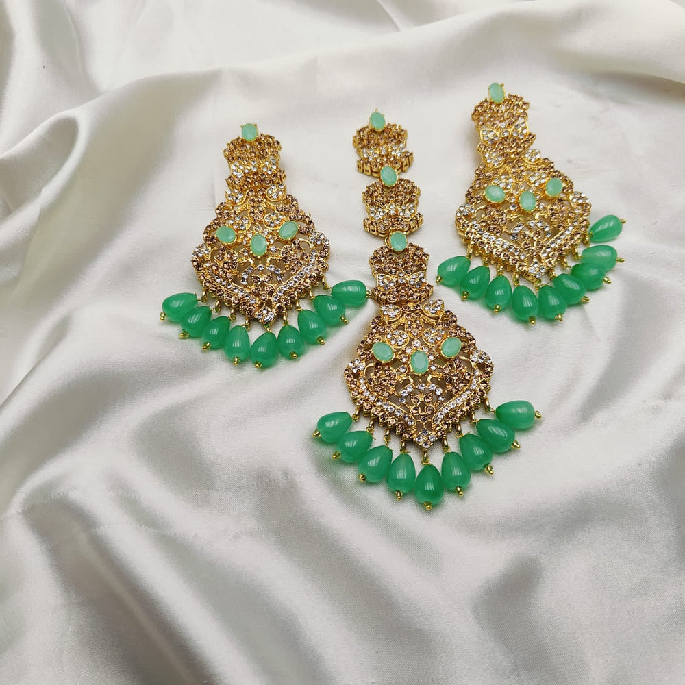 This stunning set features a glamorous tikka and matching earrings, designed to add a regal touch to any traditional or contemporary outfit.