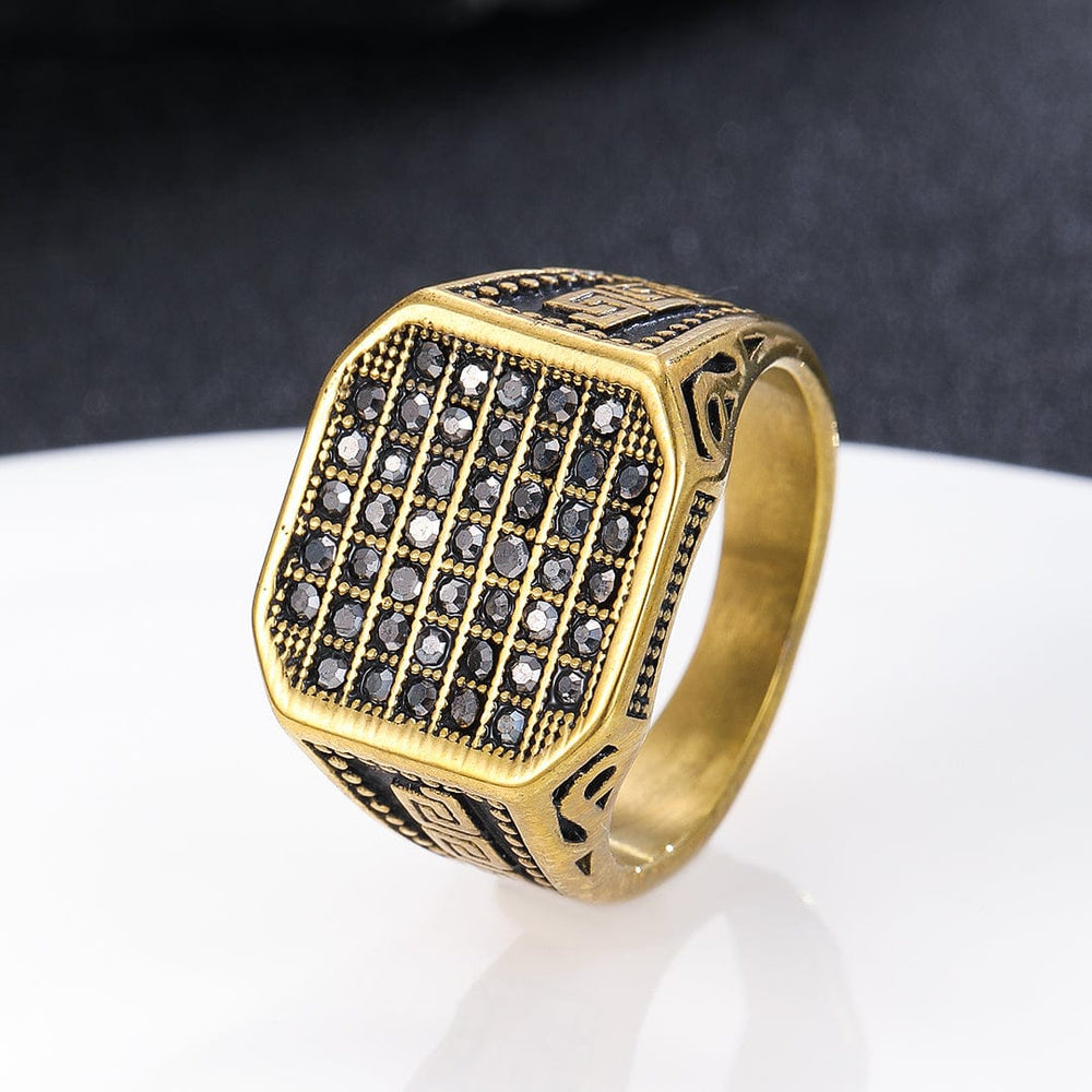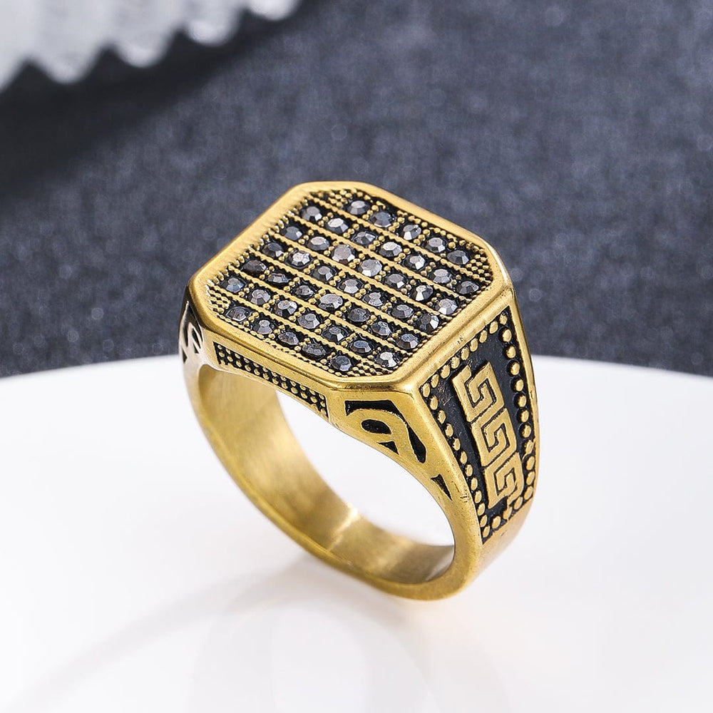 | 10 | The Royal Crest Signet | Gilded Crest/Fleur-de-Lis motif | Paved Black CZ border on an ornate, dark band. | High-Contrast Two-Tone (Gold/Dark Metal). |