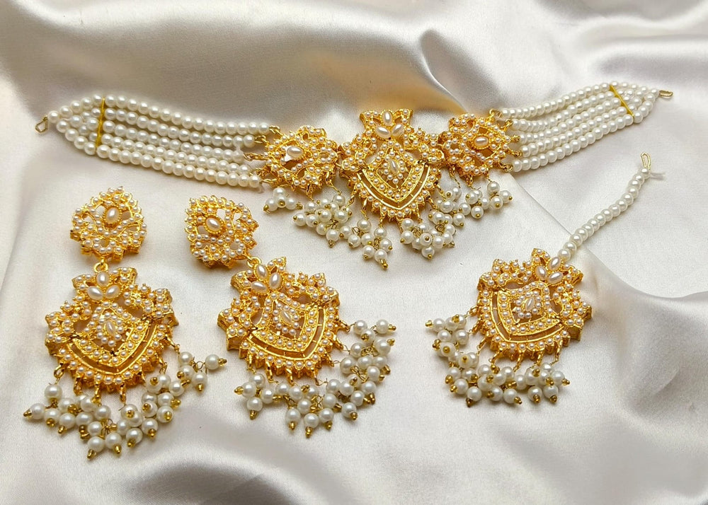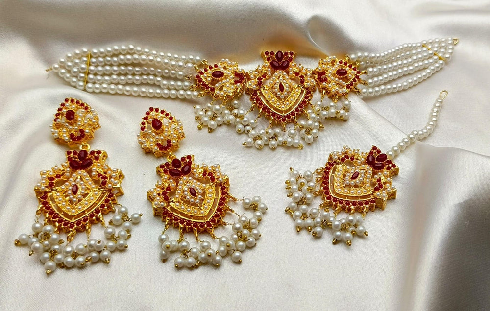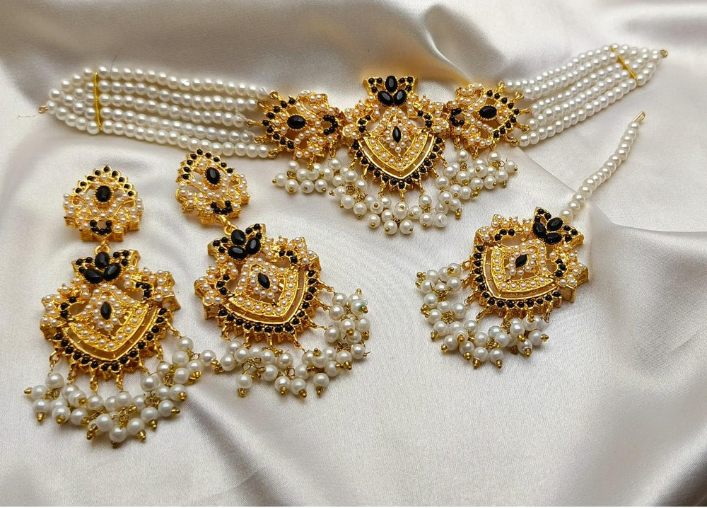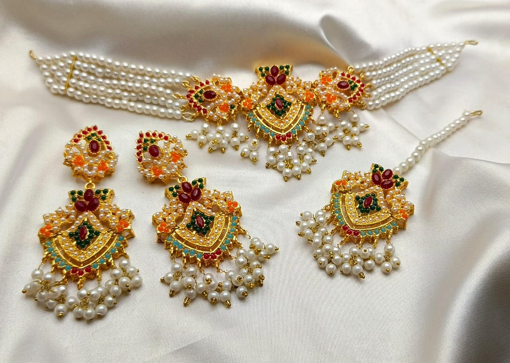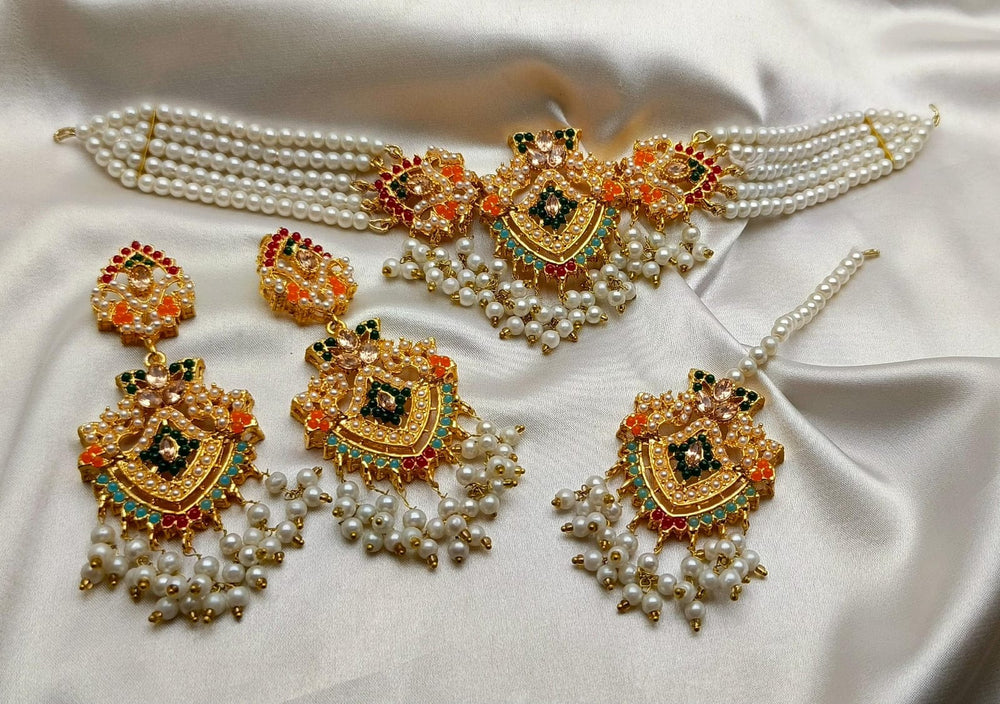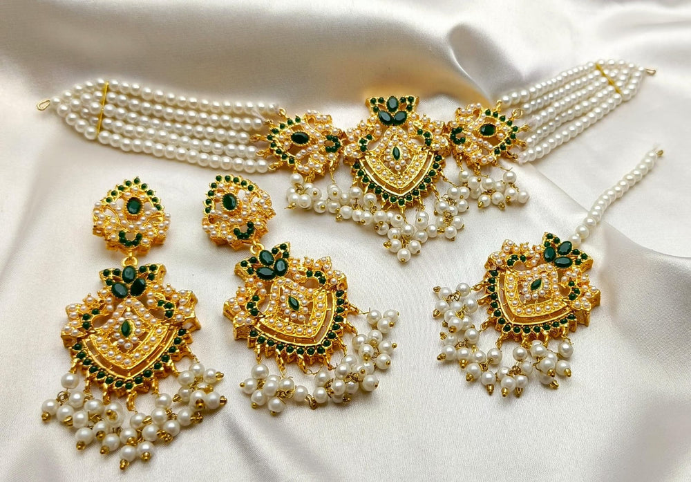 A fine quality necklace set typically features a beautifully crafted design with attention to detail and high-grade materials. The set can include a necklace, earrings, and sometimes a matching bracelet, all made from precious metals like 18K or 22K gold, platinum, or sterling silver. The necklace is often adorned with high-quality gemstones, such as diamonds, sapphires, rubies, emeralds, or pearls, with each stone cut to maximize its brilliance and clarity.