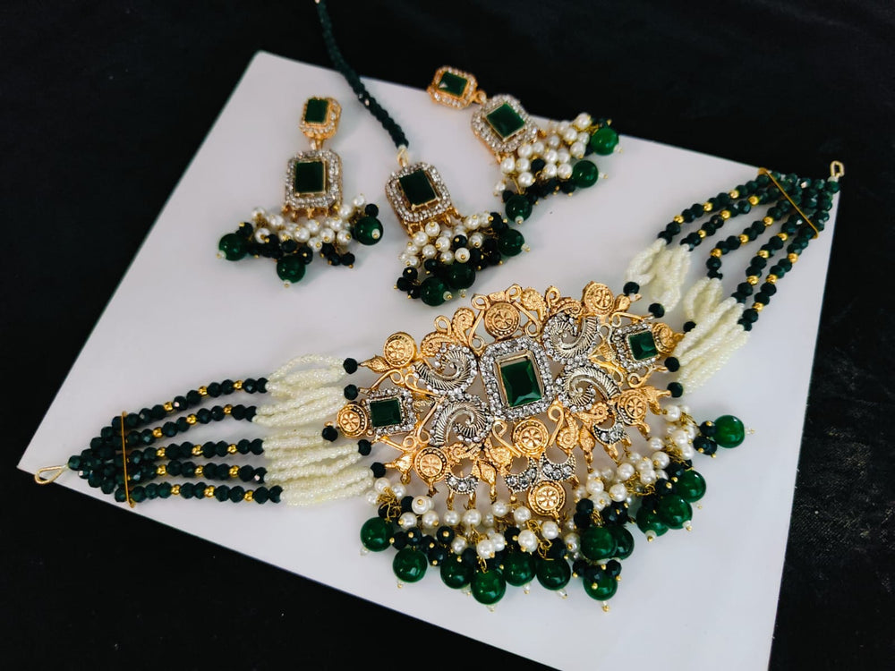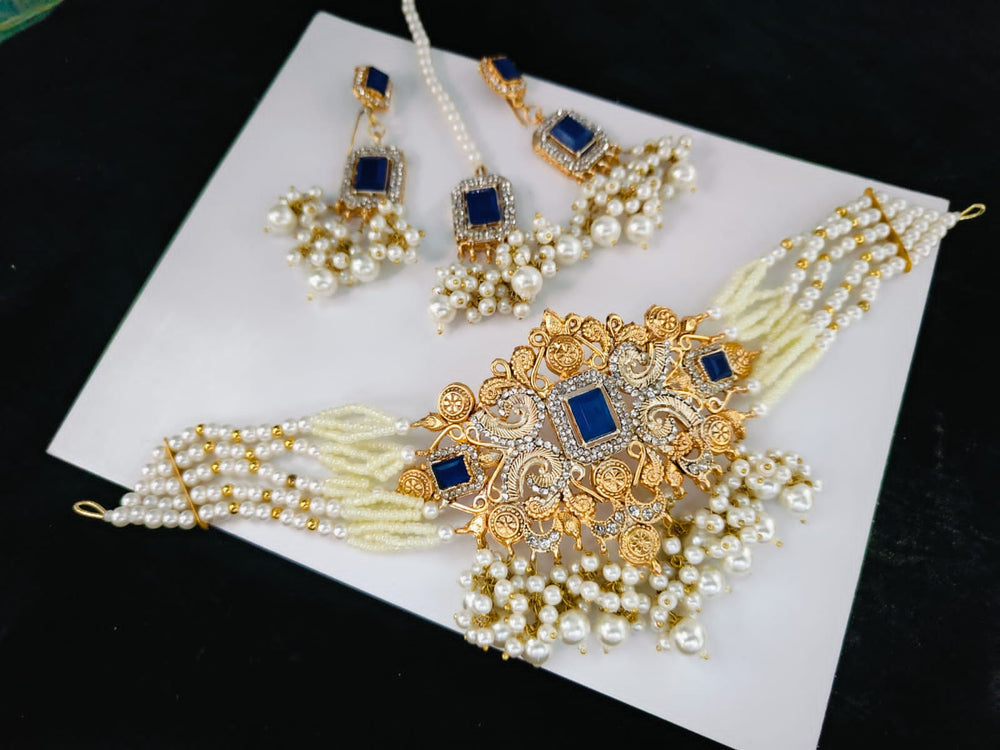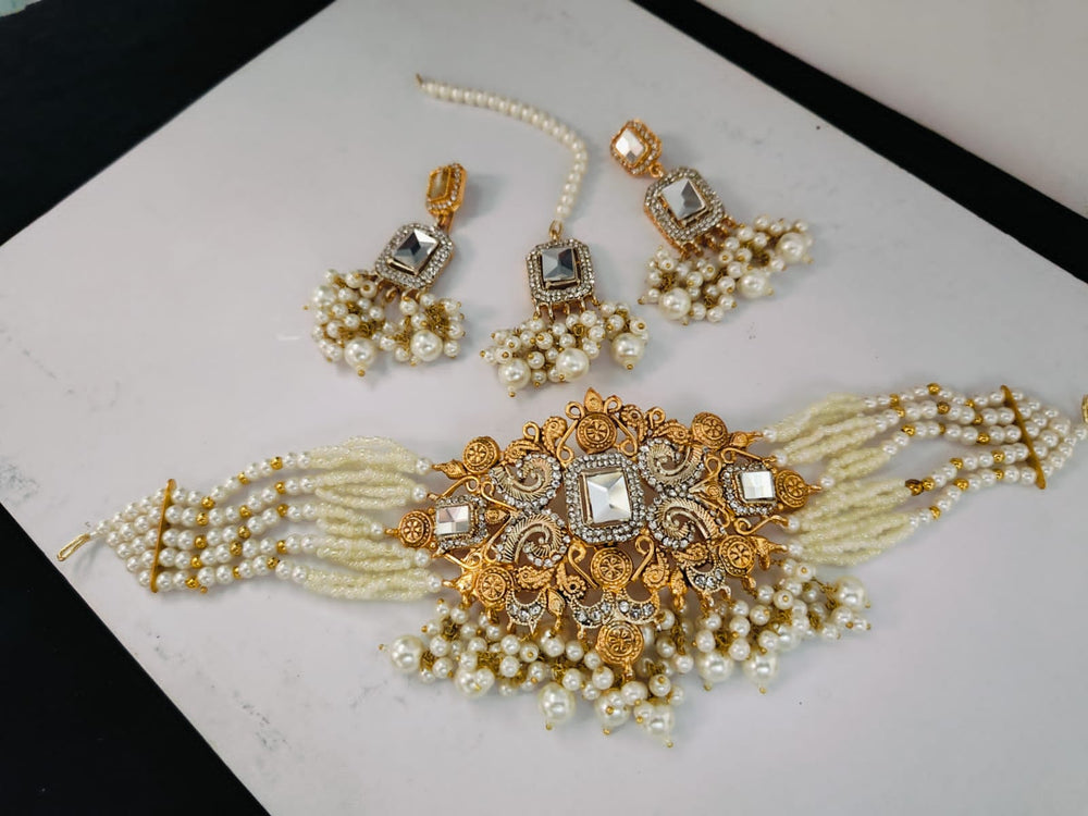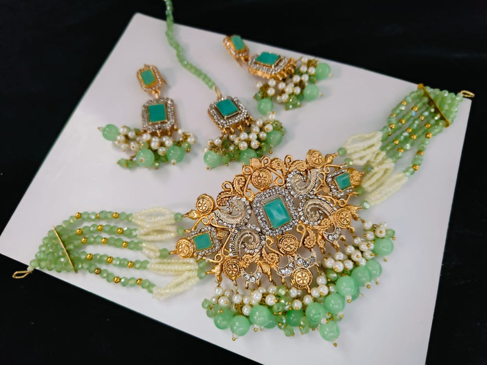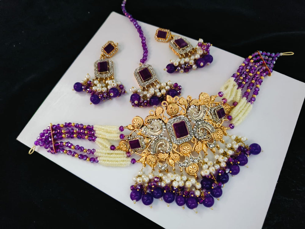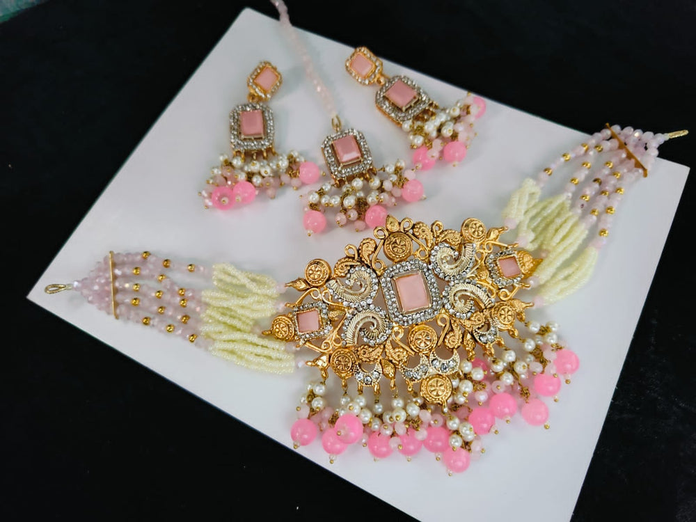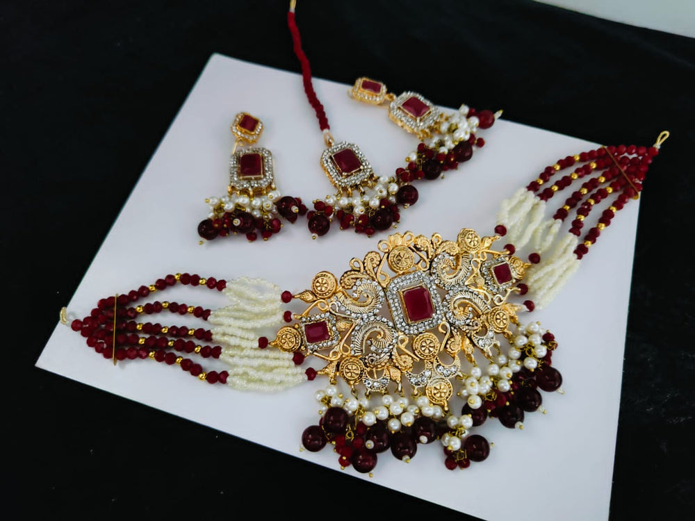 Complementing the necklace are matching earrings, designed to create a harmonious and graceful look. Ideal for weddings, festive occasions, or special celebrations, this lightweight yet durable set offers timeless beauty and exceptional craftsmanship.