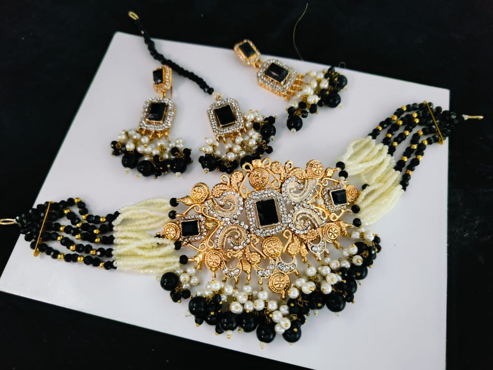 Elevate your style with this exquisite gold polish necklace set, a perfect blend of traditional artistry and contemporary elegance. This set features a stunning necklace crafted with a high-quality gold-plated finish, showcasing intricate designs inspired by classic motifs. The centerpiece is adorned with shimmering stones, adding a touch of glamour and sophistication.