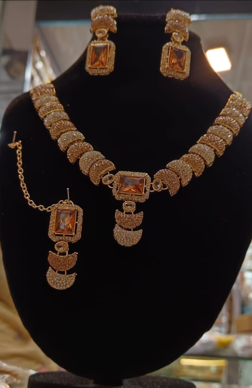 2. Earrings: Matching earrings that complement the necklace, usually studded with the same embellishments for a cohesive look.