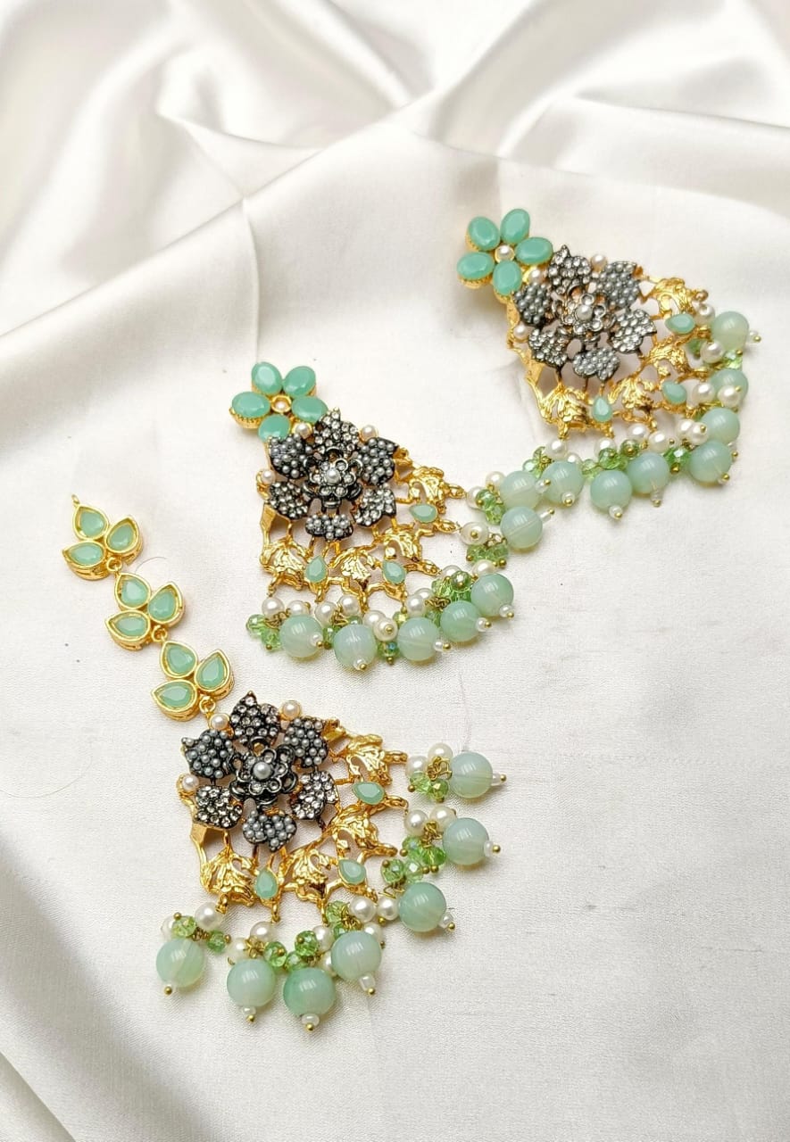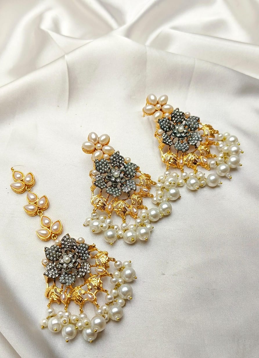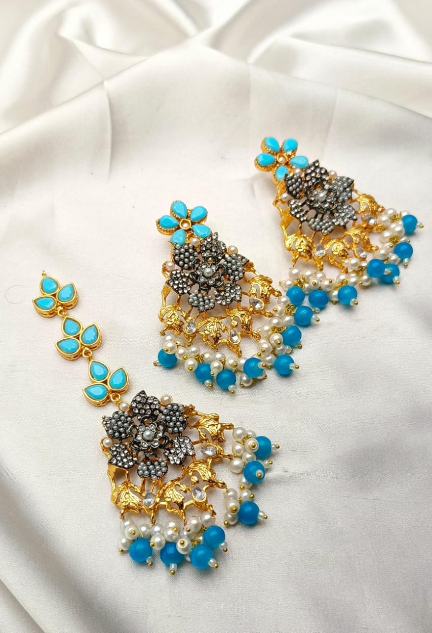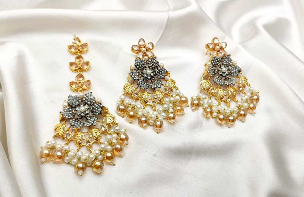 "Elevate your ensemble with this exquisite tika and earrings set, crafted to perfection for special occasions. The tika features an intricate design adorned with shimmering stones, cascading into a delicate chain that rests elegantly on the forehead. The matching earrings are a harmonious blend of sophistication and charm, boasting intricate detailing and sparkling embellishments. Perfect for weddings, festive celebrations, or any event where elegance is paramount, this set is designed to complement traditional and contemporary attire alike, leaving a lasting impression.