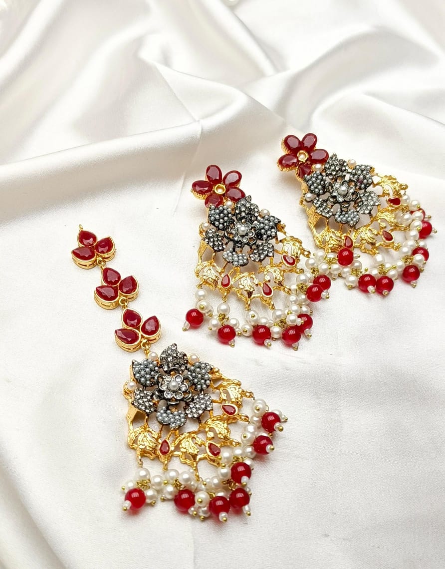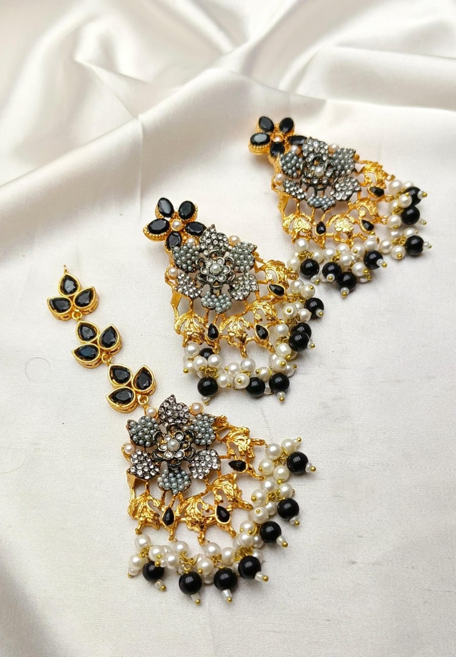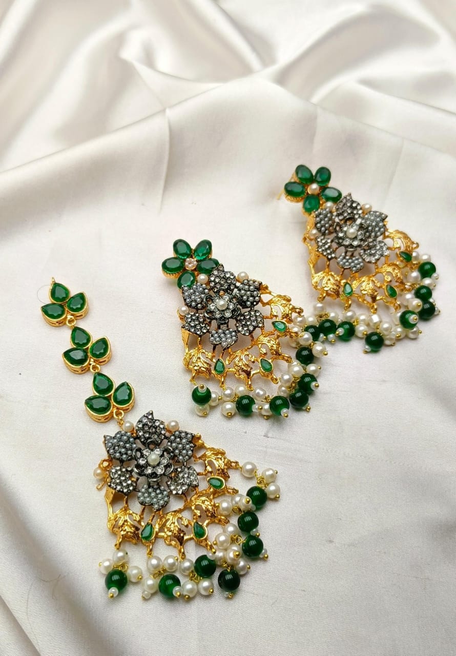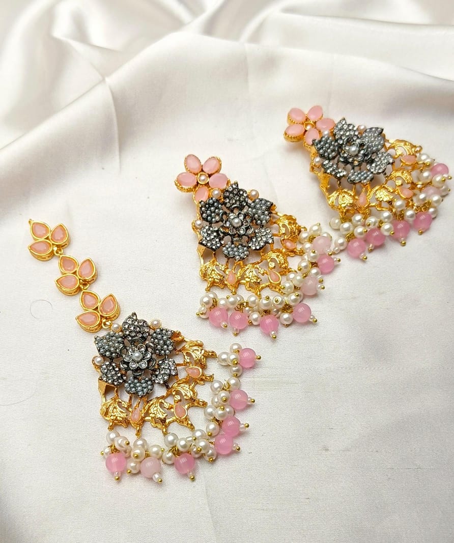 "Elevate your ensemble with this exquisite tika and earrings set, crafted to perfection for special occasions. The tika features an intricate design adorned with shimmering stones, cascading into a delicate chain that rests elegantly on the forehead. The matching earrings are a harmonious blend of sophistication and charm, boasting intricate detailing and sparkling embellishments. Perfect for weddings, festive celebrations, or any event where elegance is paramount, this set is designed to complement traditional and contemporary attire alike, leaving a lasting impression.
