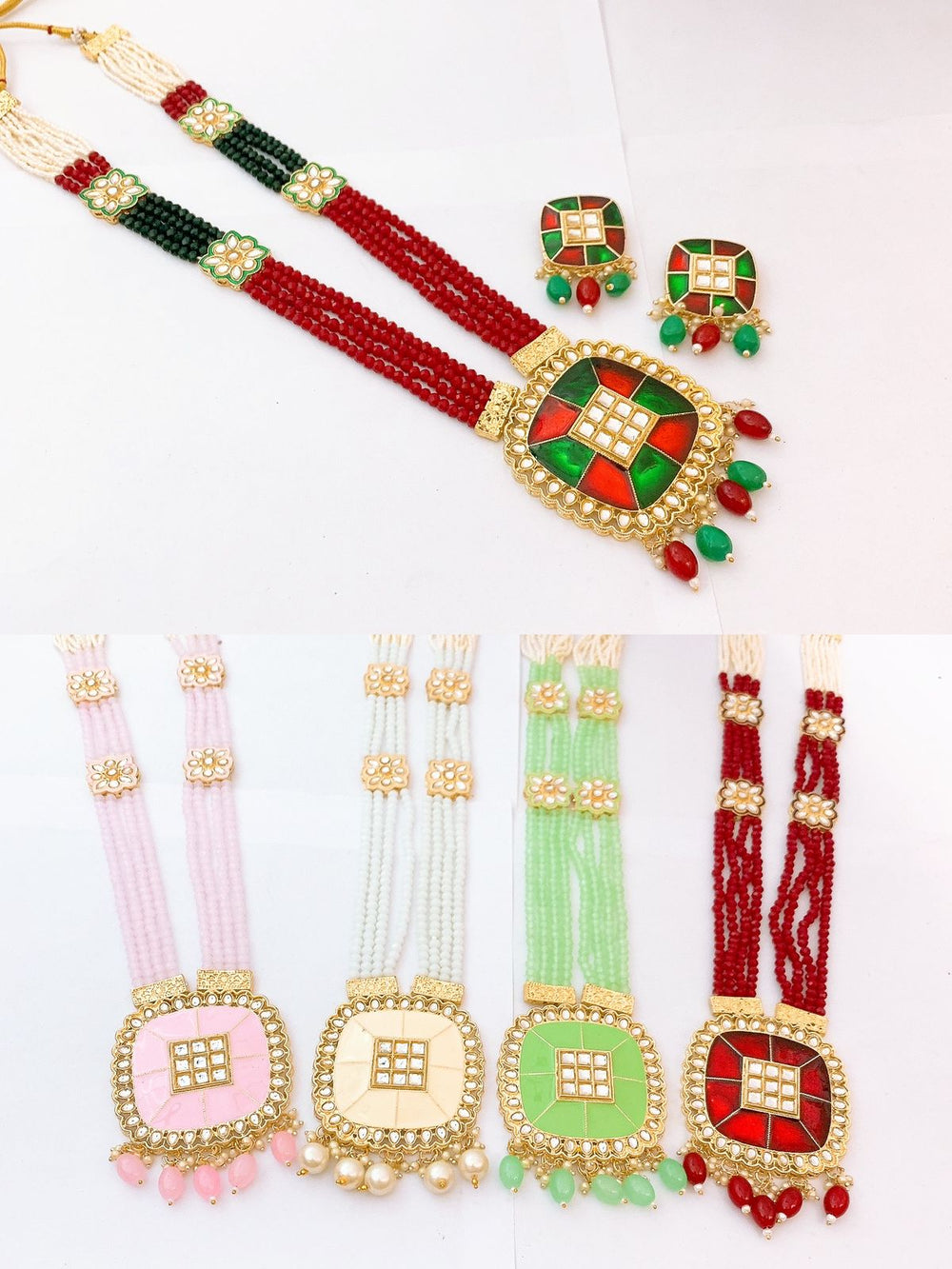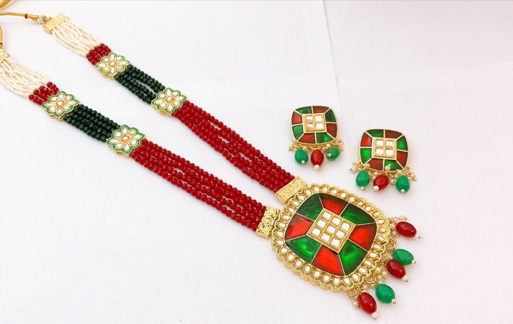 Jaipuri Meenakari Mala is a traditional Rajasthani jewelry piece known for its exquisite craftsmanship and vibrant enamel work. Originating from Jaipur, this type of necklace showcases the art of Meenakari, a decorative technique where intricate floral and geometric patterns are created using colored enamels on metal surfaces, often gold or silver.
