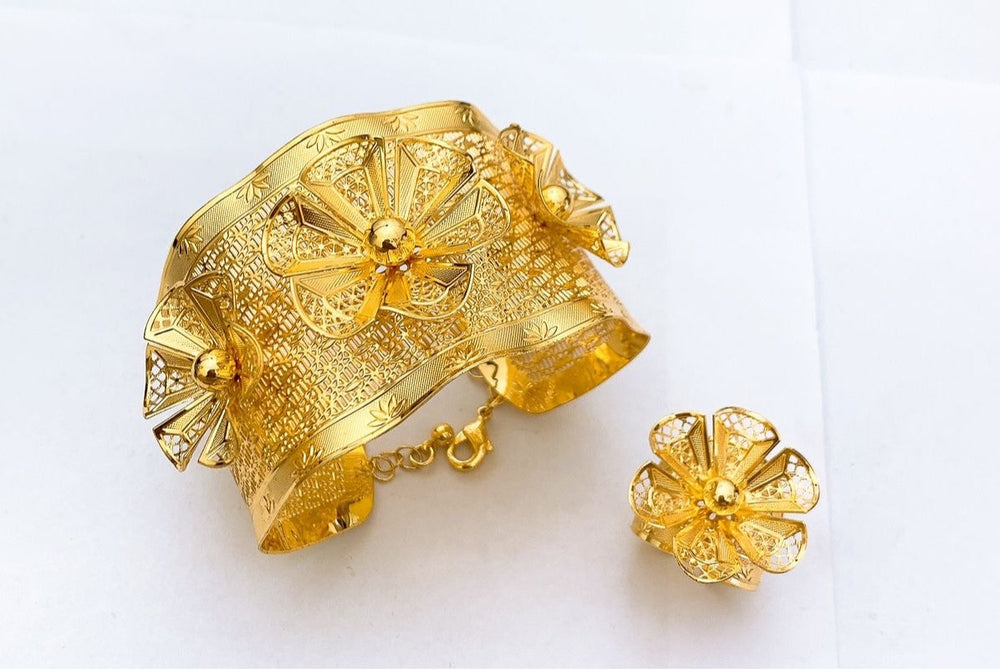 The bracelet encircles the wrist, while the ring fits around a finger, creating a unified piece.