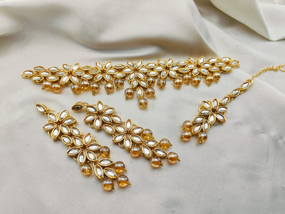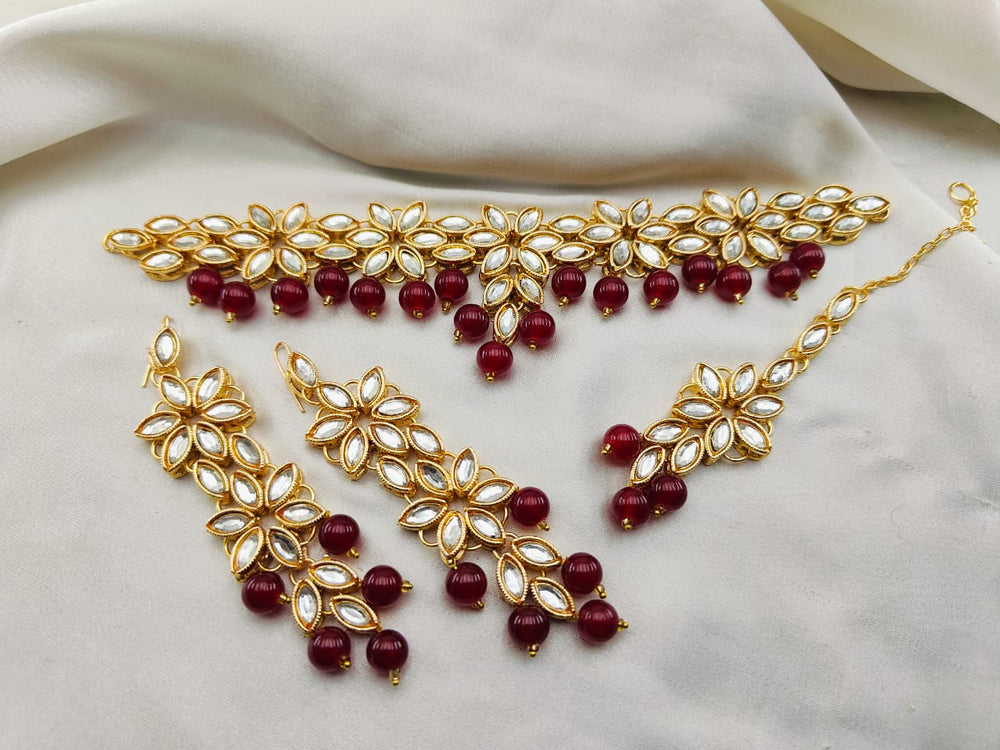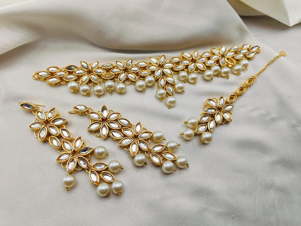 Comes with matching earrings (danglers or studs) and occasionally a maang tikka (forehead accessory).