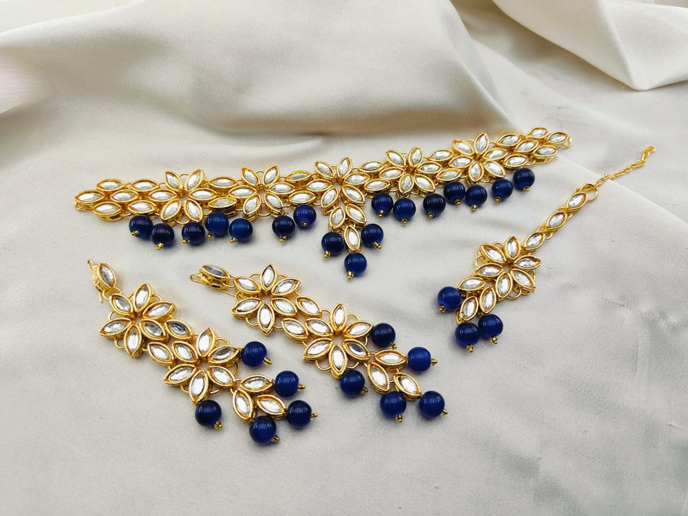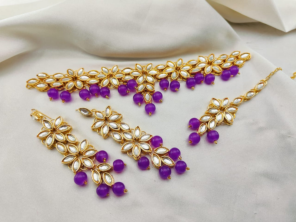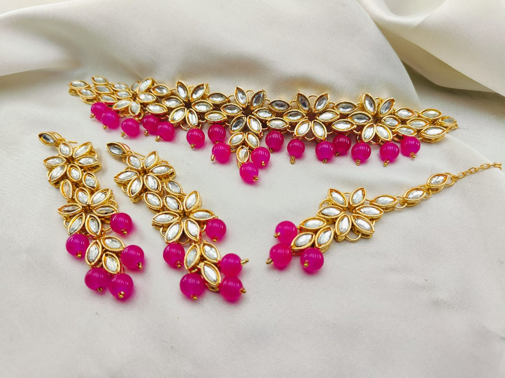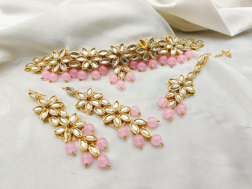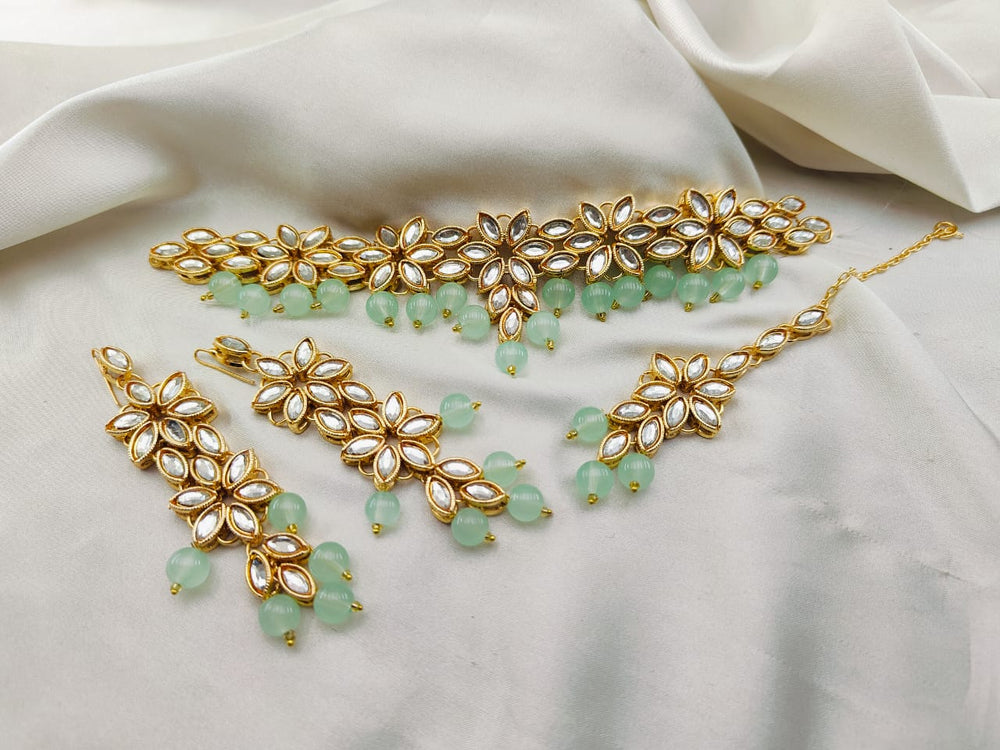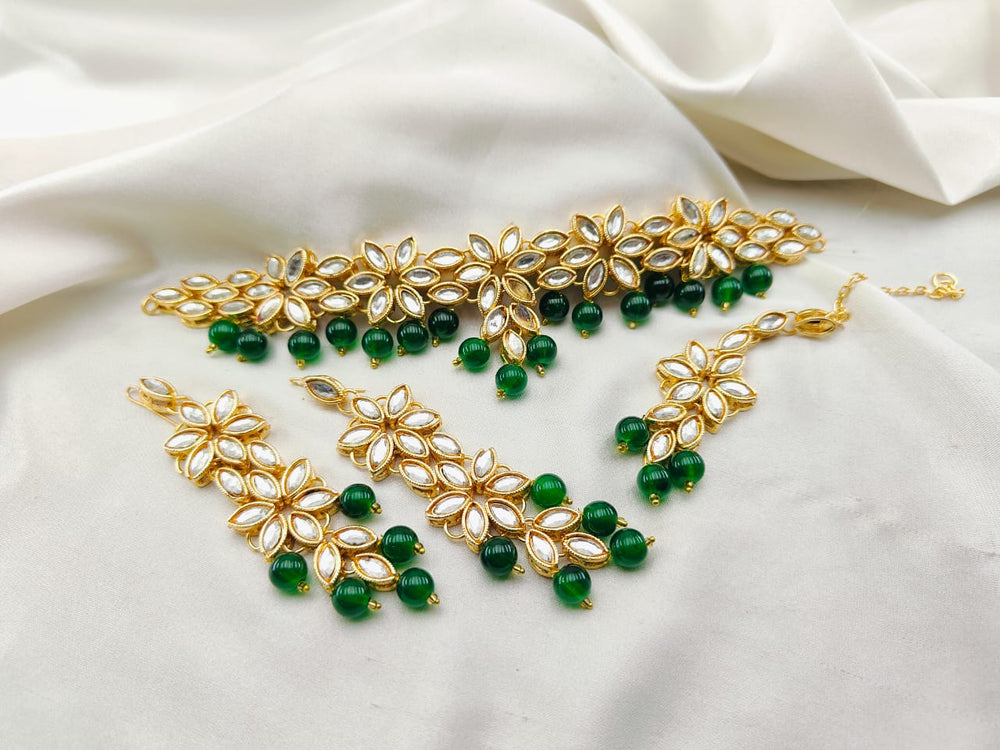 A Kundan Choker Set is a traditional and opulent piece of Indian jewelry that exudes timeless elegance. Crafted using the ancient art of Kundan work, it typically features a close-fitting necklace that sits snugly around the neck. Here’s a detailed description: