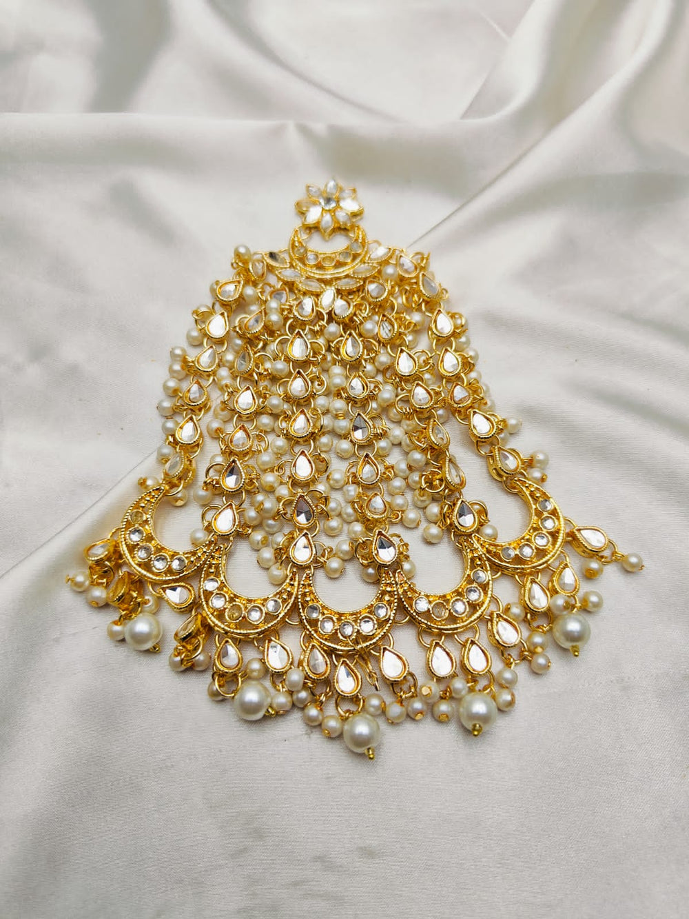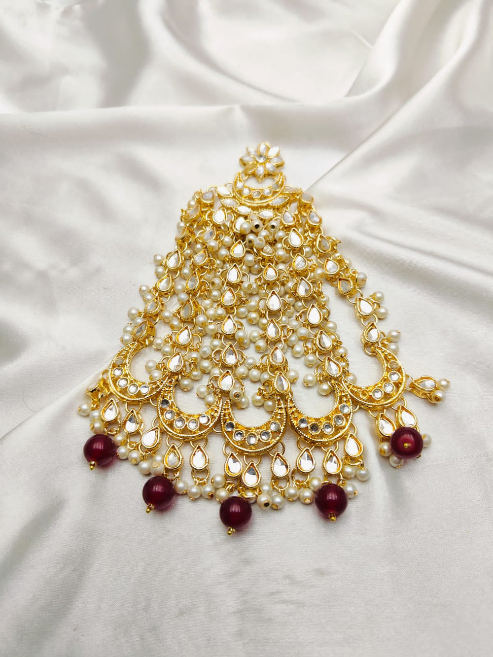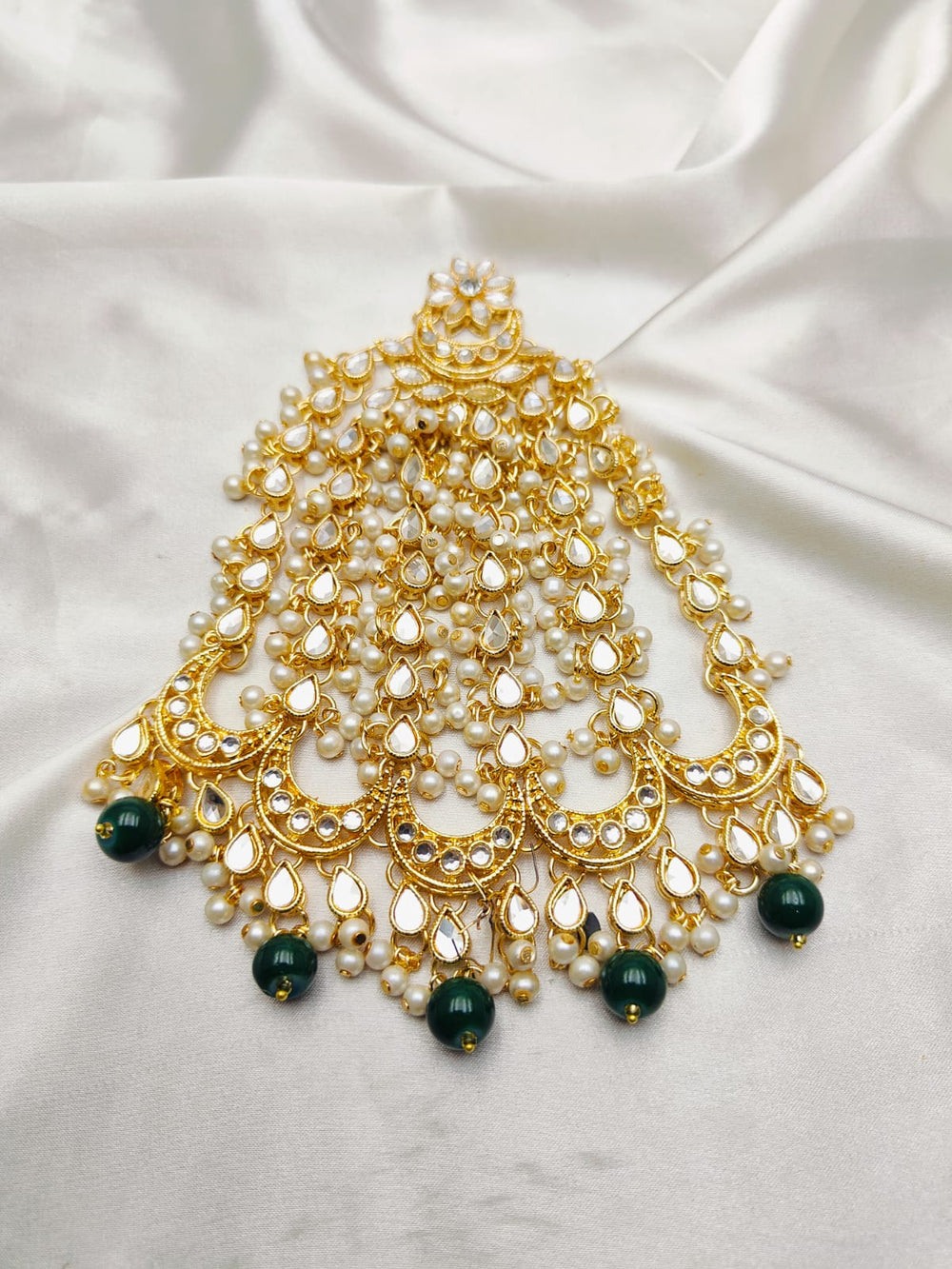 A Kundan Stones Jhoomar is a traditional piece of Indian jewelry designed to add elegance and charm to bridal and festive attire. Here's a detailed description: