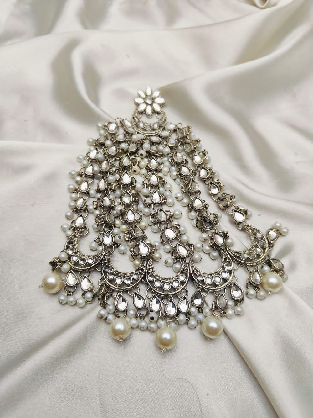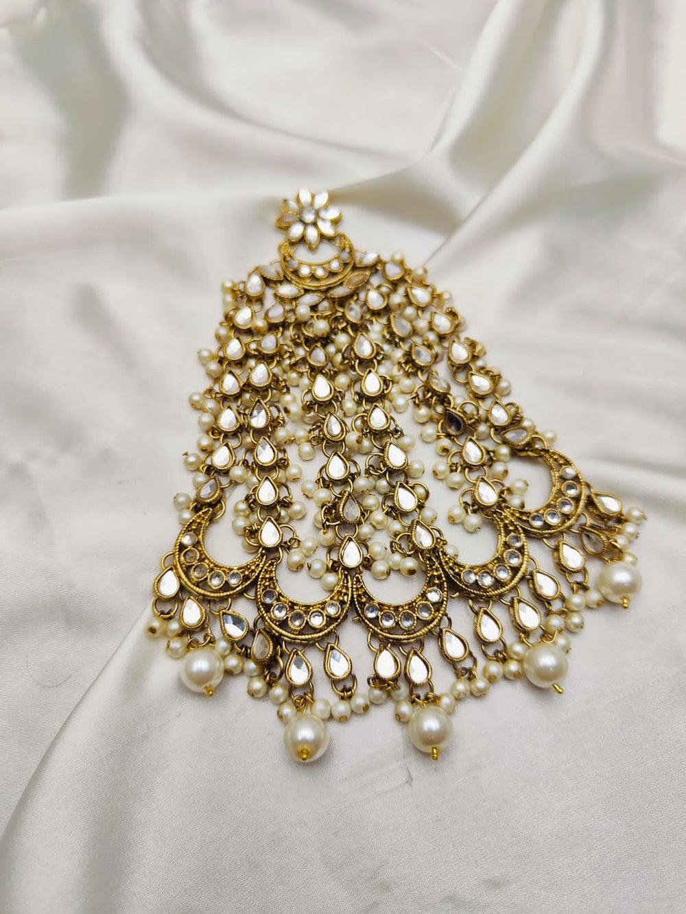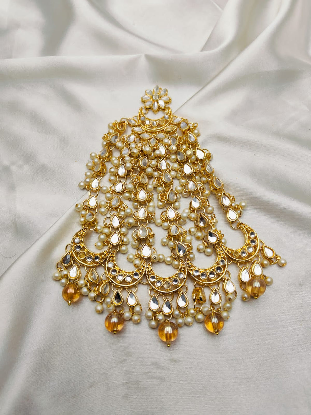 A Kundan Stones Jhoomar is a traditional piece of Indian jewelry designed to add elegance and charm to bridal and festive attire. Here's a detailed description: