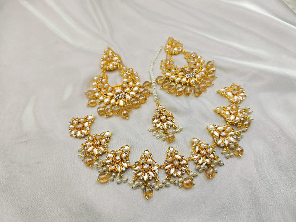 A Kundan stones necklace set is a traditional and exquisite piece of Indian jewelry, often associated with royal heritage. This jewelry set is typically made using Kundan, a technique of setting stones in a gold or a gold-plated framework, where the stones are set in place using pure gold foil. The stones used are usually high-quality gemstones like diamonds, rubies, emeralds, and sapphires, but glass or semi-precious stones are also commonly used for a more affordable option.