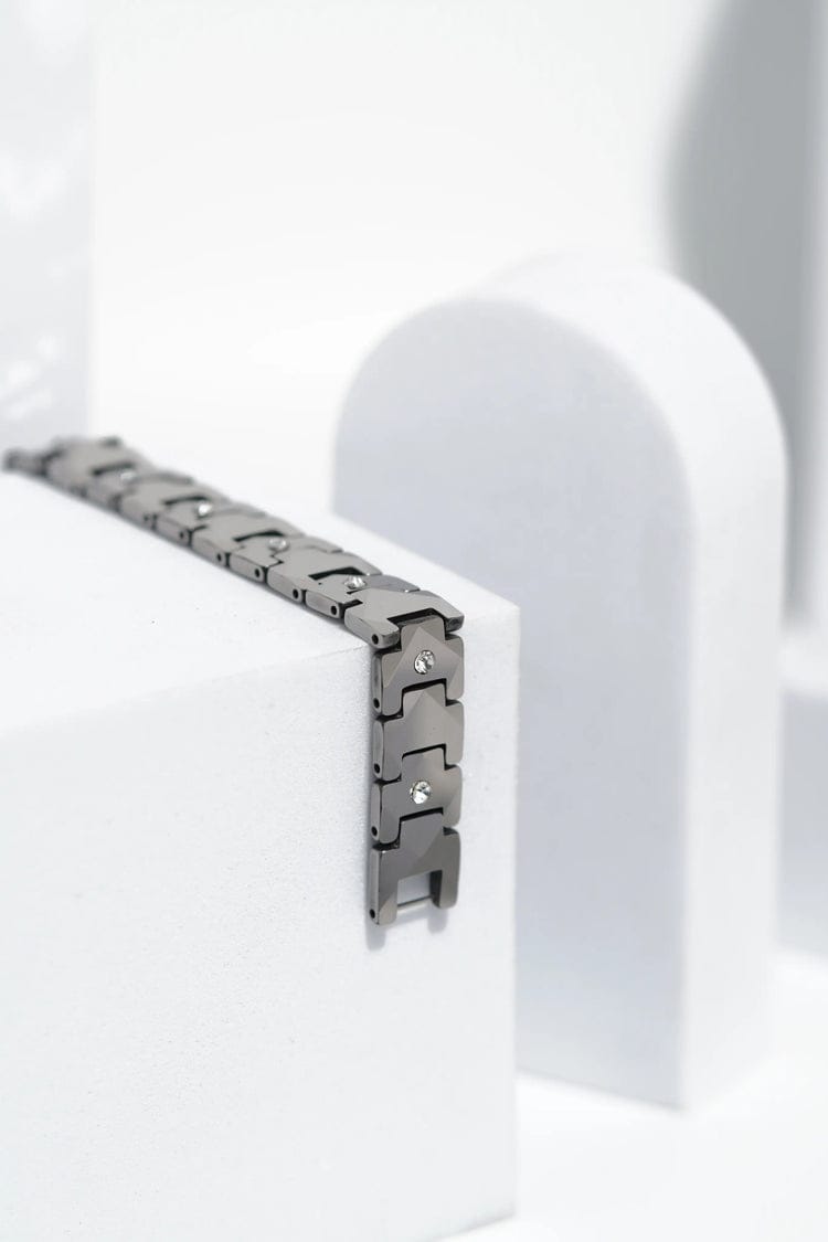 This modern and sophisticated Link Bracelet features solid, interlocking chevron-style links in a sleek Gunmetal tone. Several links are accented with small, strategically placed Clear Cubic Zirconia Simulants, giving the design subtle sparkle and flair.