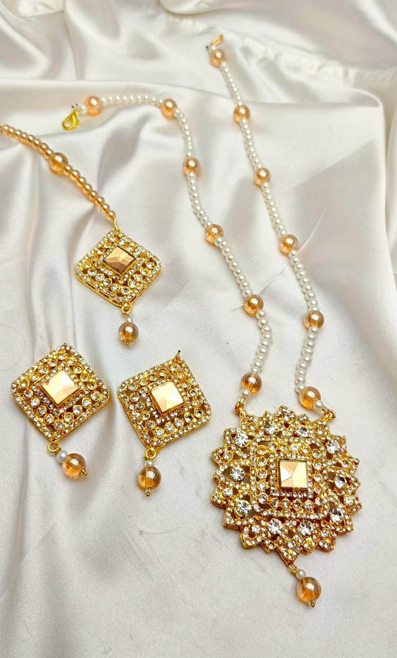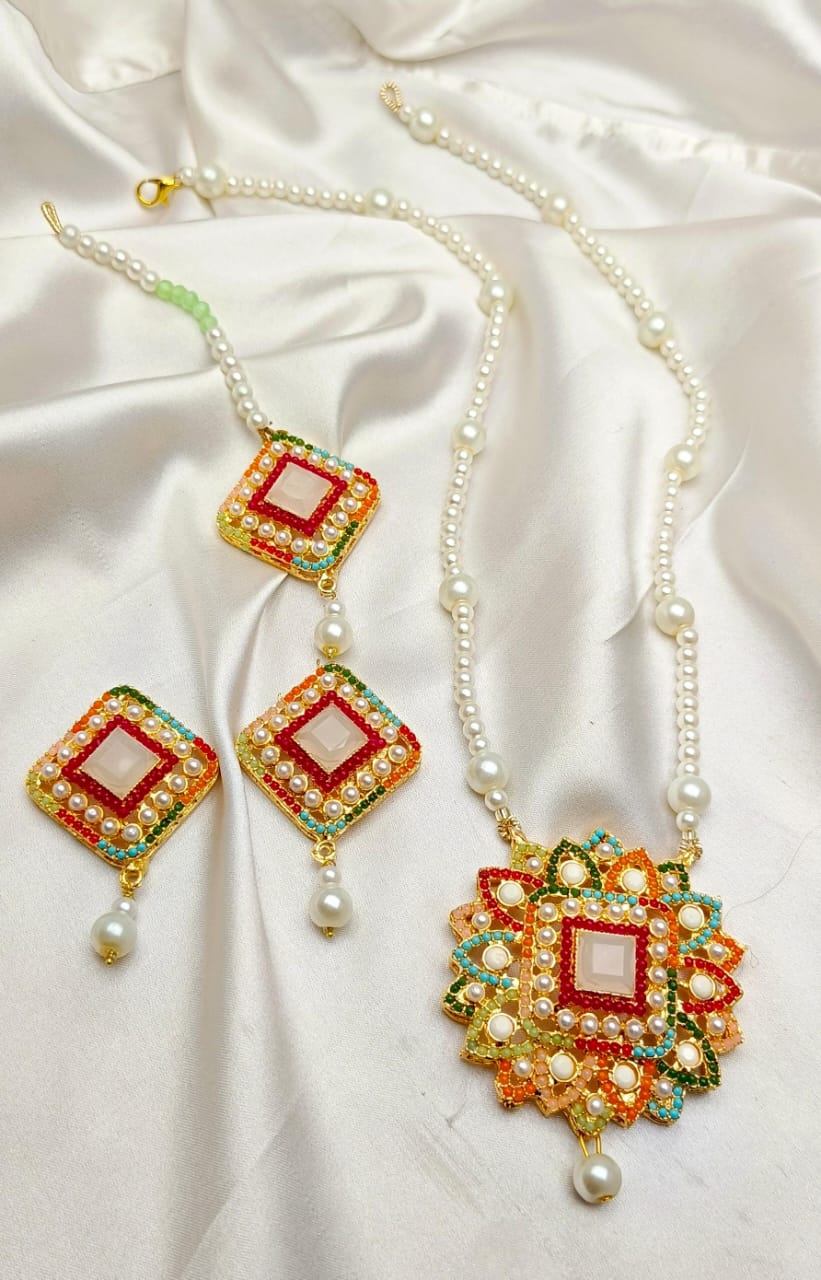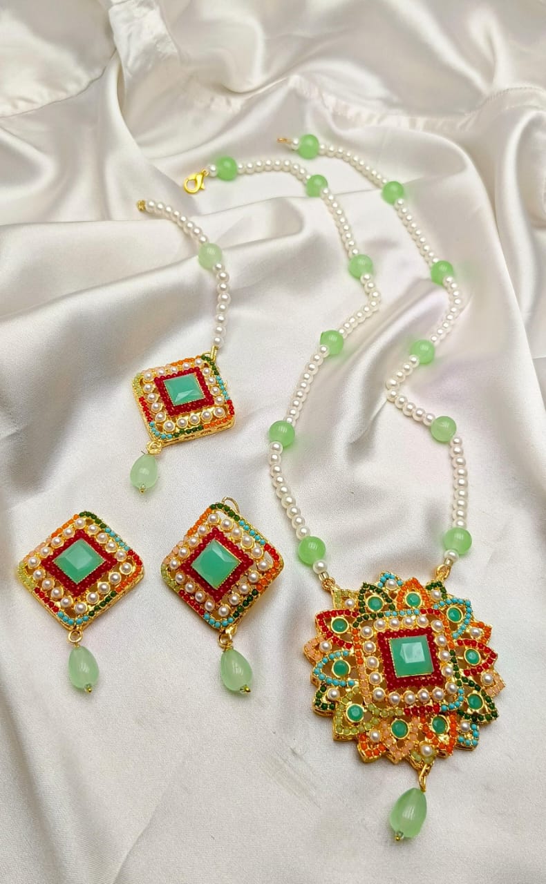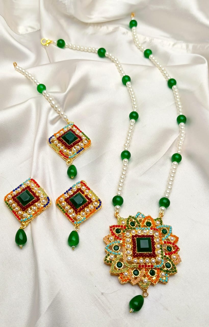 A Real Stone Maala Set is a traditional piece of jewelry designed using authentic, natural stones. These sets often include a maala (necklace) and complementary earrings, sometimes accompanied by additional accessories like bangles or a maang tikka. Here’s a detailed description: