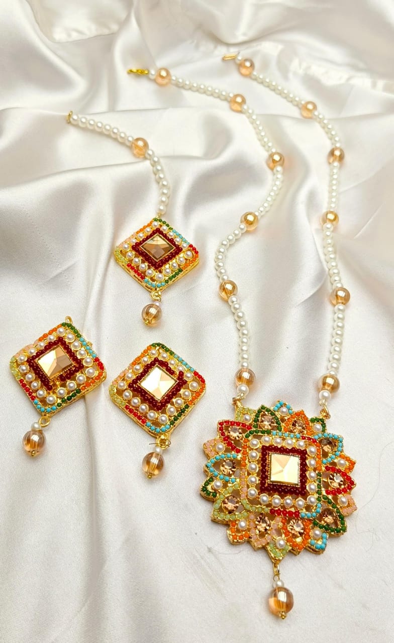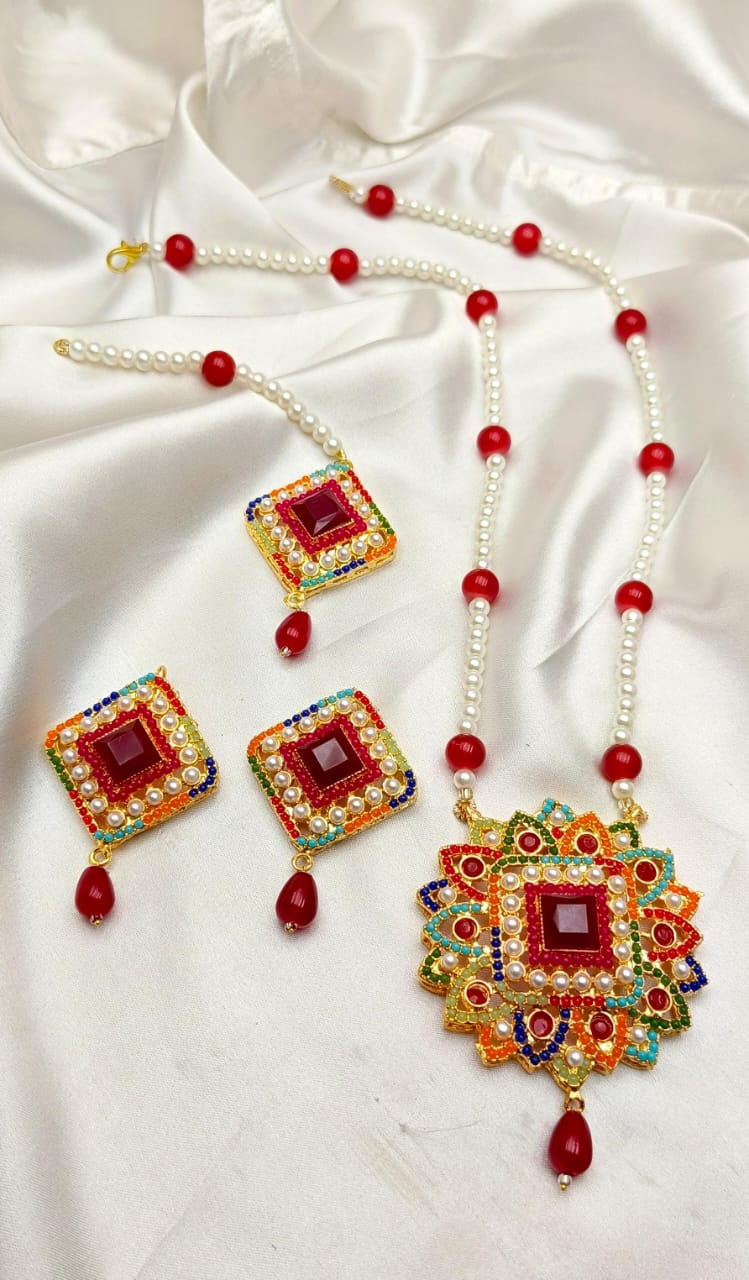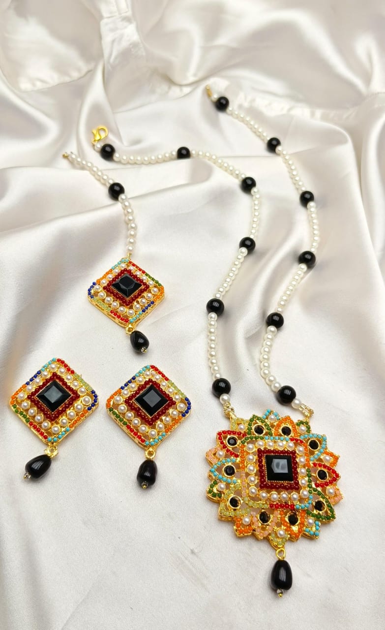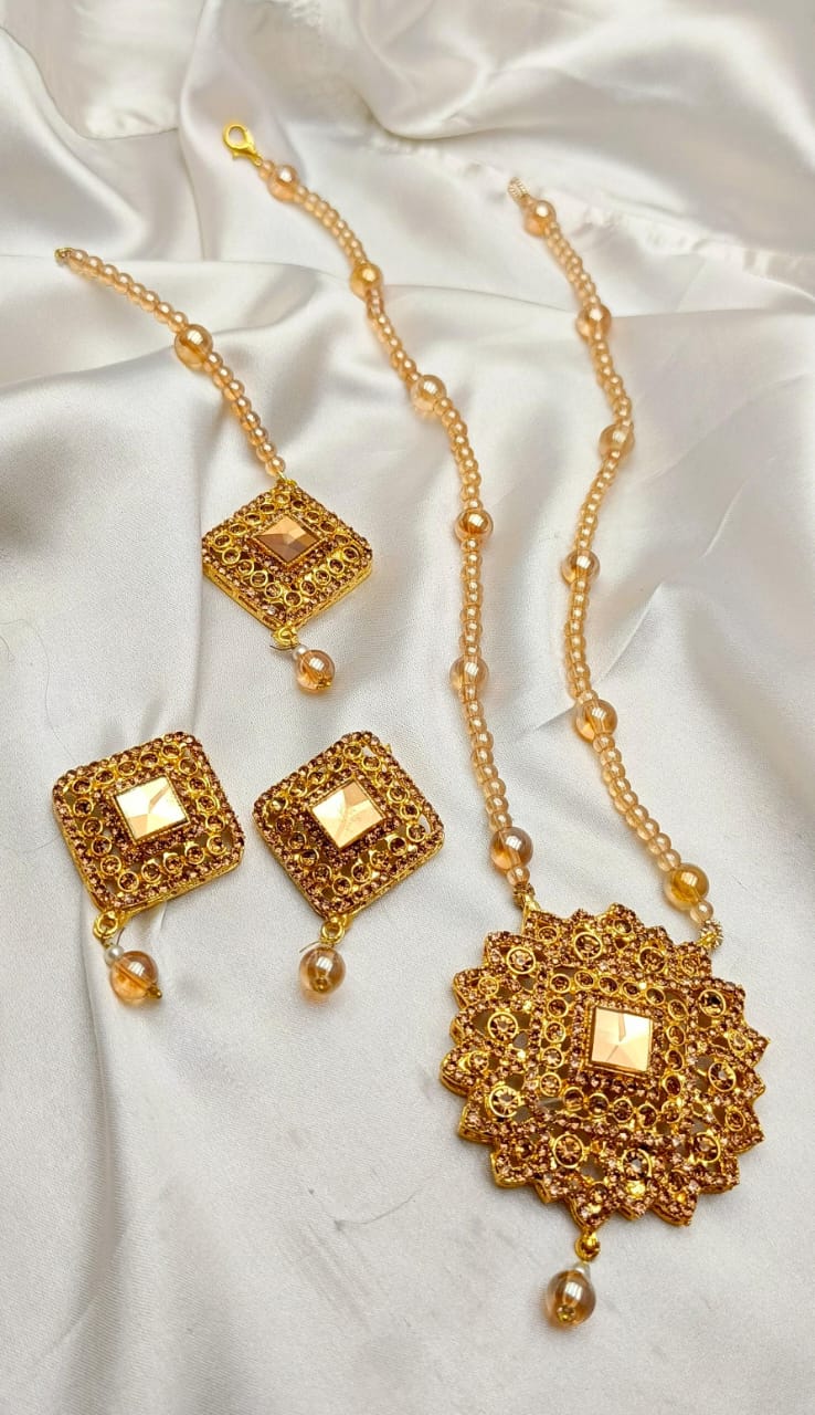 A Real Stone Maala Set is a traditional piece of jewelry designed using authentic, natural stones. These sets often include a maala (necklace) and complementary earrings, sometimes accompanied by additional accessories like bangles or a maang tikka. Here’s a detailed description: