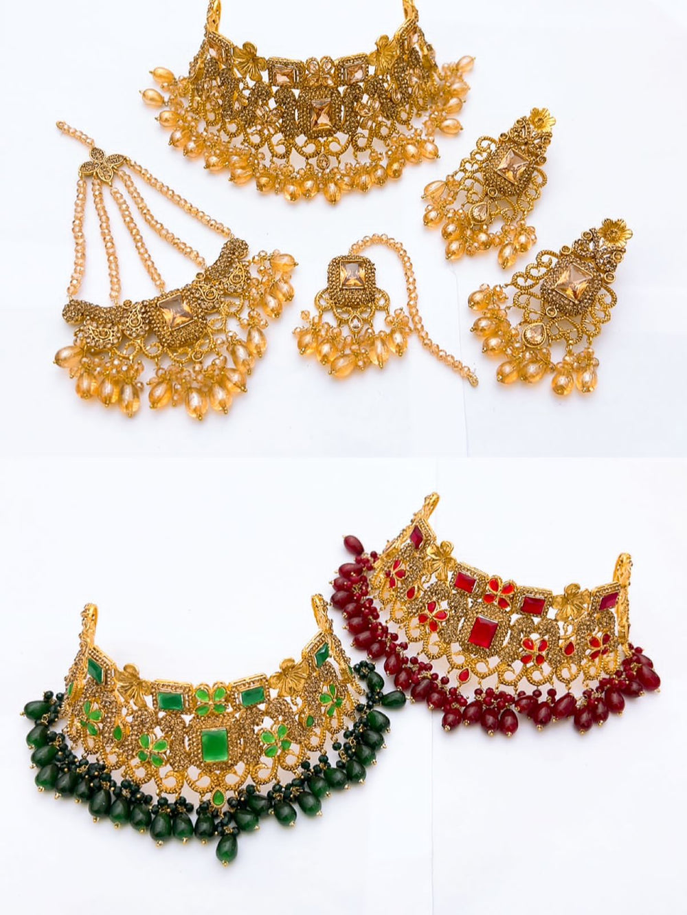 1. Necklace: A statement piece that could feature a combination of beads, stones, and metals, designed to sit beautifully around the bride's neck. Often adorned with symbolic motifs like floral or geometric patterns.