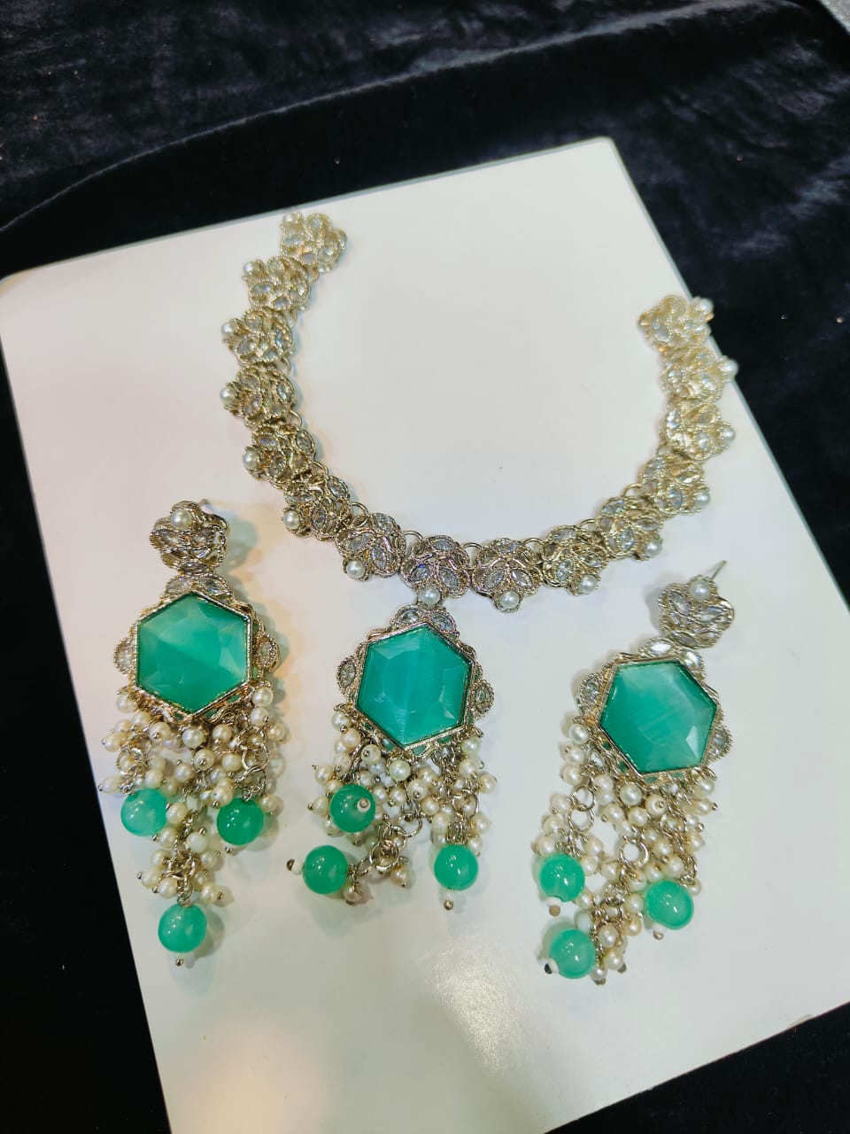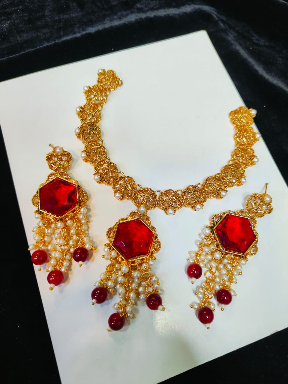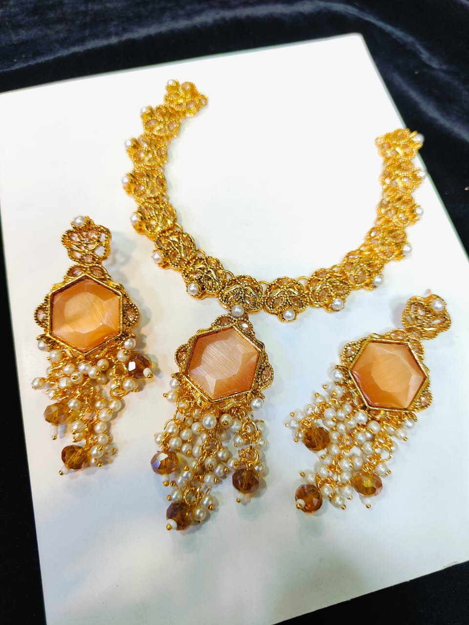 A Necklace Set with Stone Jewellery typically includes a matching combination of a necklace and earrings, sometimes accompanied by additional pieces like a bracelet or ring. These sets are often adorned with various types of stones that enhance their beauty. Here's a detailed description: