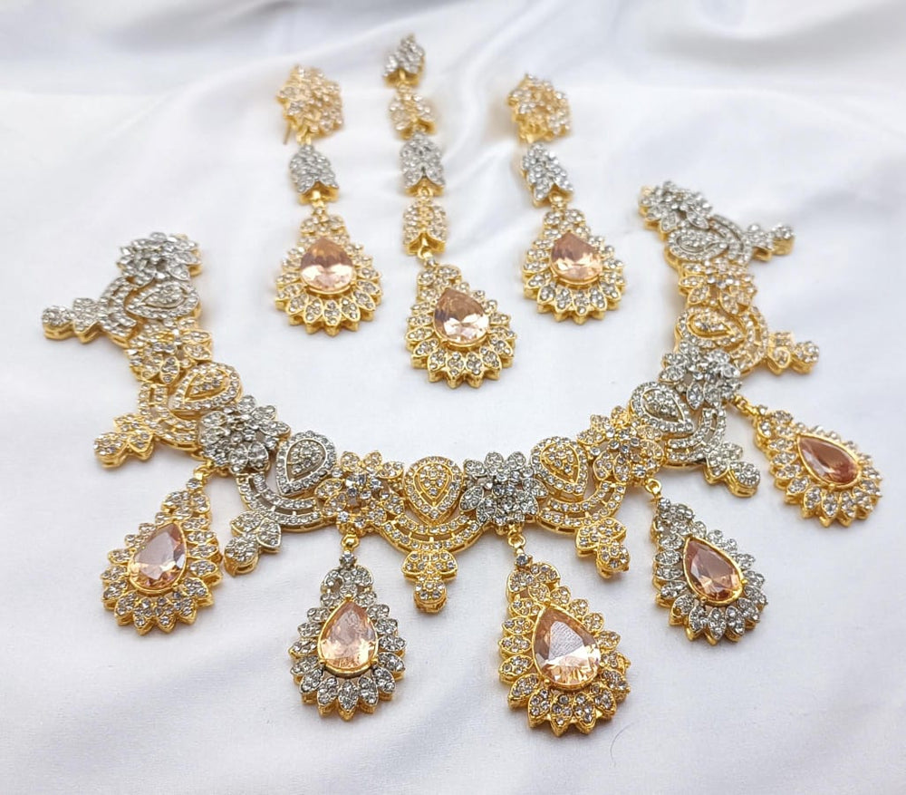 A gold-polished necklace set is an exquisite piece of jewelry designed to add elegance and charm to any outfit. It typically includes: