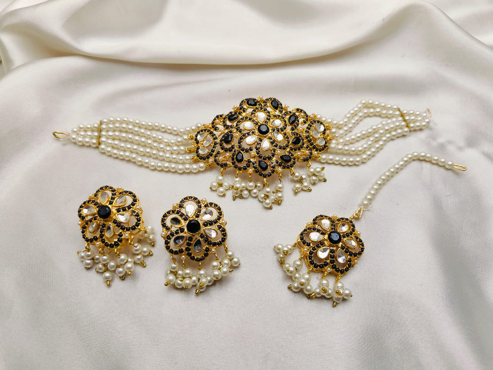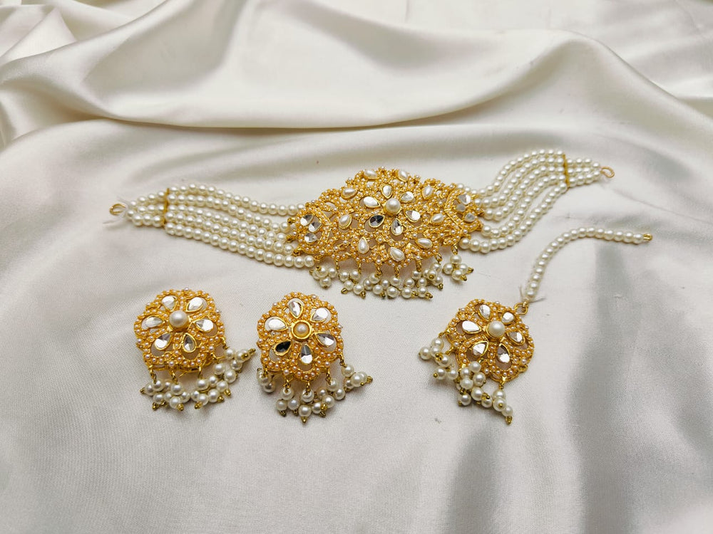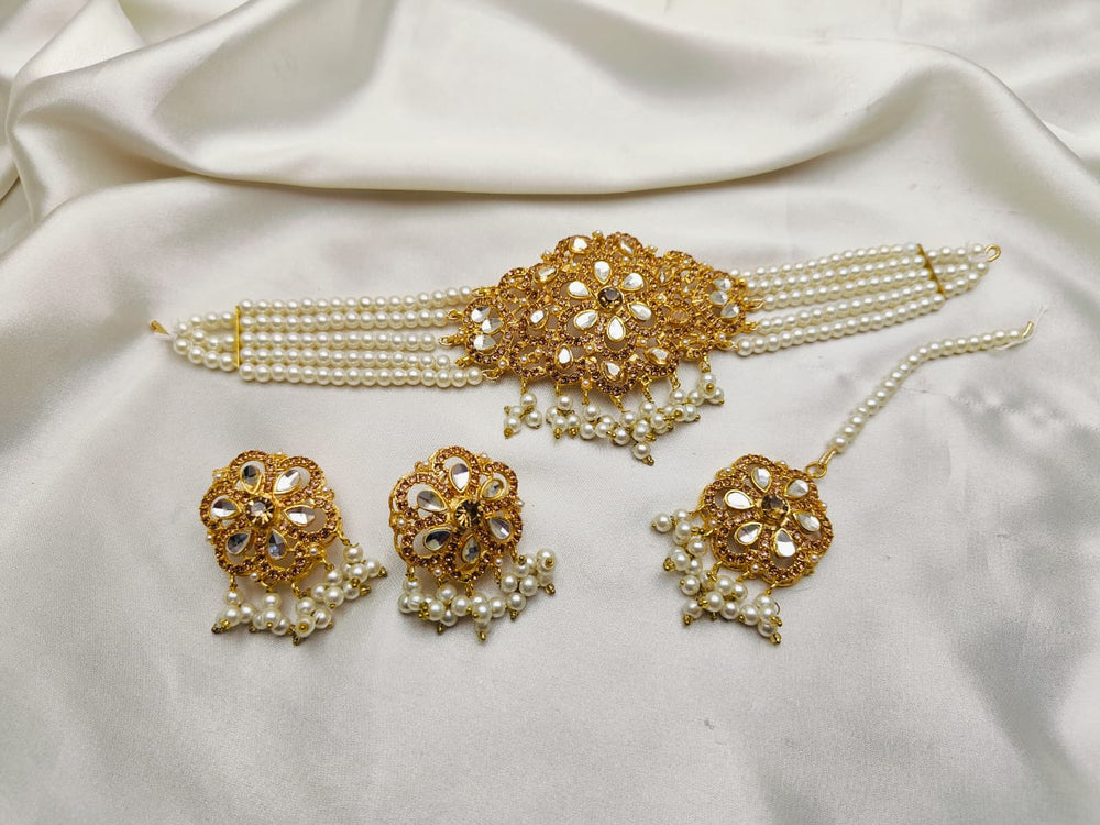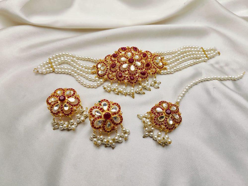 The choker sits snugly around the neck, often featuring intricate designs inspired by Mughal, Rajasthani, or antique styles. Common motifs include floral patterns, paisleys, or geometric shapes.