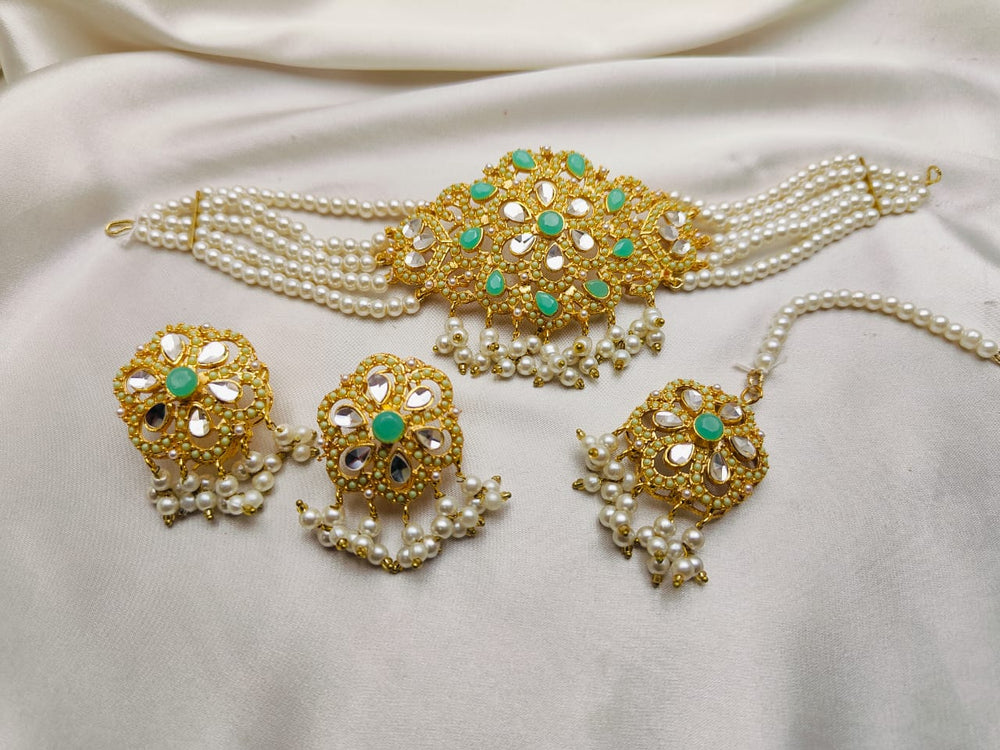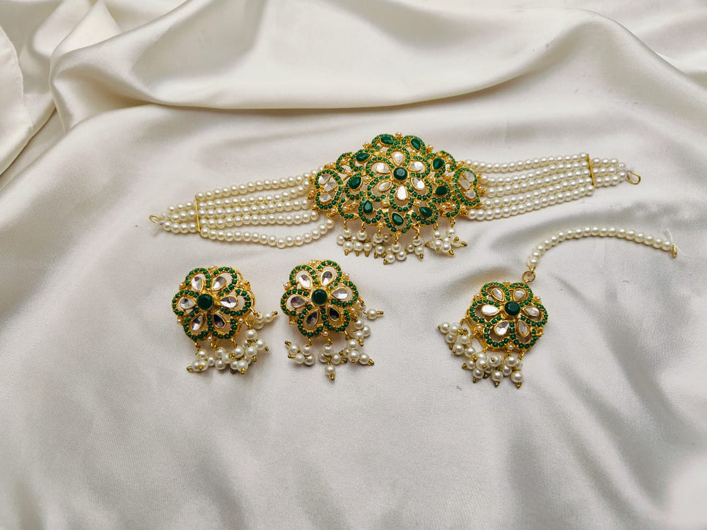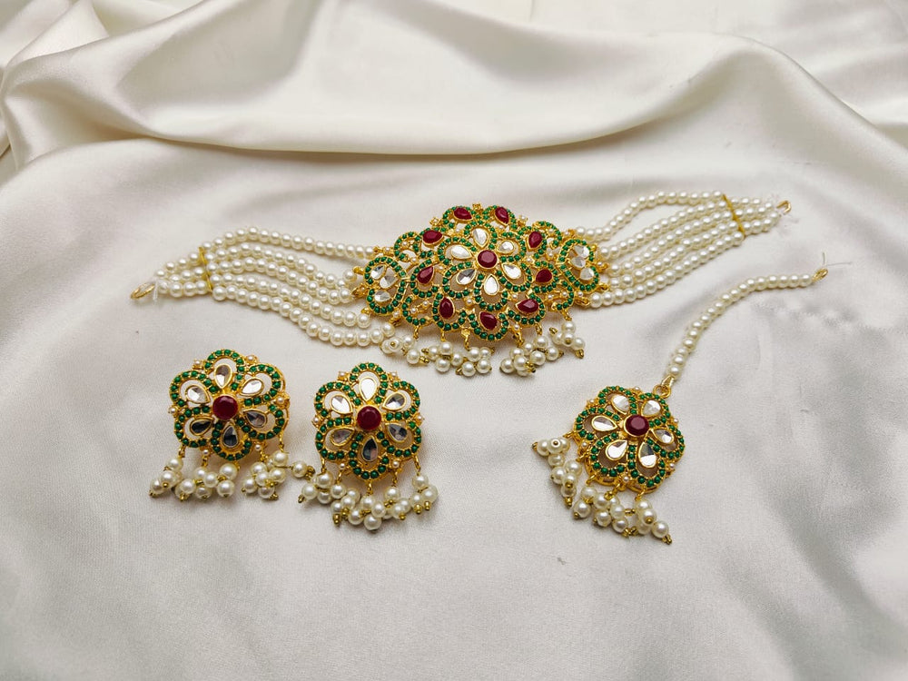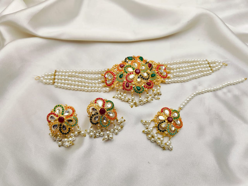 A Norantan Choker Set is a traditional jewelry set that showcases exquisite craftsmanship, typically originating from South Asia, particularly India and Pakistan. The set usually includes a choker necklace and matching earrings, designed to complement traditional outfits like sarees, lehengas, or salwar kameez.