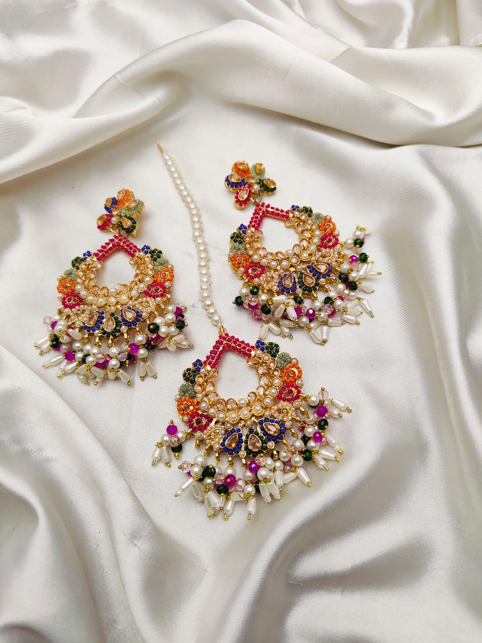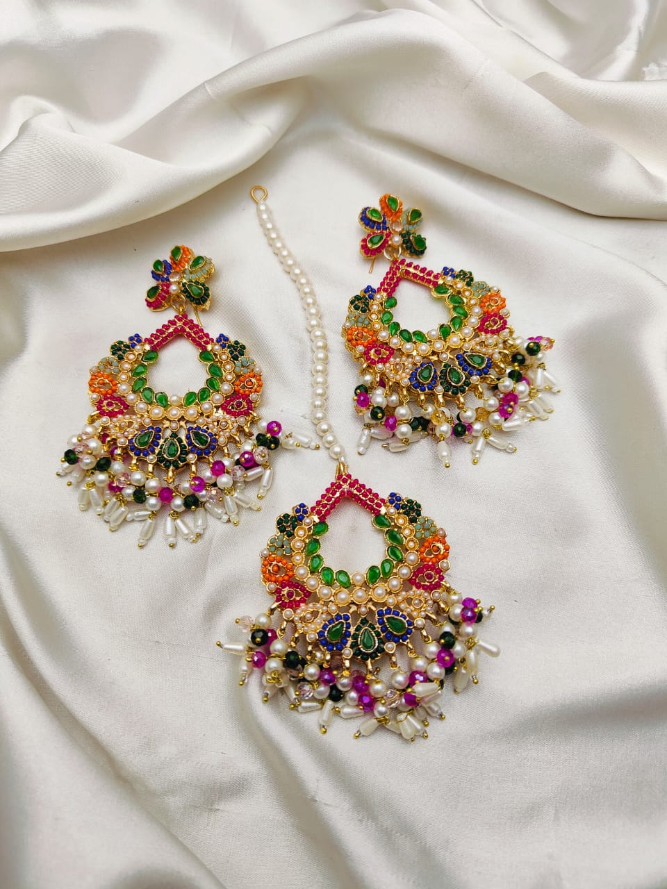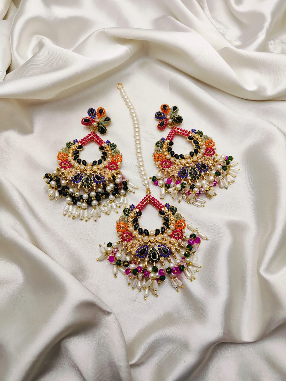 Norantan Tika and earrings are a beautiful and intricate set of traditional jewelry, commonly worn in South Asian cultures, particularly for weddings, festivals, or special occasions. Here's a detailed description: