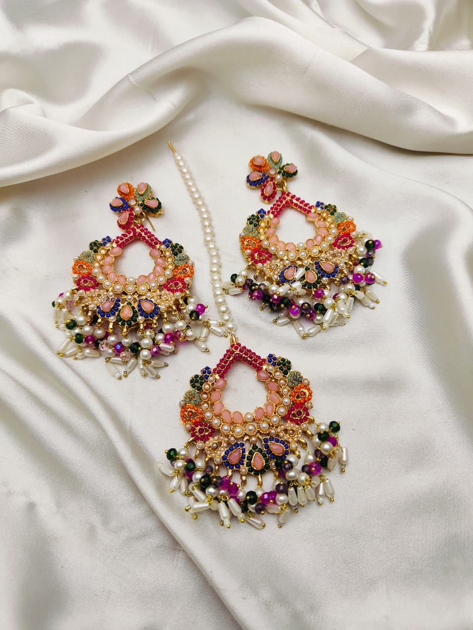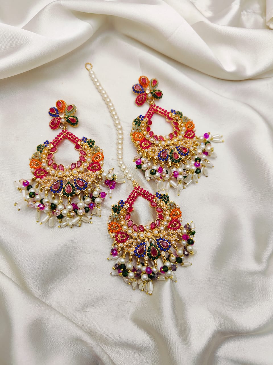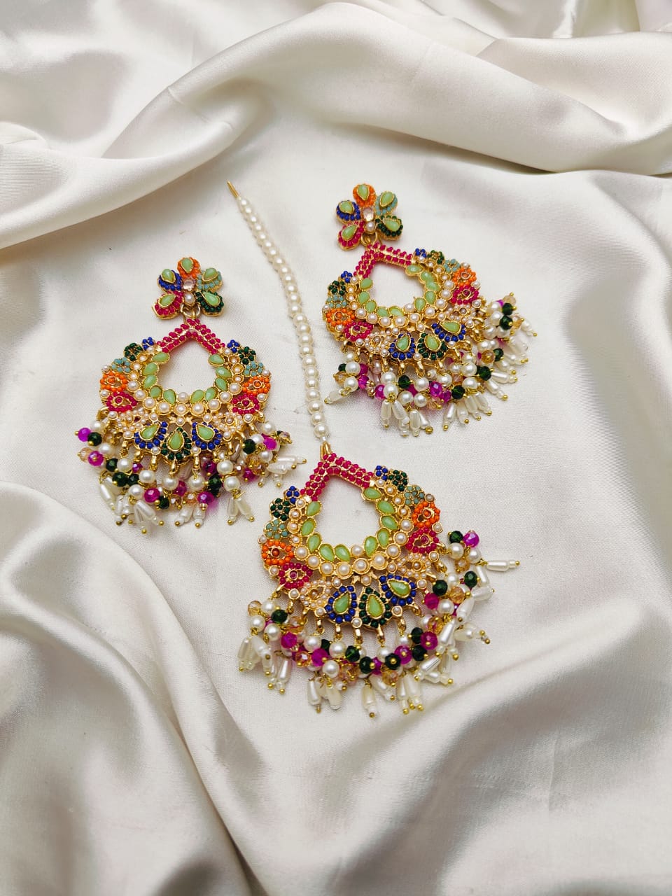 Norantan Tika and earrings are a beautiful and intricate set of traditional jewelry, commonly worn in South Asian cultures, particularly for weddings, festivals, or special occasions. Here's a detailed description: