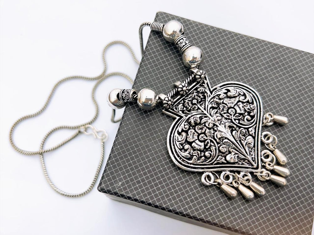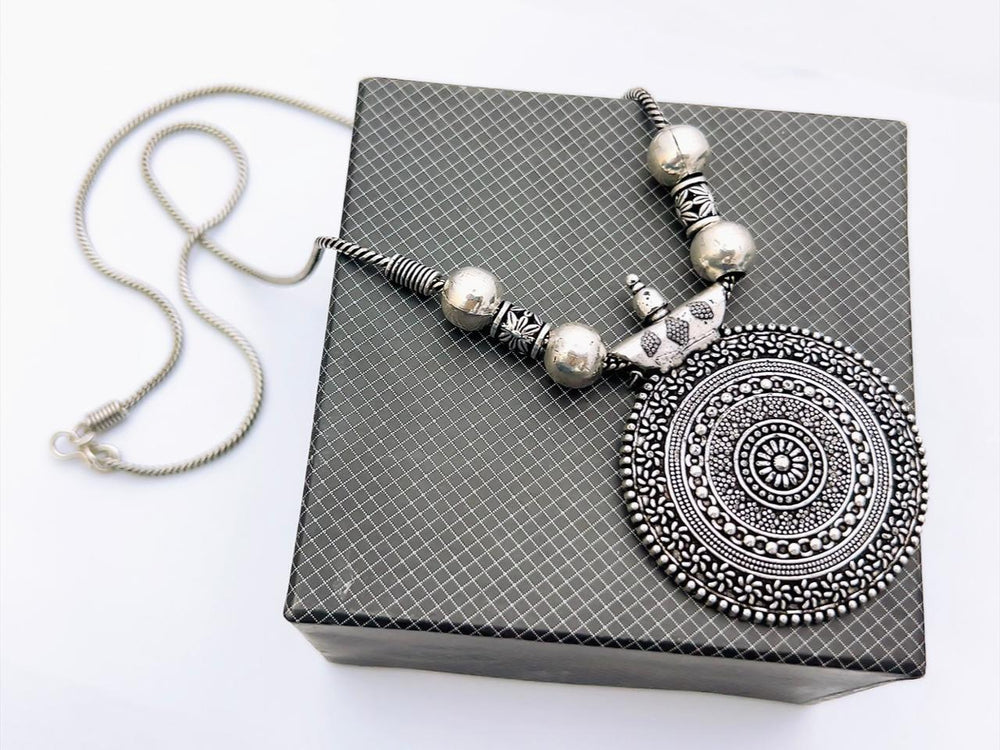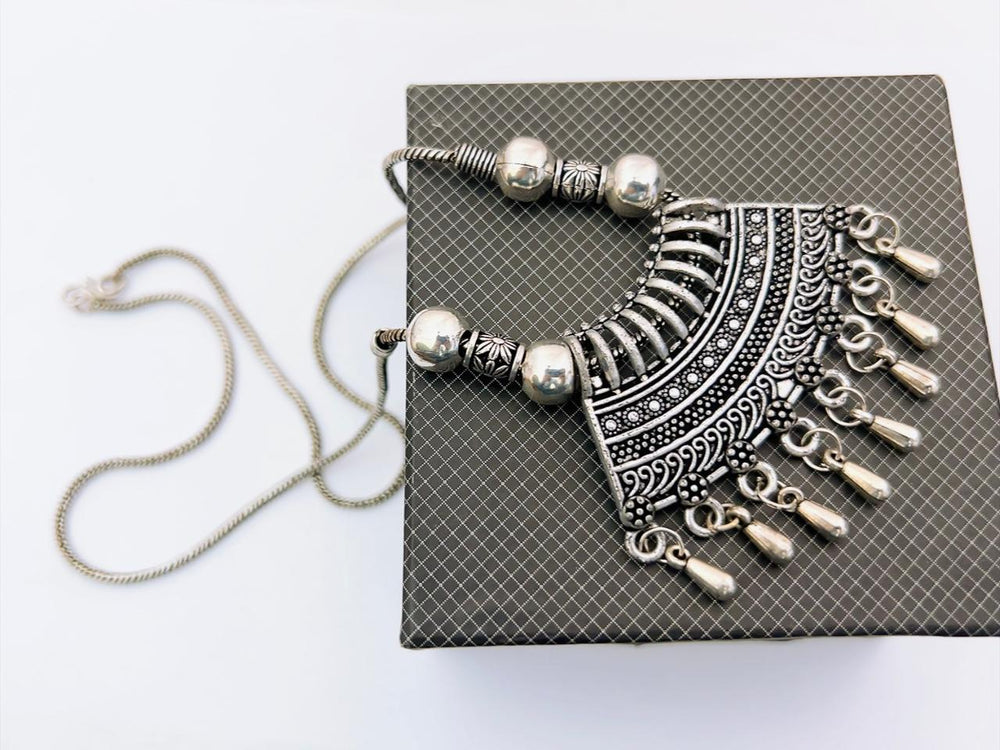 Oxidized mala fine quality jewelry typically refers to a type of ornament crafted with an antique or vintage finish achieved through an oxidation process. These malas are popular for their intricate designs, durability, and aesthetic appeal. Here's a detailed description: