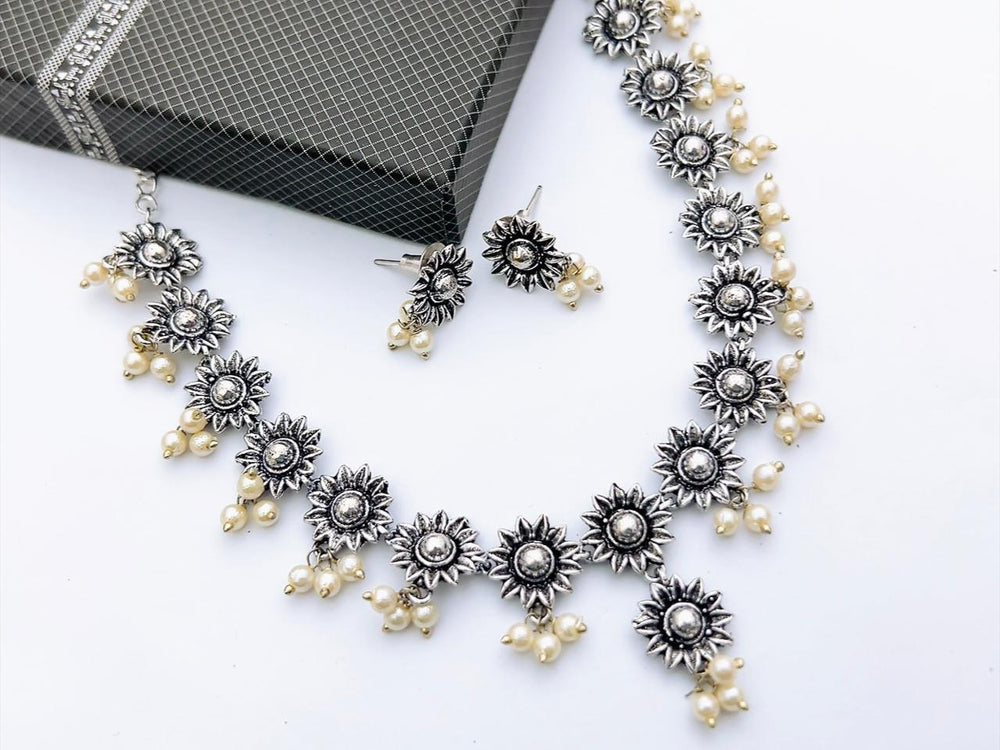 Oxidized mala fine quality jewelry typically refers to a type of ornament crafted with an antique or vintage finish achieved through an oxidation process. These malas are popular for their intricate designs, durability, and aesthetic appeal. Here's a detailed description: