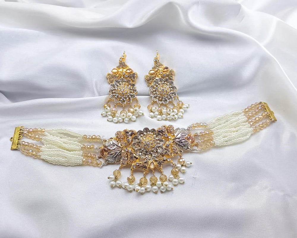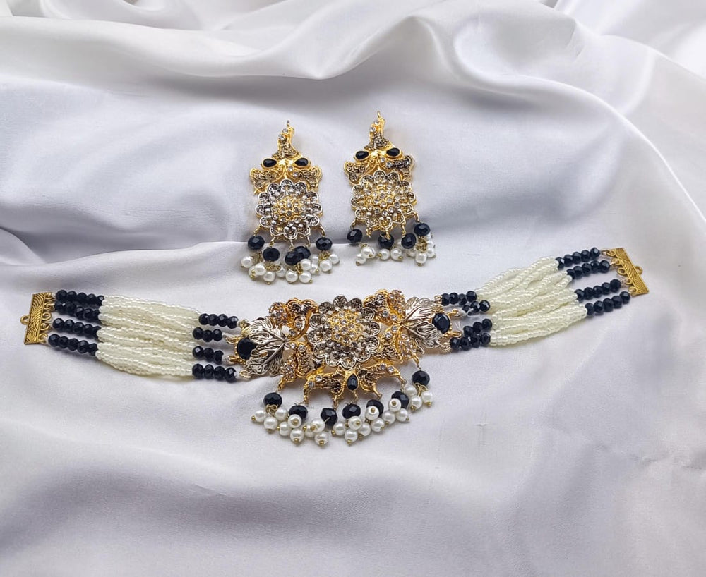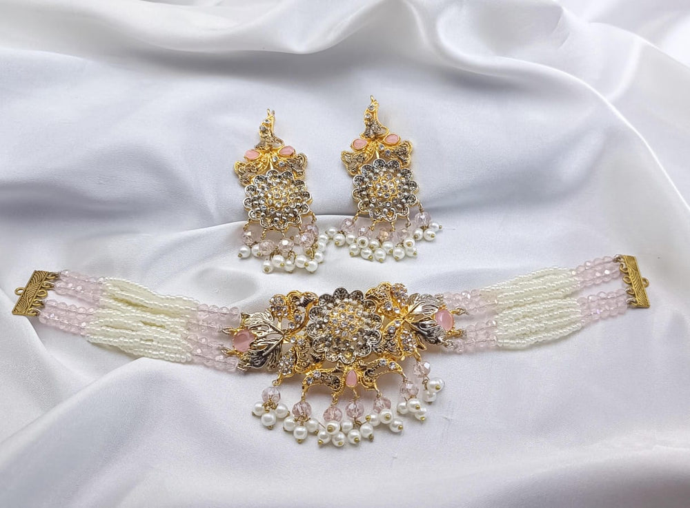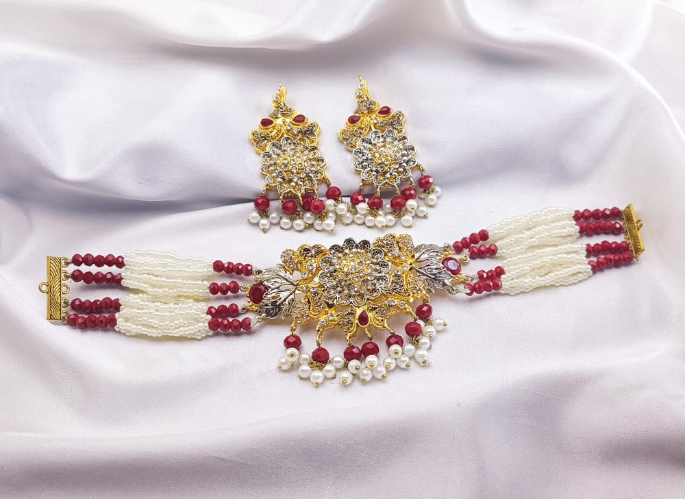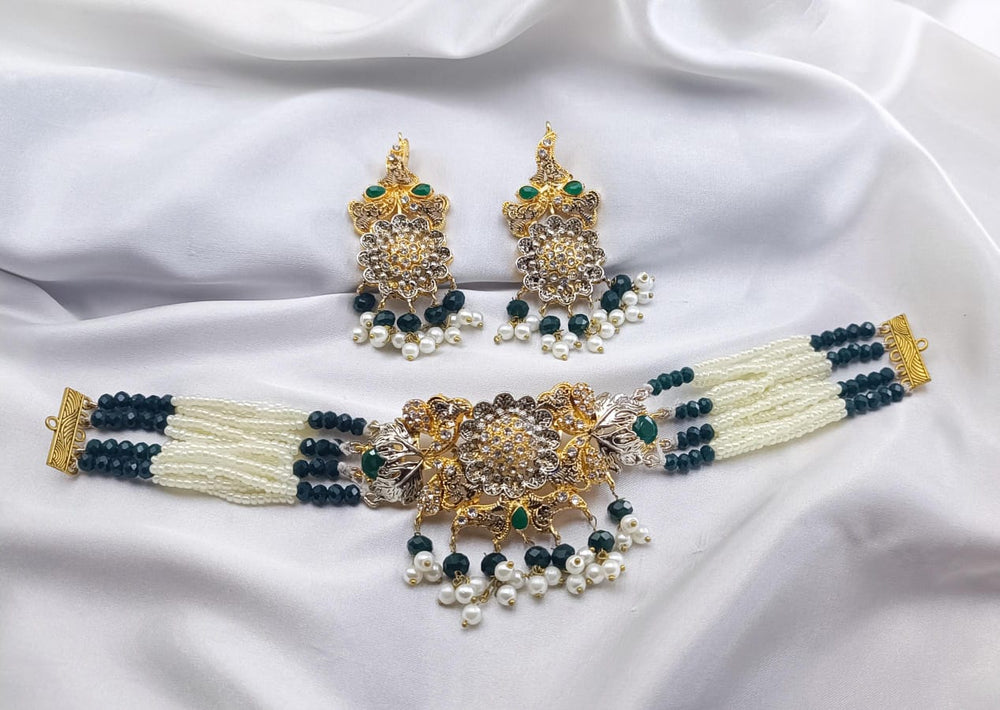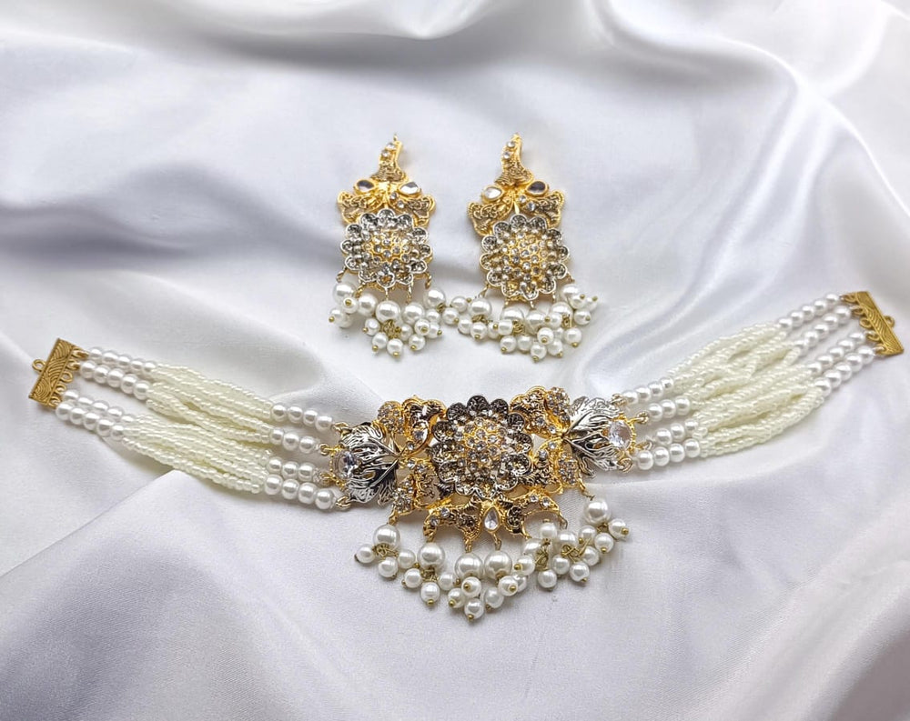 Choker Design: A close-fitting band adorned with lustrous, perfectly round white pearls, offering a classic yet contemporary appeal.