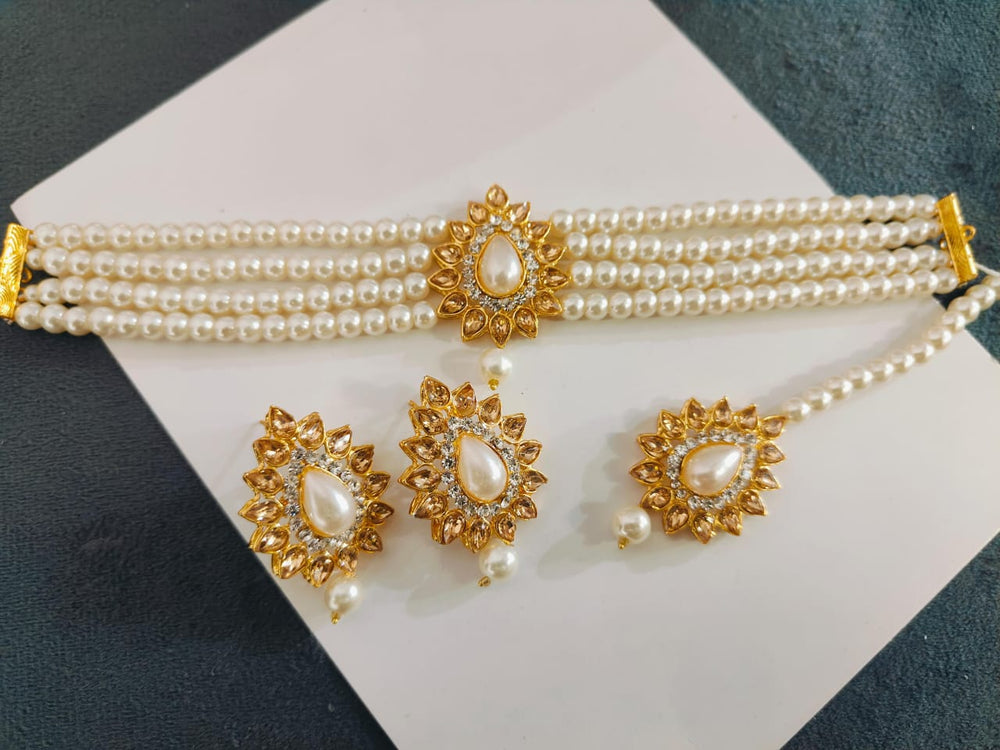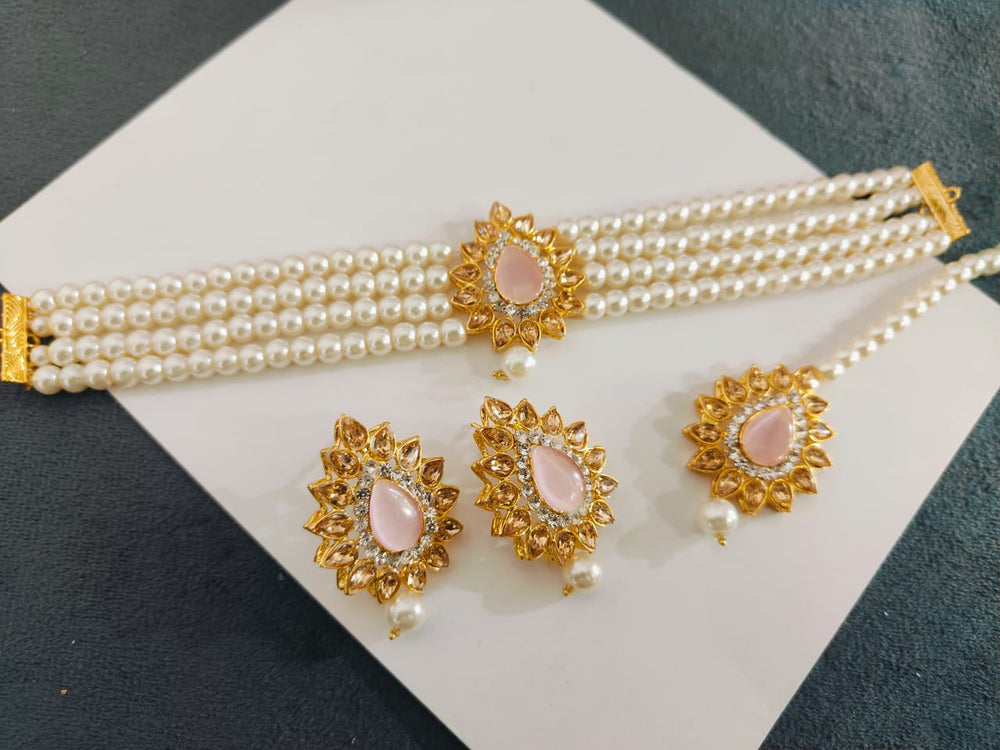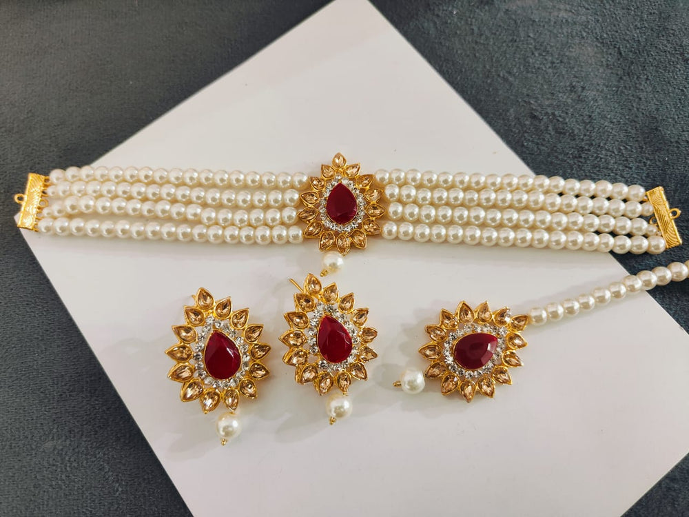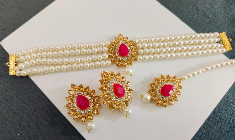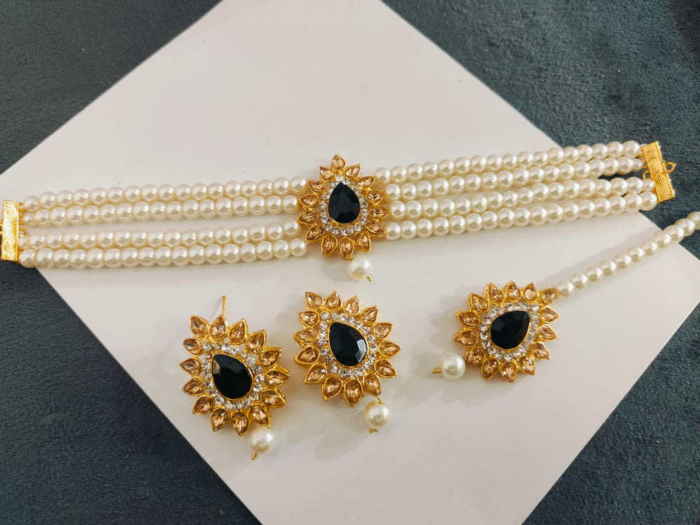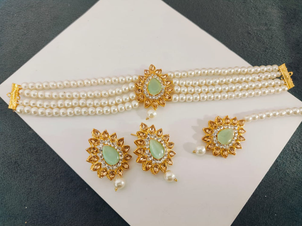 1. Design: A choker necklace sits snugly around the neck and is often crafted with intricate detailing. The centerpiece of the set may feature embellishments like floral, geometric, or traditional motifs.