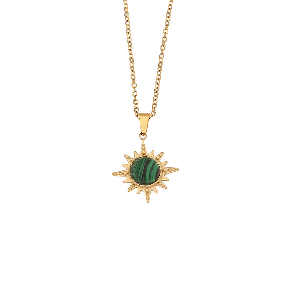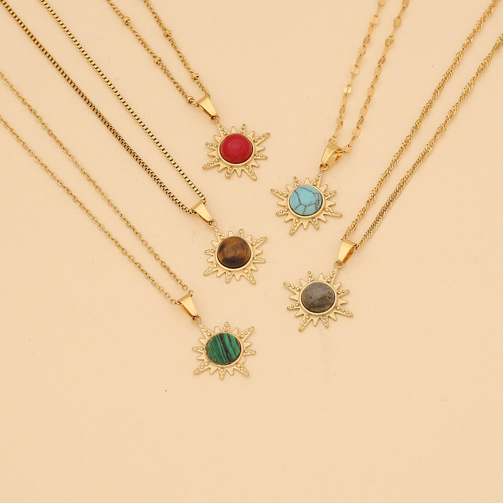 Add a touch of cosmic energy to your everyday look with our Sunburst Gemstone Collection. These stunning necklaces feature a radiant sun-inspired pendant, crafted from high-quality gold-finished stainless steel and centered with a vibrant natural-look stone.