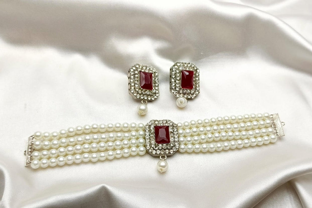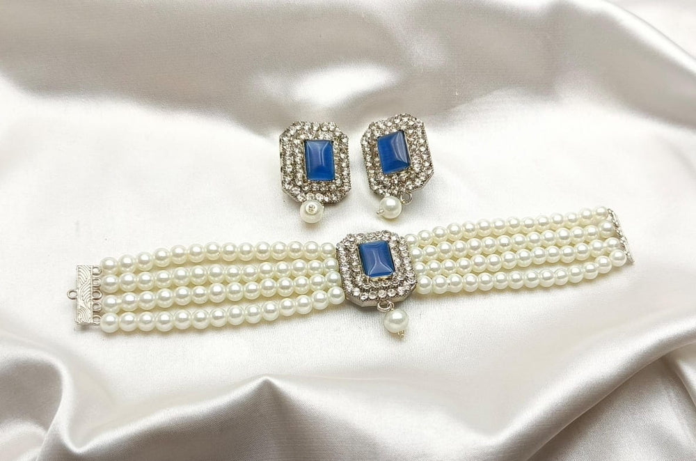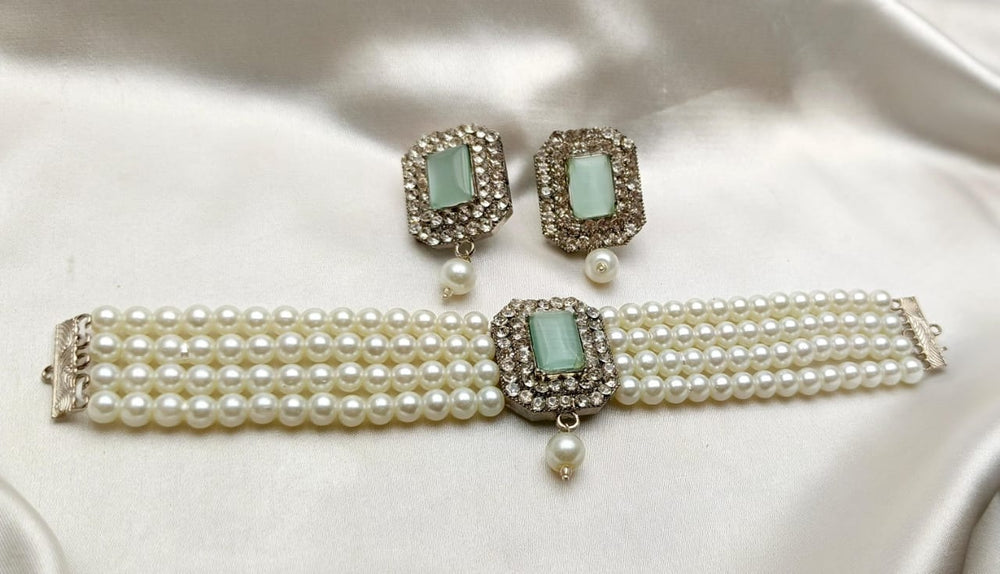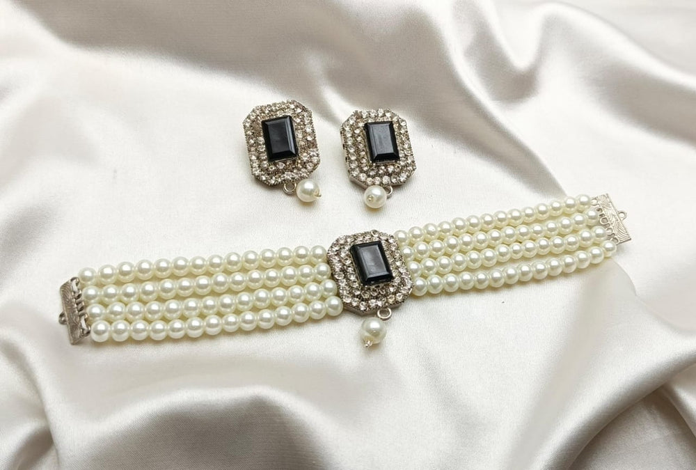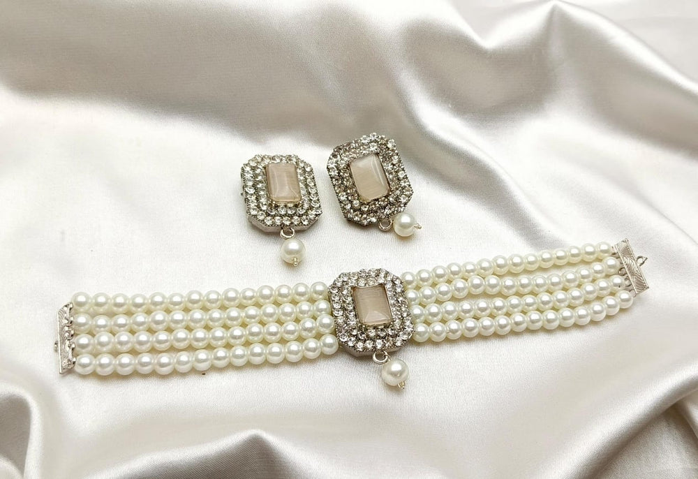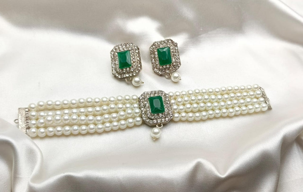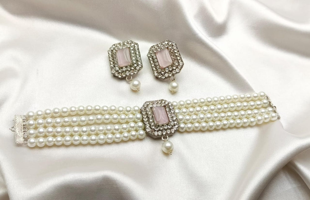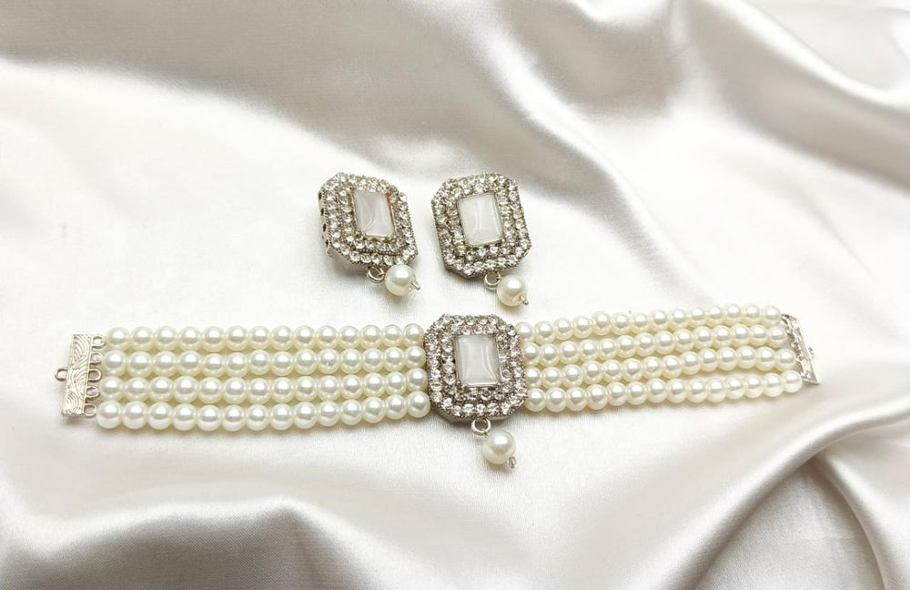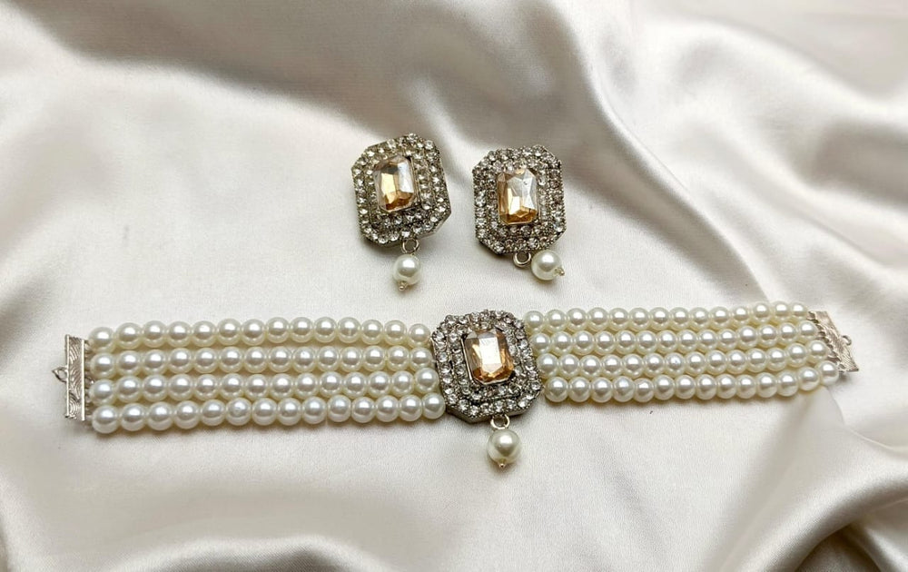 A simple white pearls choker is an elegant piece of jewelry that features a strand of uniformly sized, lustrous white pearls arranged closely to sit snugly around the neck. The pearls are typically round or slightly oval, with a smooth surface and a radiant finish. The choker often includes a secure clasp, such as a lobster claw or a hook-and-eye closure, made from silver, gold, or platinum, to add durability and style.
