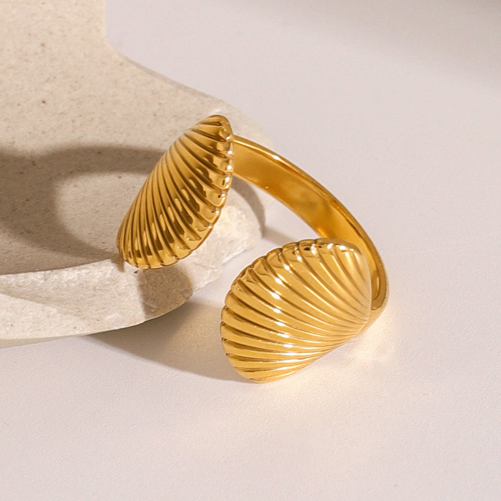 Channel coastal elegance with this distinctive Seashell Wrap Ring. Its open-back design features two beautifully textured, ridged seashell motifs that gracefully embrace the finger. This piece is expertly crafted from durable Gold-Toned Stainless Steel, ensuring it is tarnish-resistant and hypoallergenic for long-lasting wear—a stylish addition to your artificial jewelry collection.