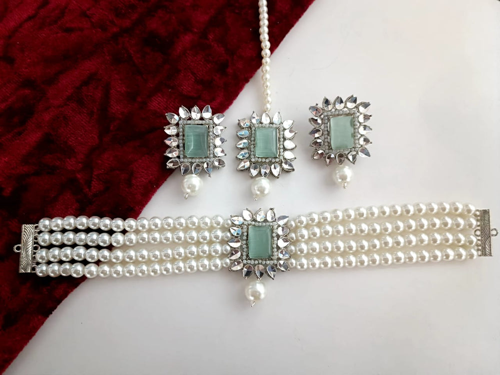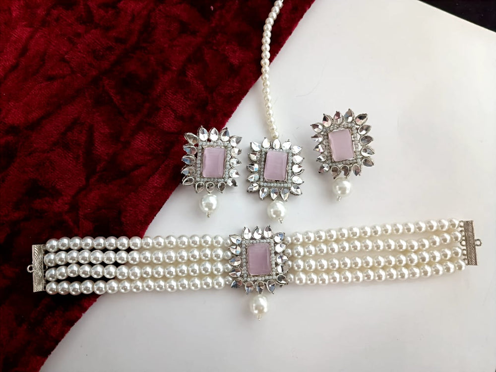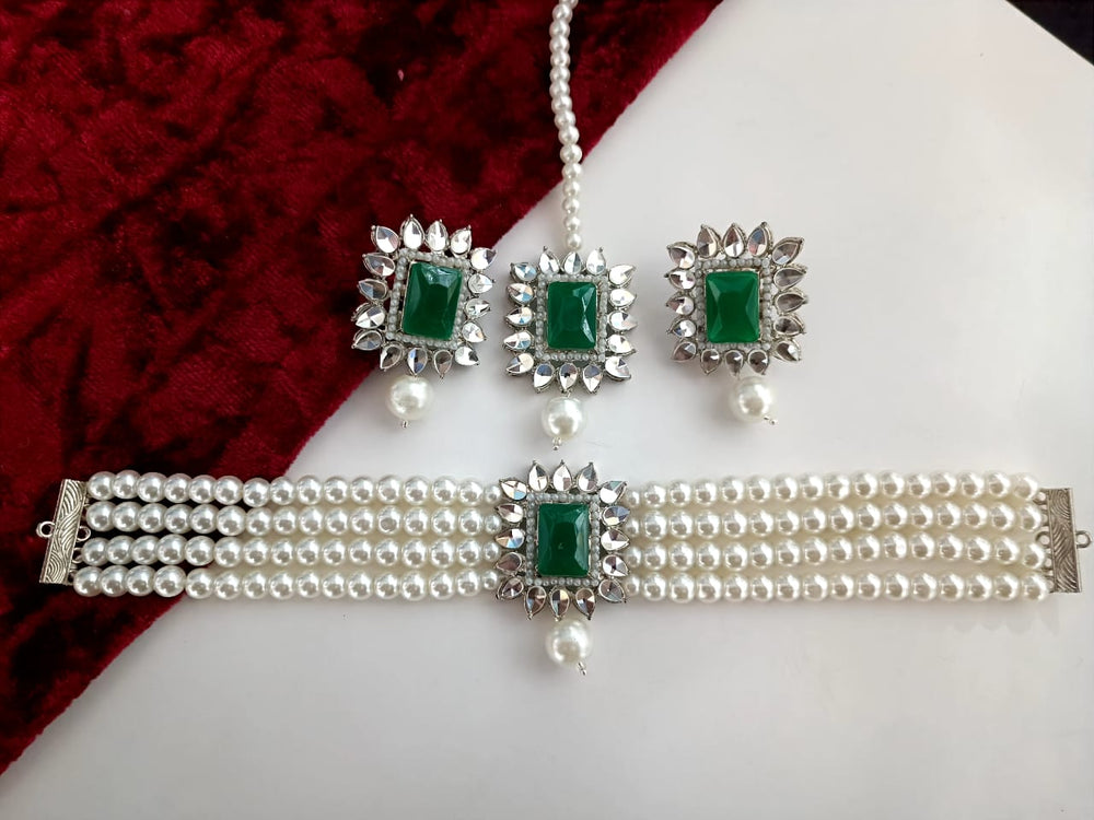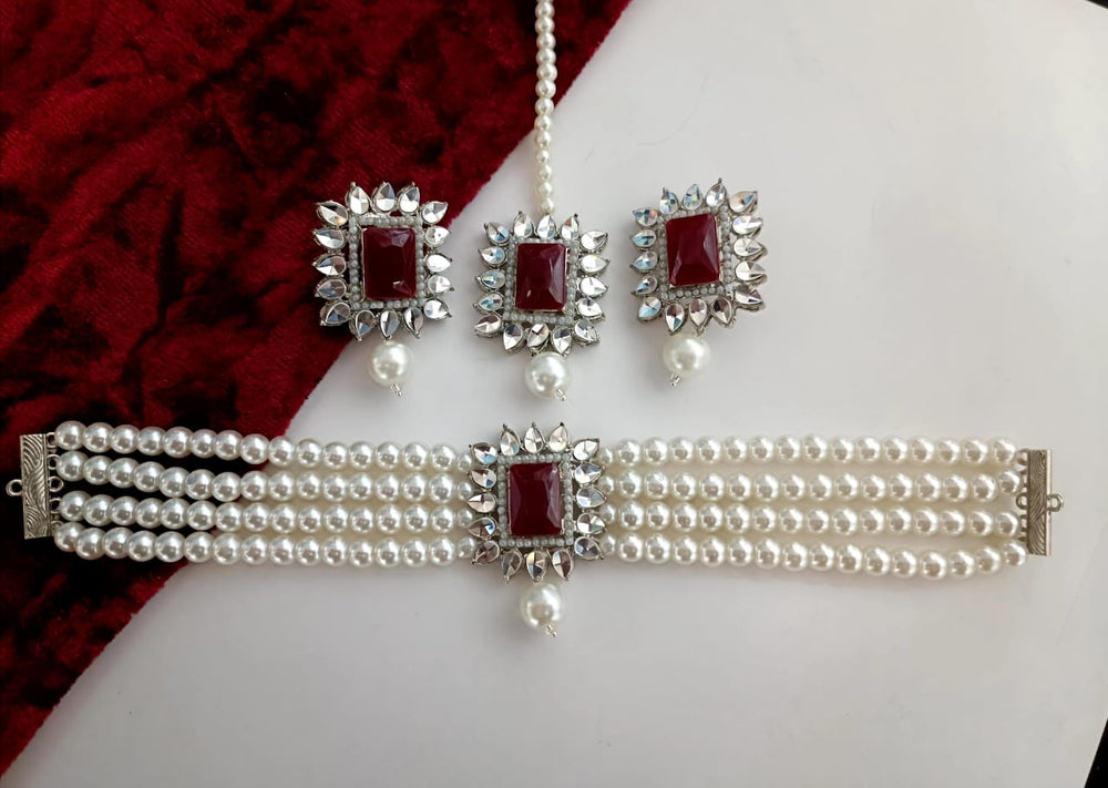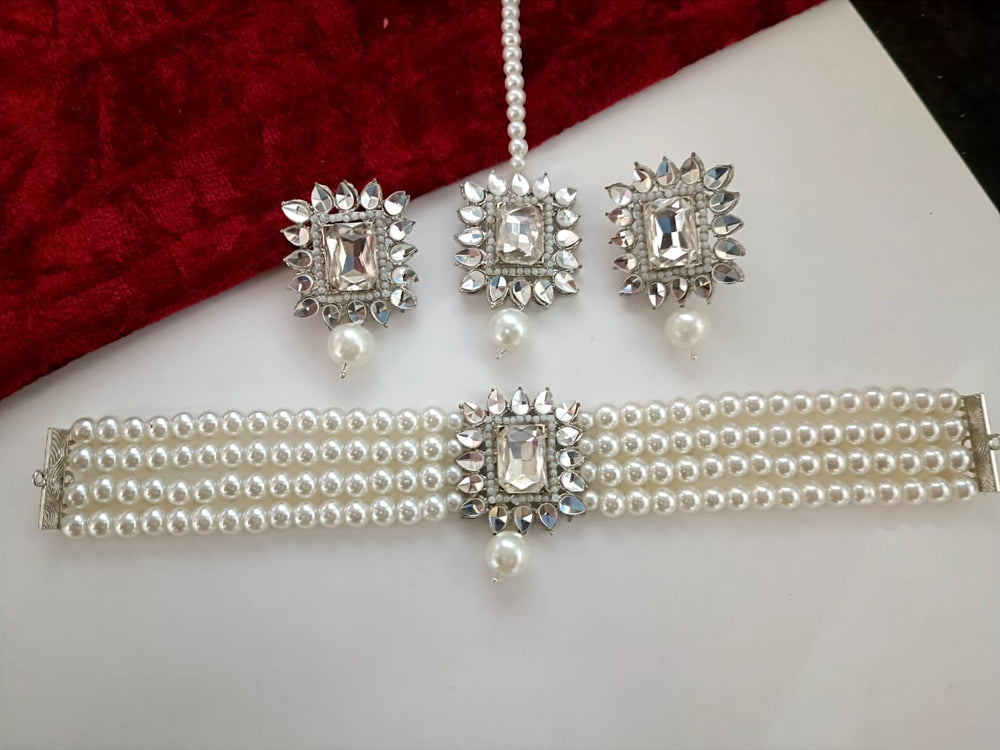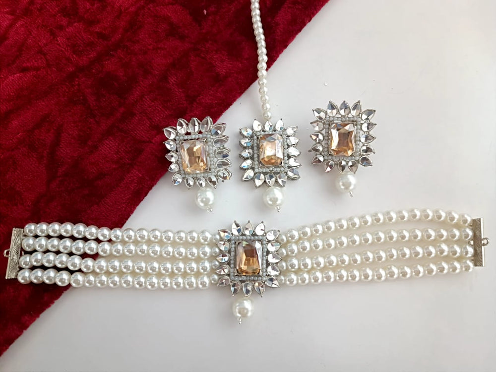 A choker set with white pearls typically includes a short necklace that sits snugly around the neck, adorned with lustrous white pearls. The set often comes with complementary pieces such as matching earrings and sometimes a bracelet or a maang tikka (in traditional designs).