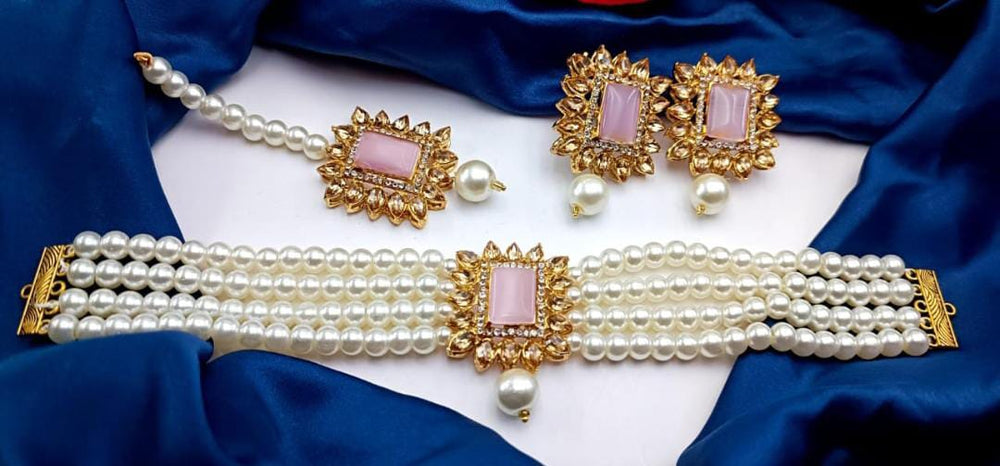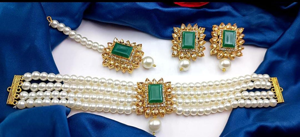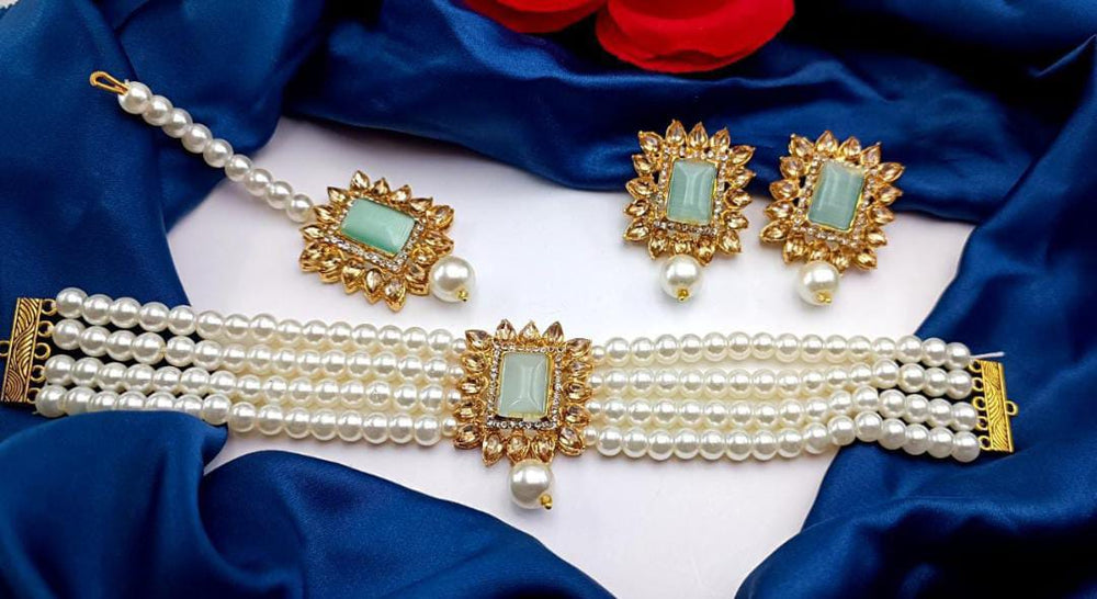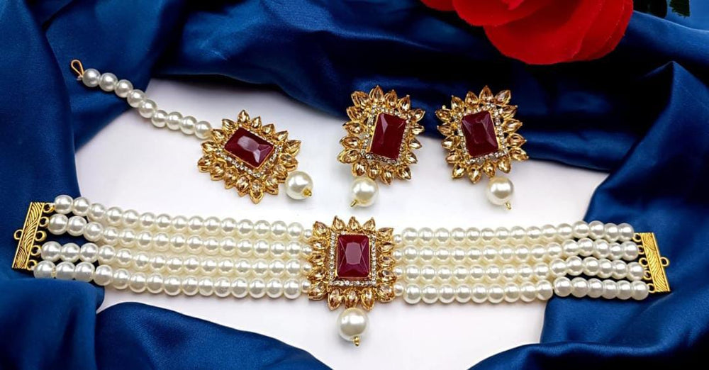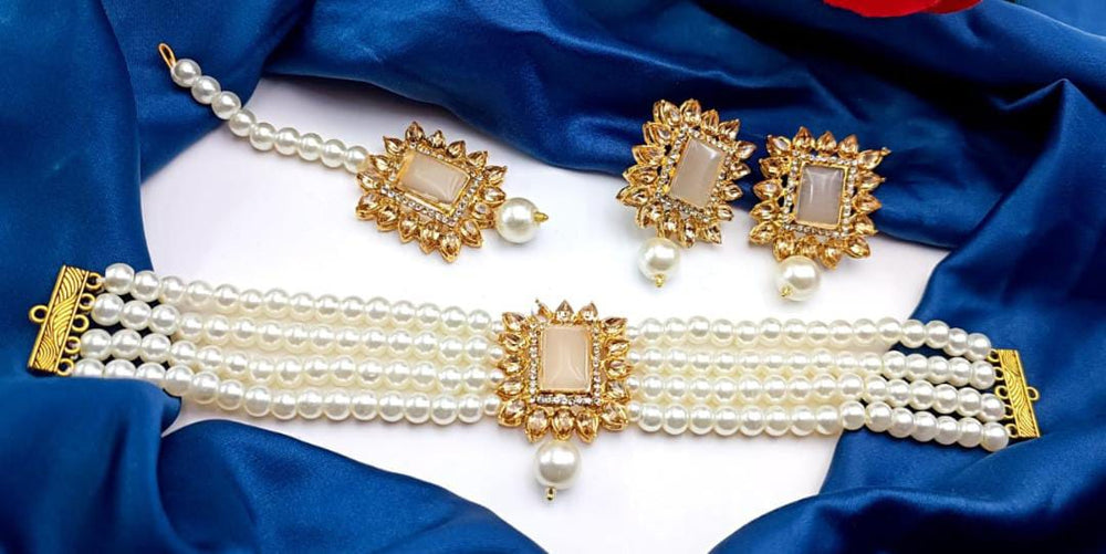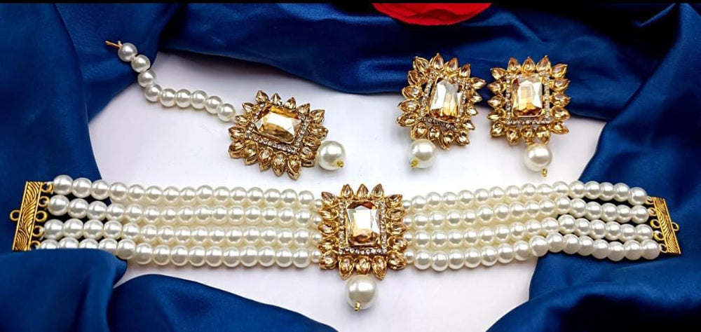 A White Pearls Choker Set is a classic and elegant jewelry piece designed to add a sophisticated touch to any outfit. It typically features a choker-style necklace made up of carefully strung white pearls, with each pearl radiating a soft luster. The pearls can be natural, cultured, or synthetic, offering a range of options for different budgets and preferences. The choker often sits snugly on the neck, providing a sleek and refined look.