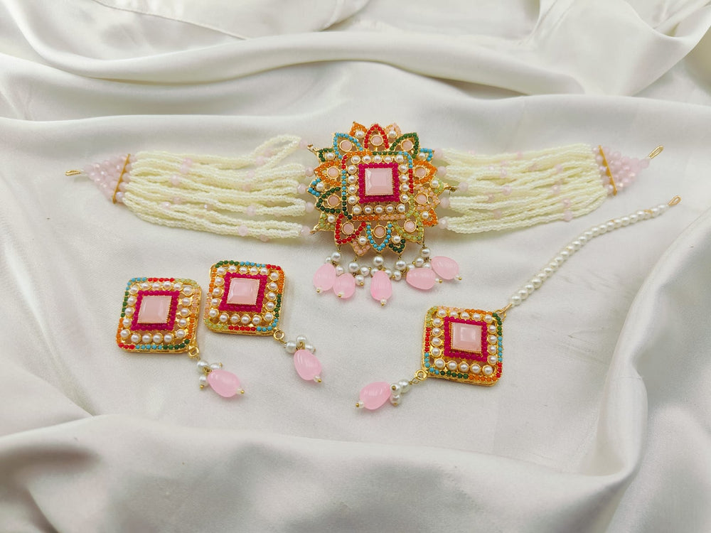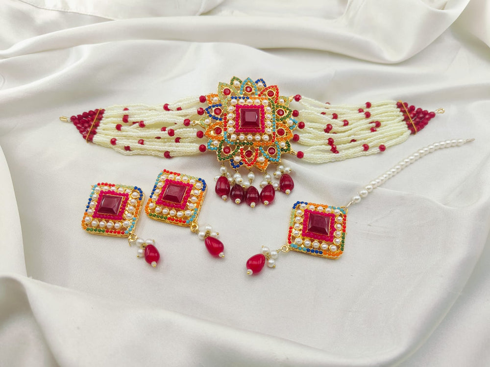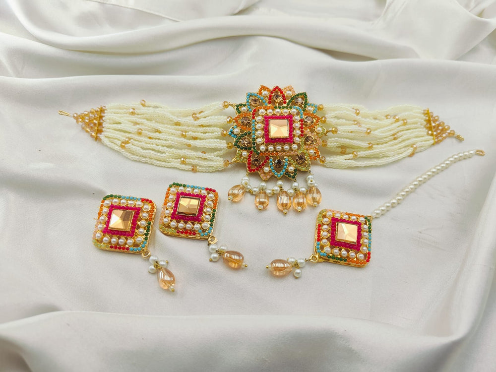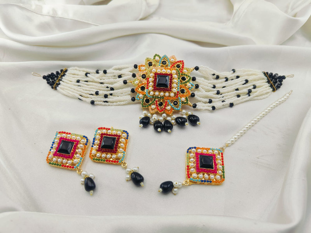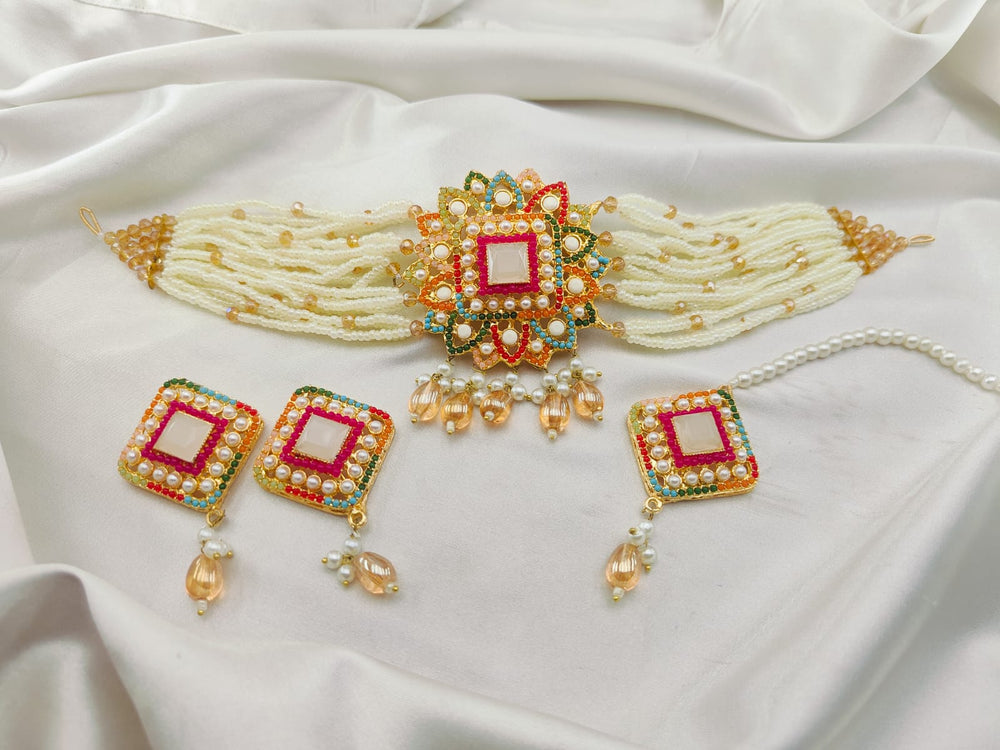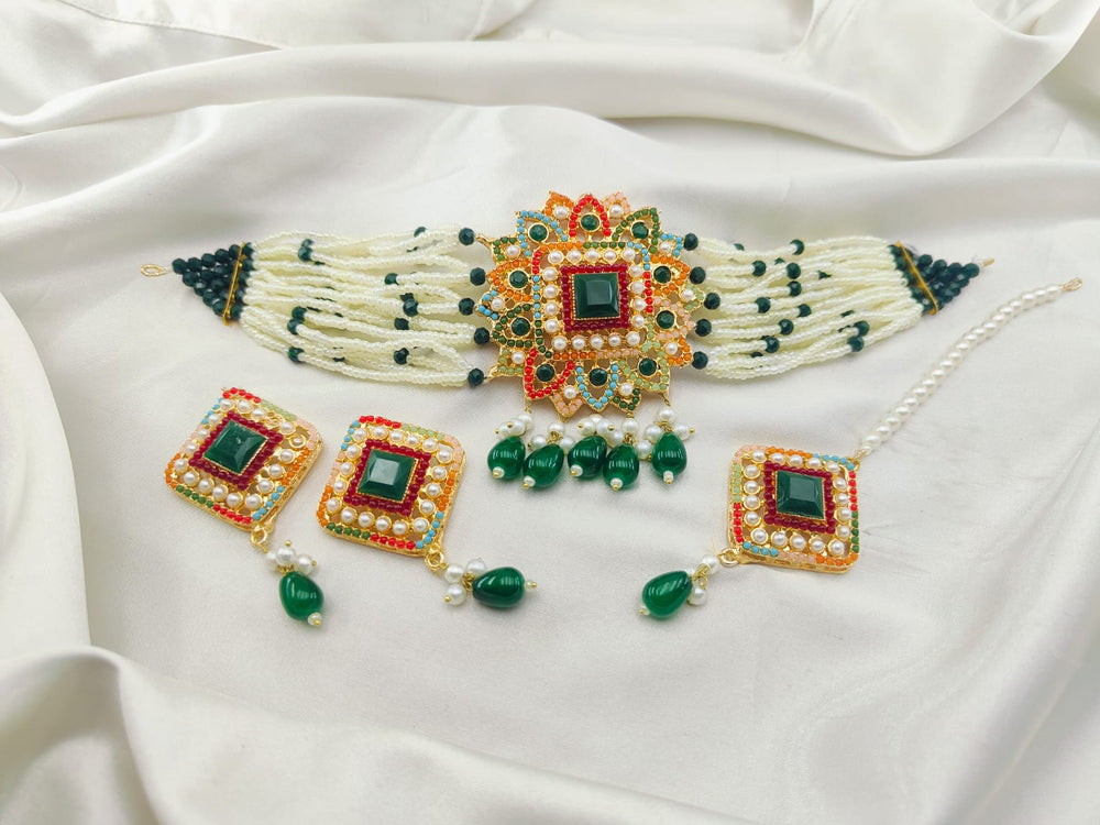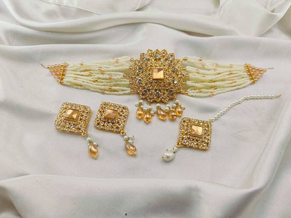 "Exquisite White Pearl Necklace Set: A timeless blend of elegance and sophistication, this set features a beautifully crafted white pearl necklace with perfectly rounded pearls radiating a natural luster. Paired with matching pearl earrings, this set is ideal for weddings, formal occasions, or as a statement piece for everyday luxury. The secure clasp ensures a comfortable fit, while the classic design complements any outfit, making it a cherished addition to your jewelry collection.