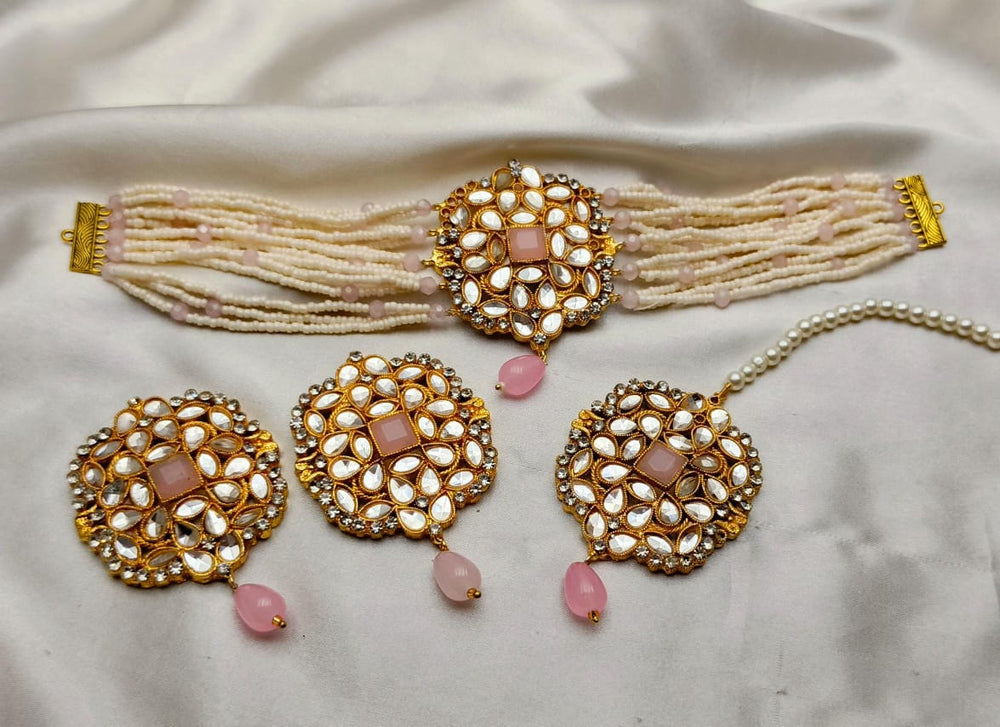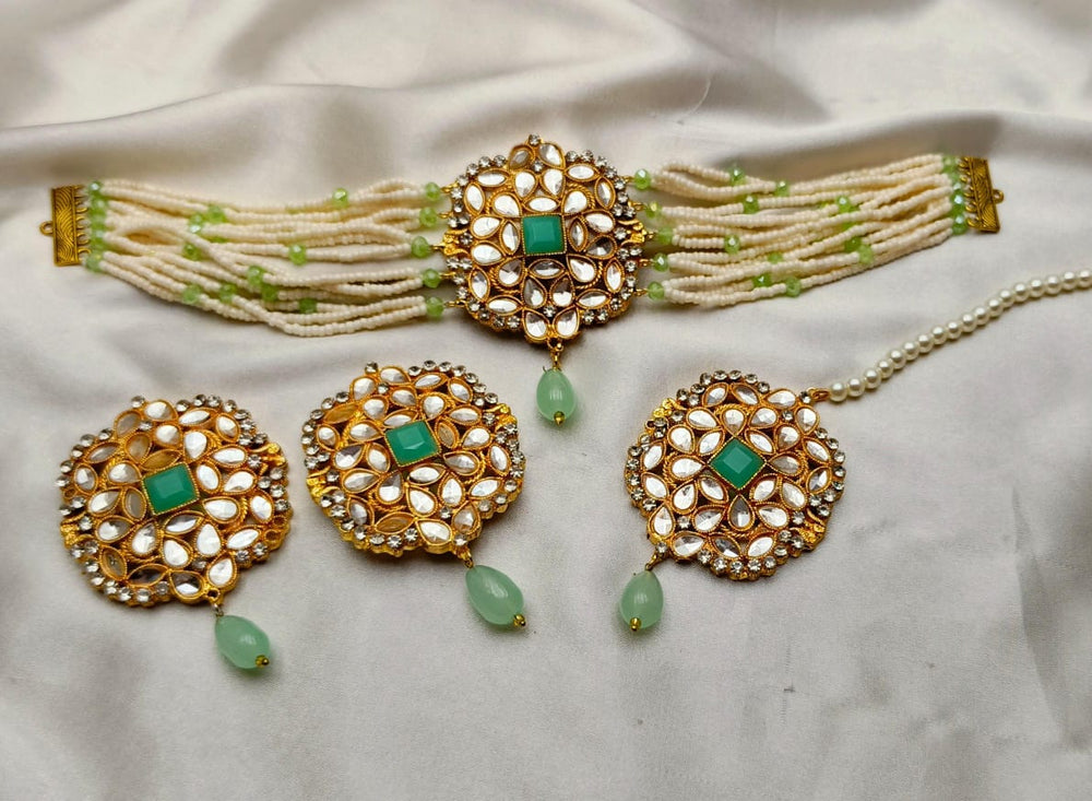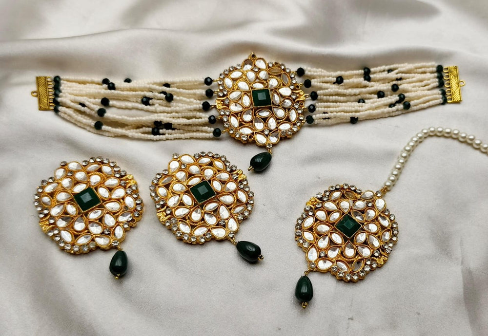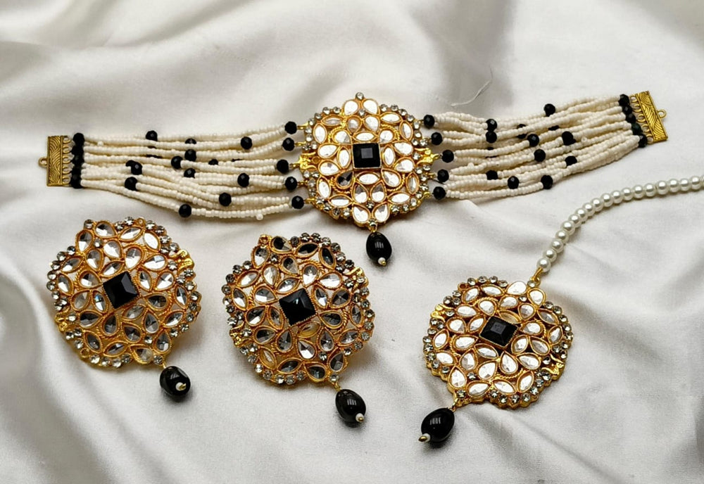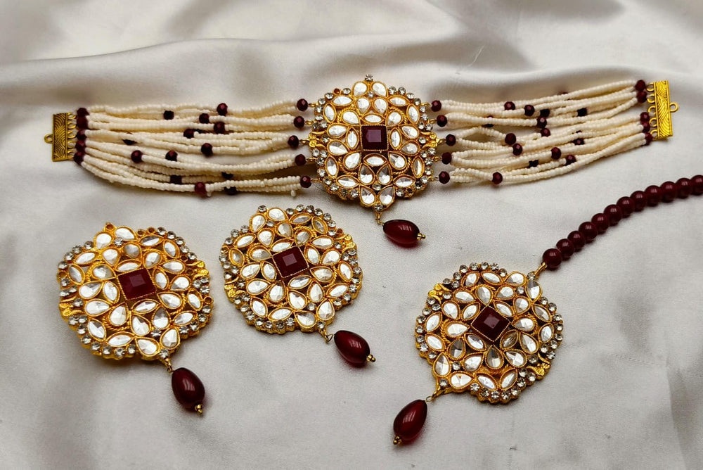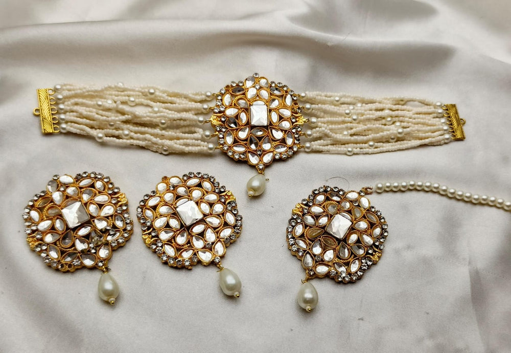 A white pearl necklace set typically consists of a strand of lustrous, polished white pearls, known for their elegant and timeless appeal. The pearls can be arranged in various styles, such as a single strand, multi-strand, or choker style, and may feature different pearl sizes and shapes, including round, oval, or baroque. The set may also include matching earrings, often designed as simple studs or drop earrings, featuring a single pearl or clusters of smaller pearls. The necklace and earrings are often set in precious metals like sterling silver, gold, or platinum, enhancing the overall sophistication of the design. White pearls are classic symbols of elegance and purity, making this set an ideal