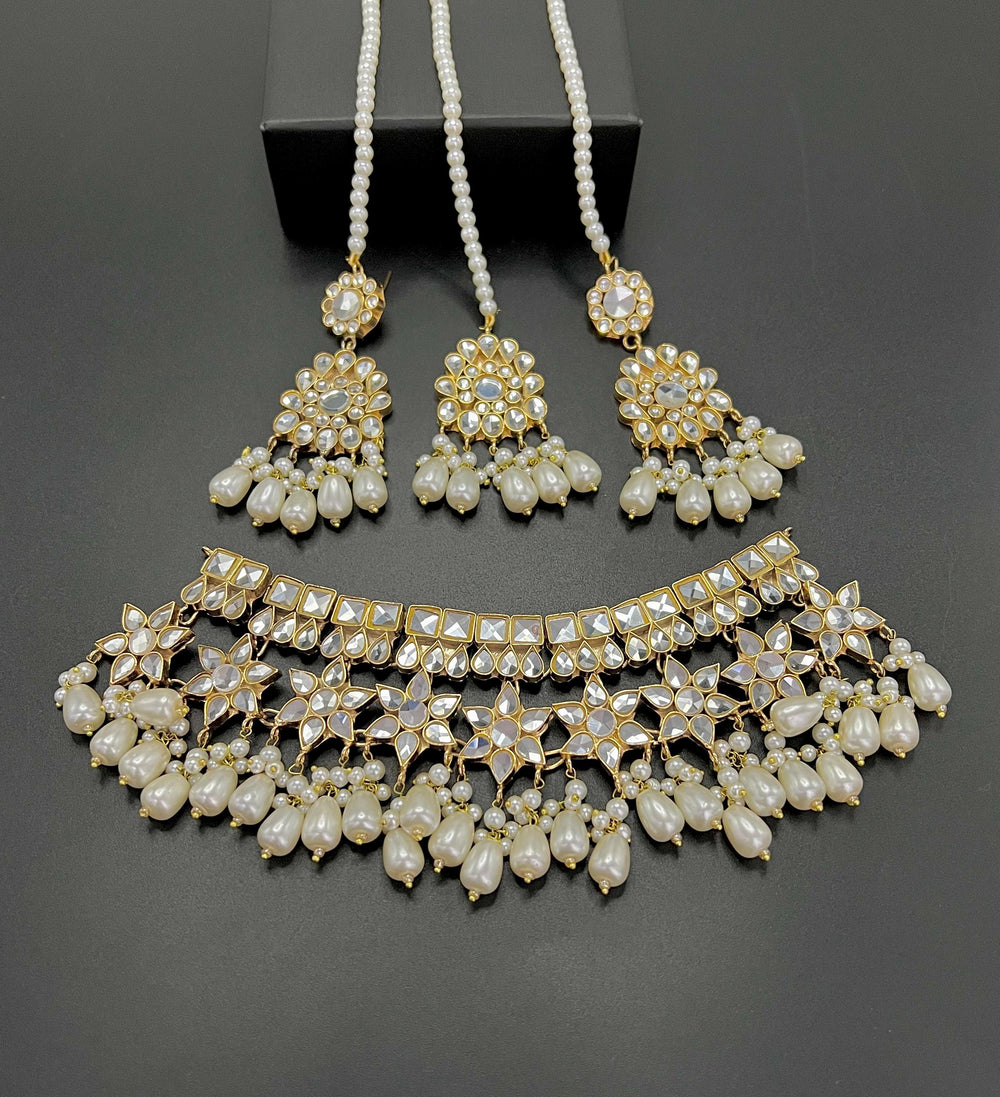 Set Includes: 1 Choker Necklace, 1 Pair of Earrings, and 1 Maang Tikka.